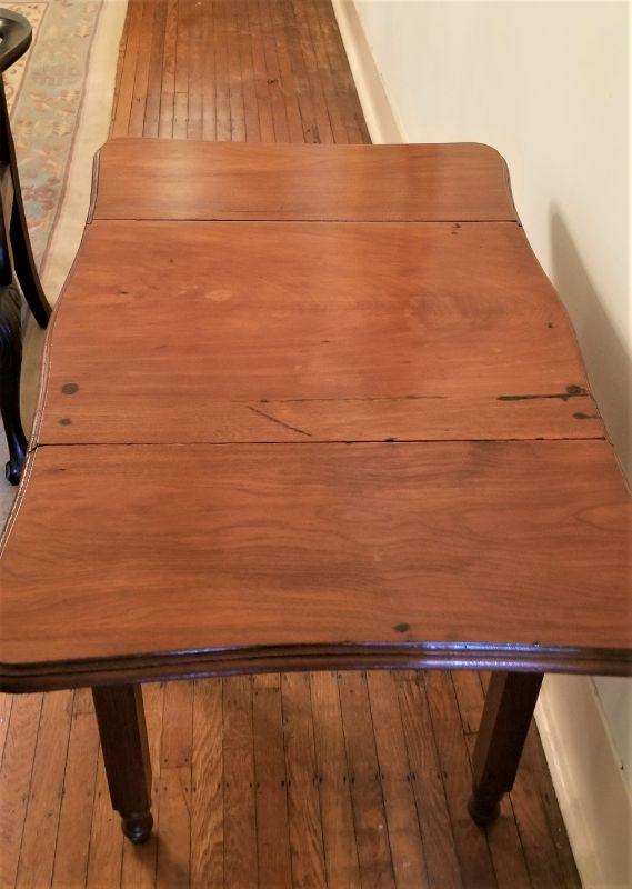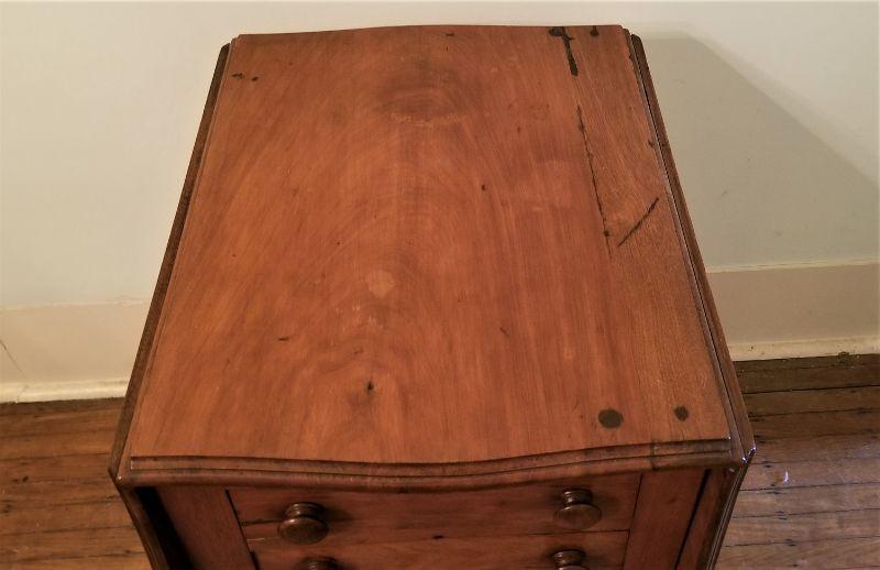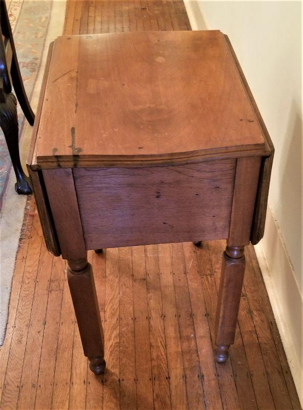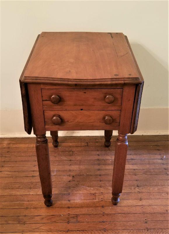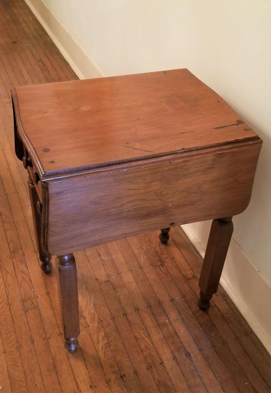 19th Century drop leaf side table with 2 drawers. Antique condition. 29" tall, 23" deep, 3 feet wide when fully extended (as shown). Probably Walnut (heavy).