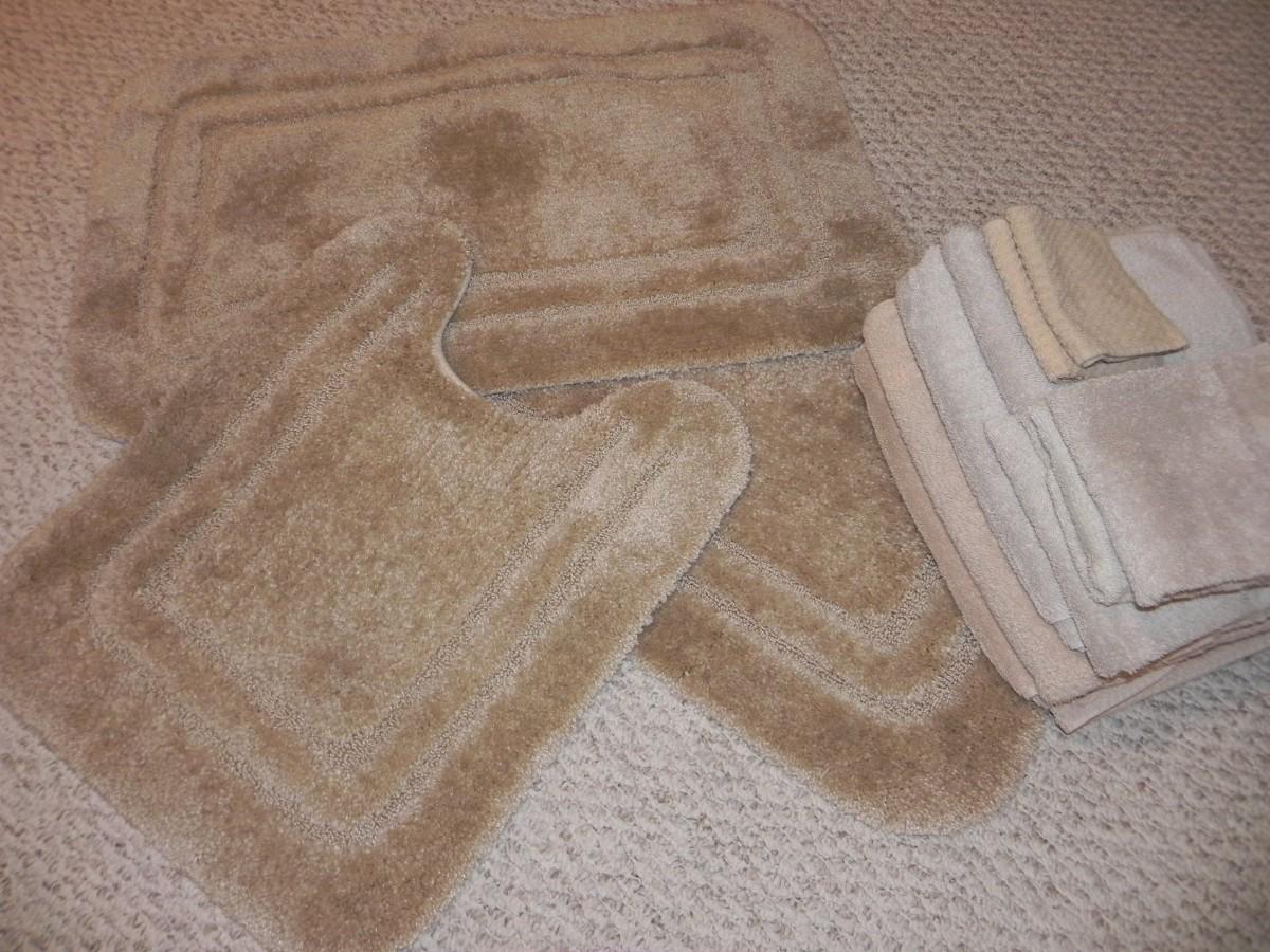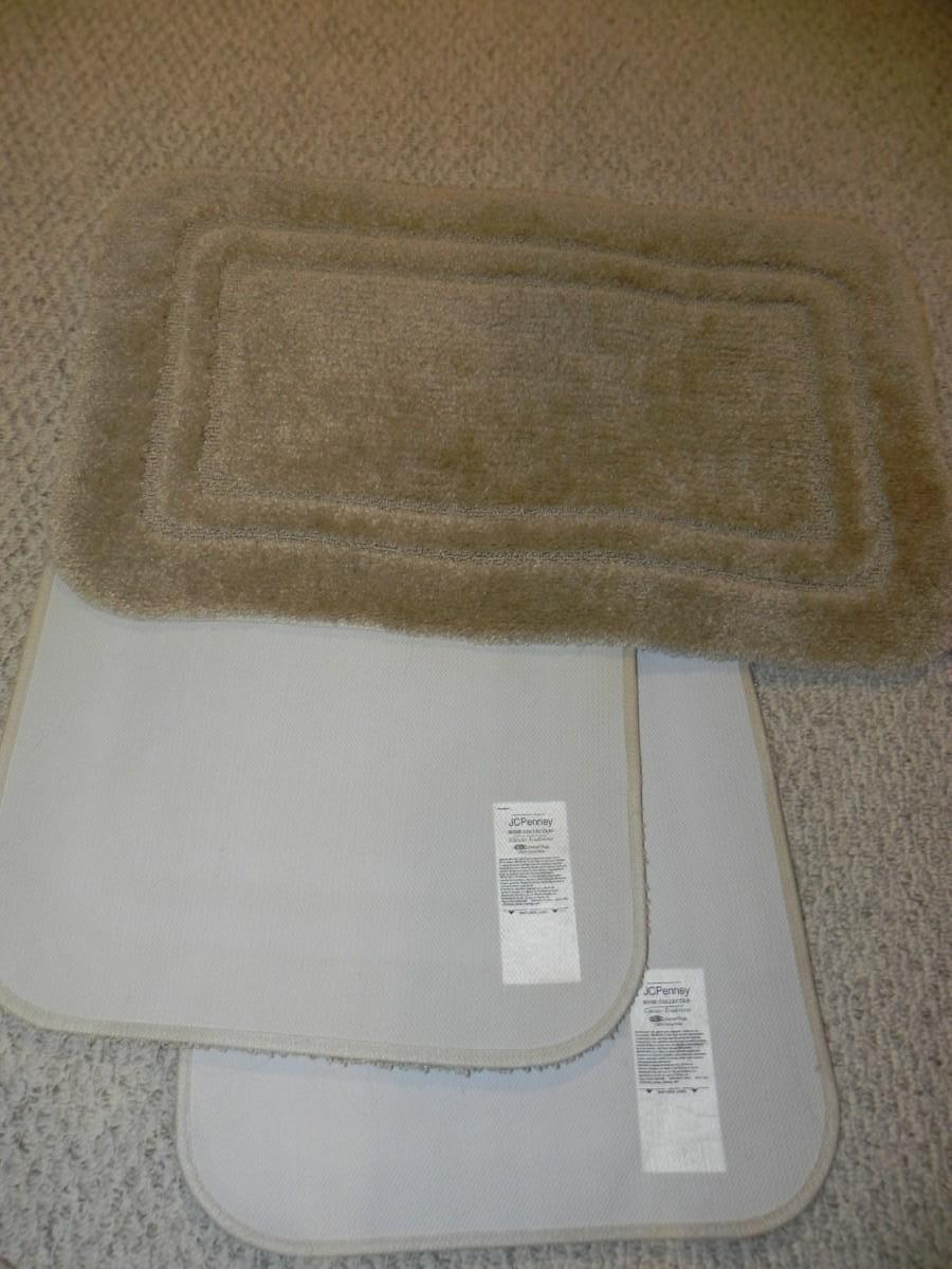 3 PIECE RUG SET 30X22 FROM JC PENNYS AND TAN/BROWN TOWELS