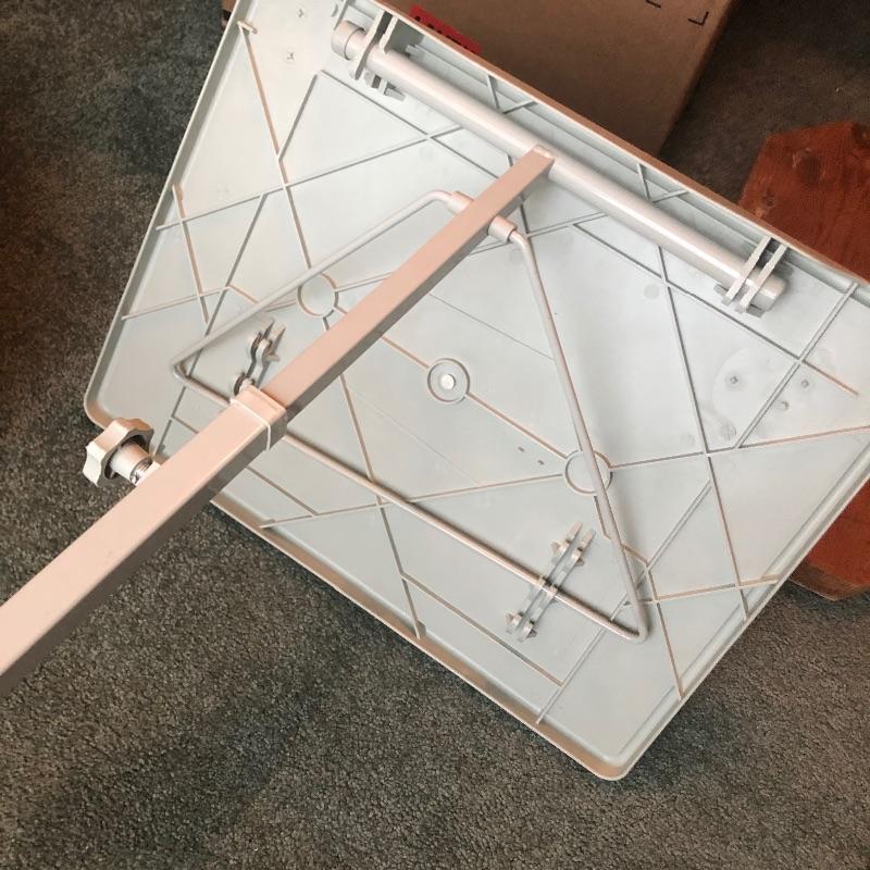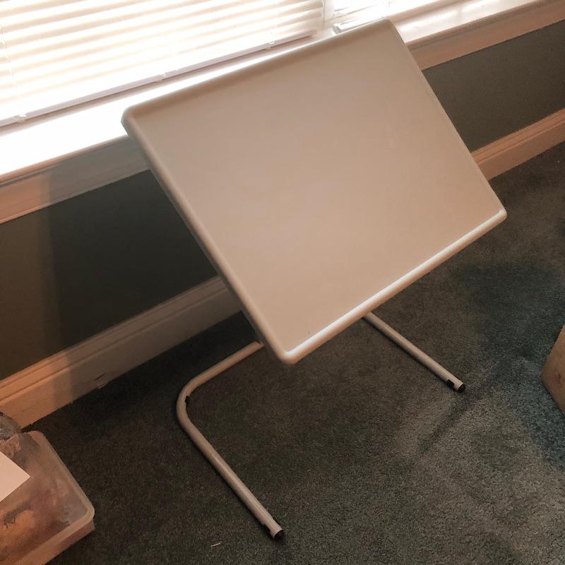 Table measures 15” x 20” and can be anywhere from 19” to 27” in adjustable height.