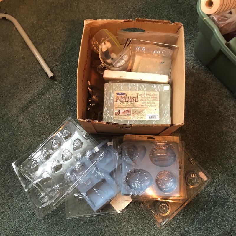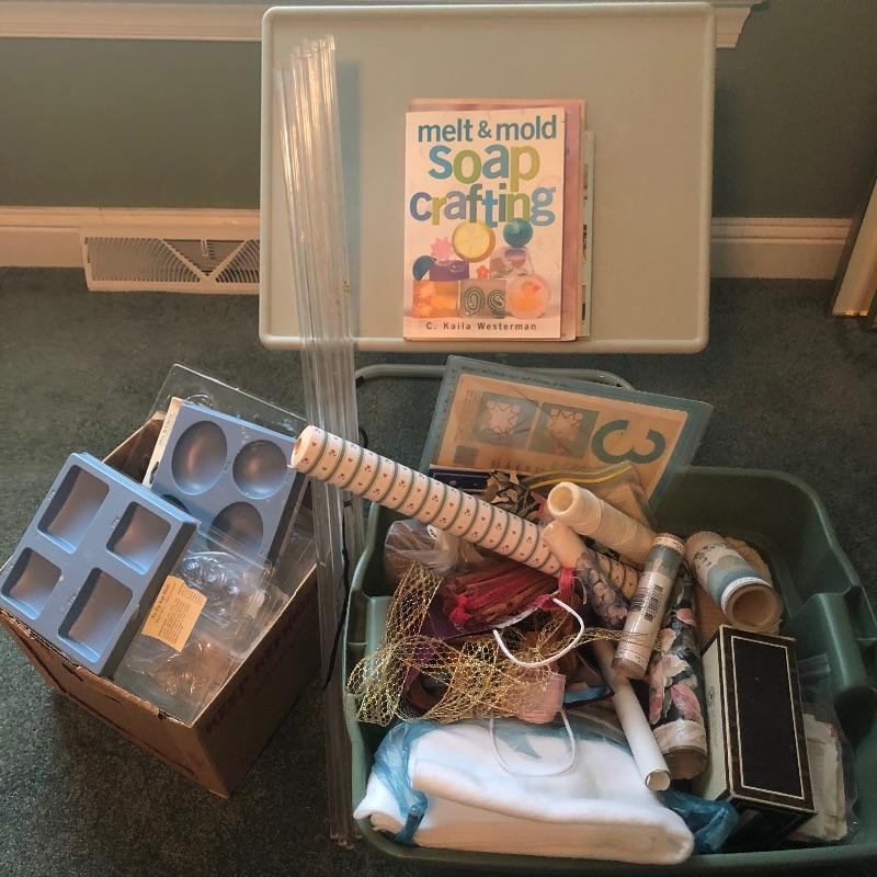Never a better time to take up some new crafts and even become a little more self-sufficient! Make your own soap for example with this assortment of soap making molds, olive oil glycerin blocks, soap recipe book, dyes and more. Also included here is a small crafting table, mannequin, an assortment of fabrics, backing, trim, silk and much, much more and oh not to forget the large bag of corks just waiting to be repurposed.