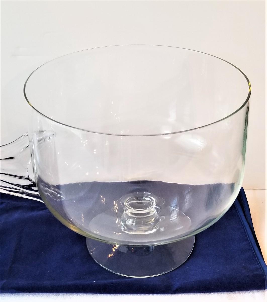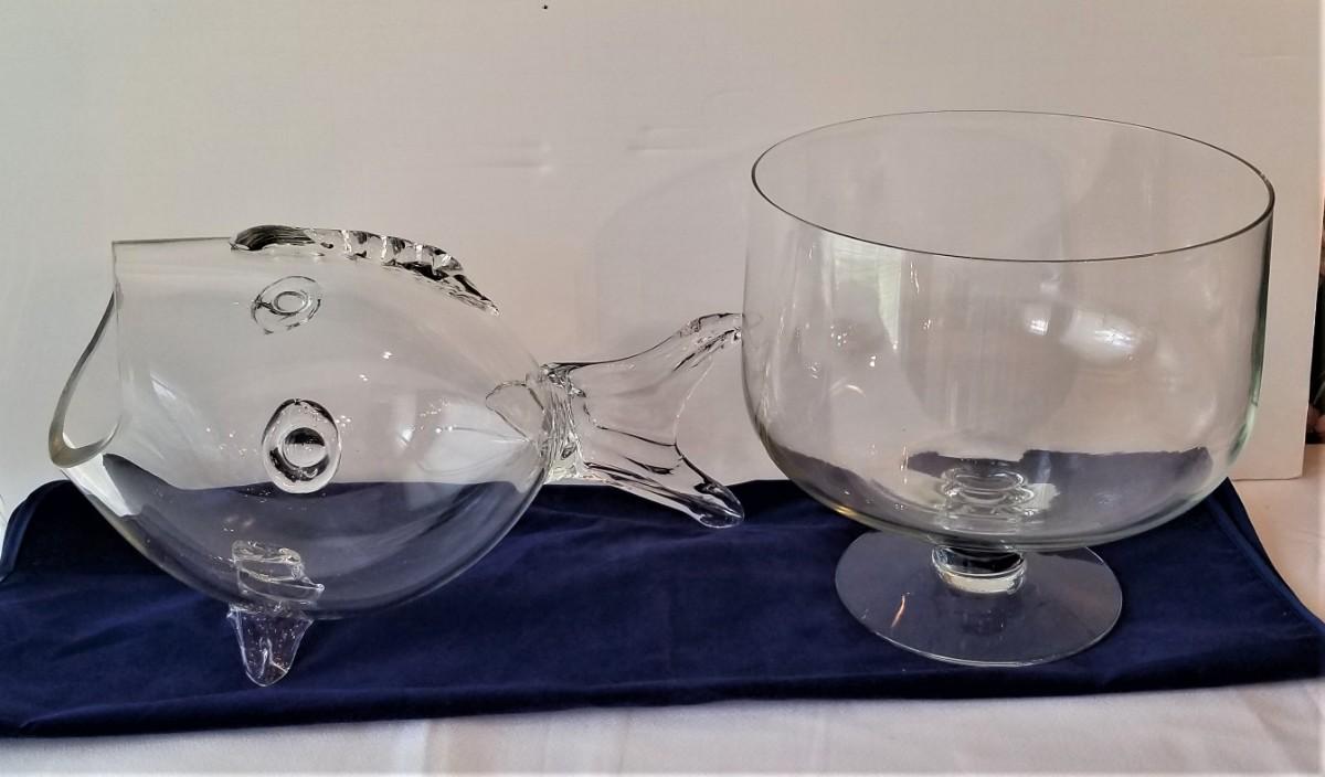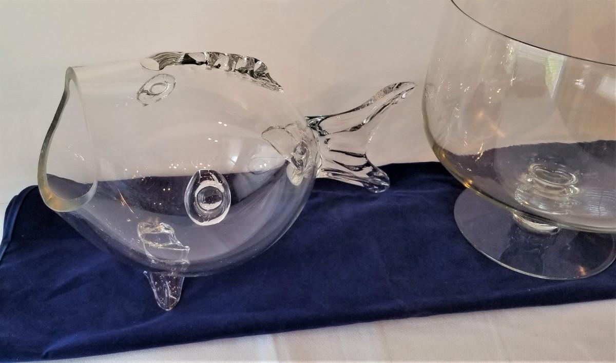 Two versatile pieces of crystal - Trifle Bowl and figural fish Bowl. Both in good condition. Trifle is 9: across and 9" tall, Fish Bowl is 14" long.