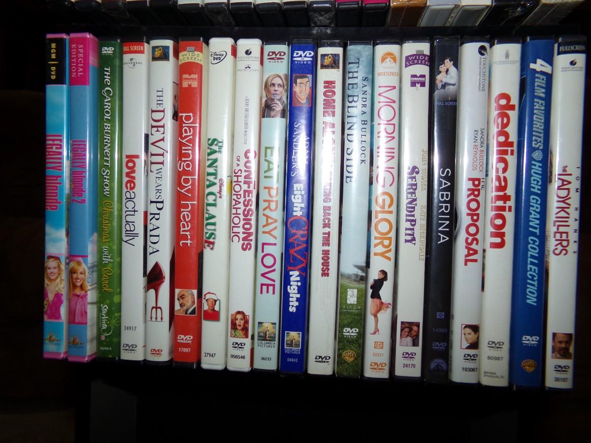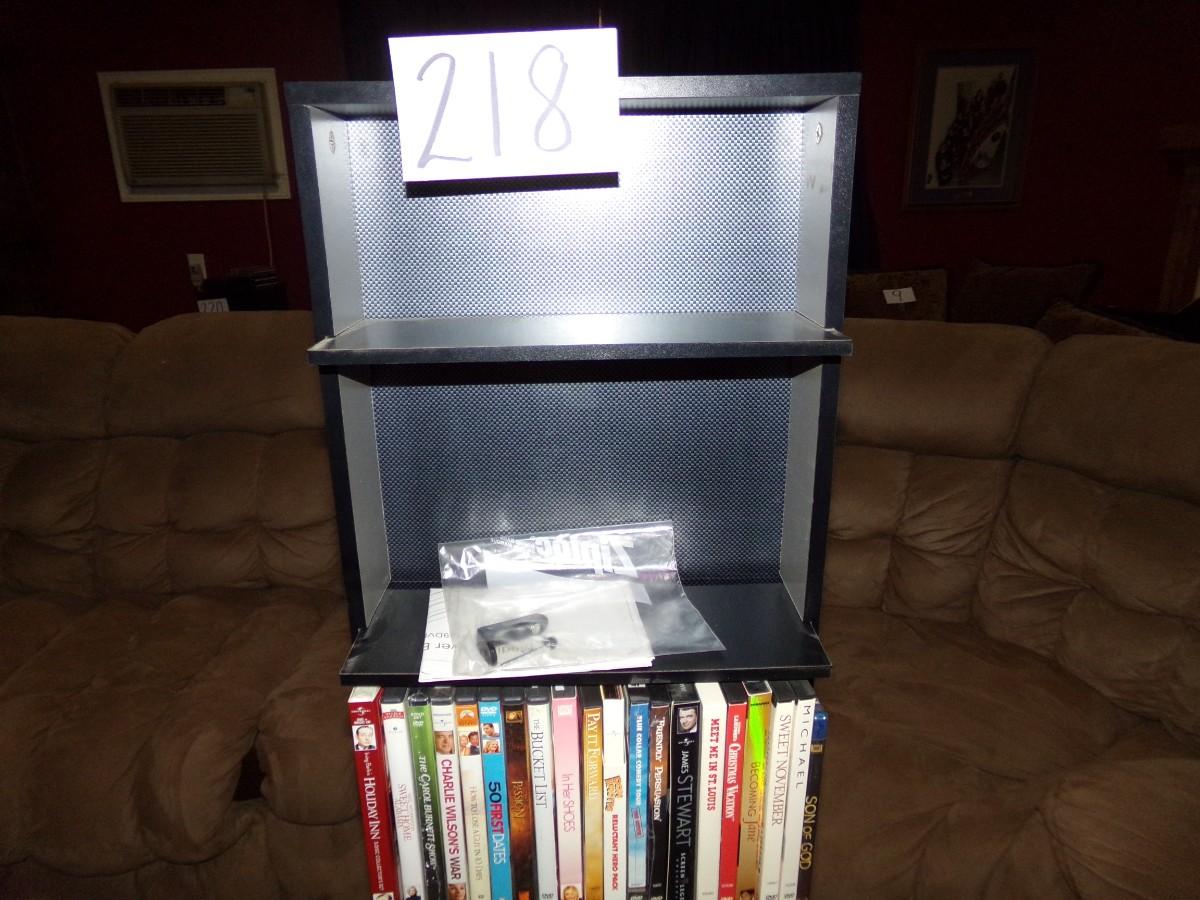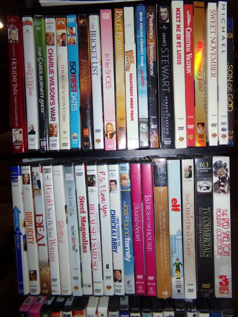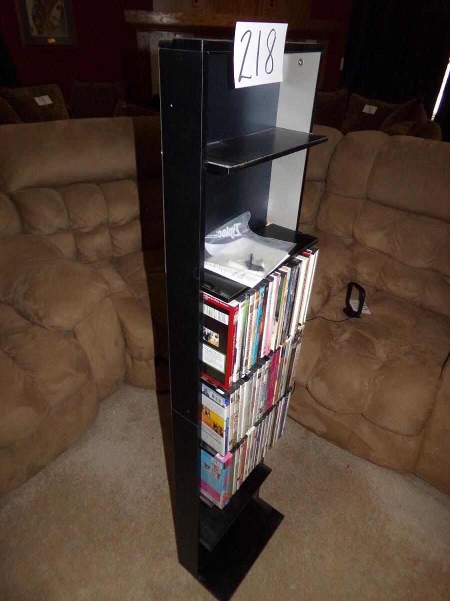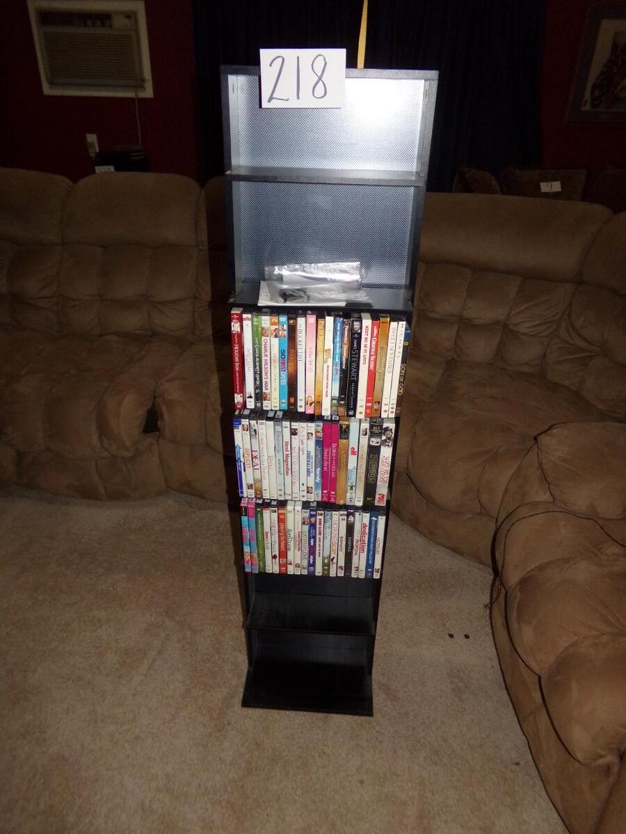 LOT OF DVD'S AND A RACK FOR HOLDING THEM. MOST ARE DRAMA AND COMEDY.