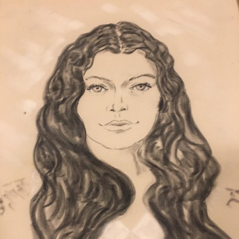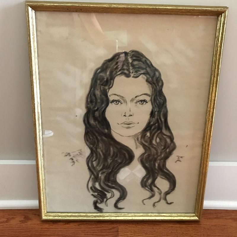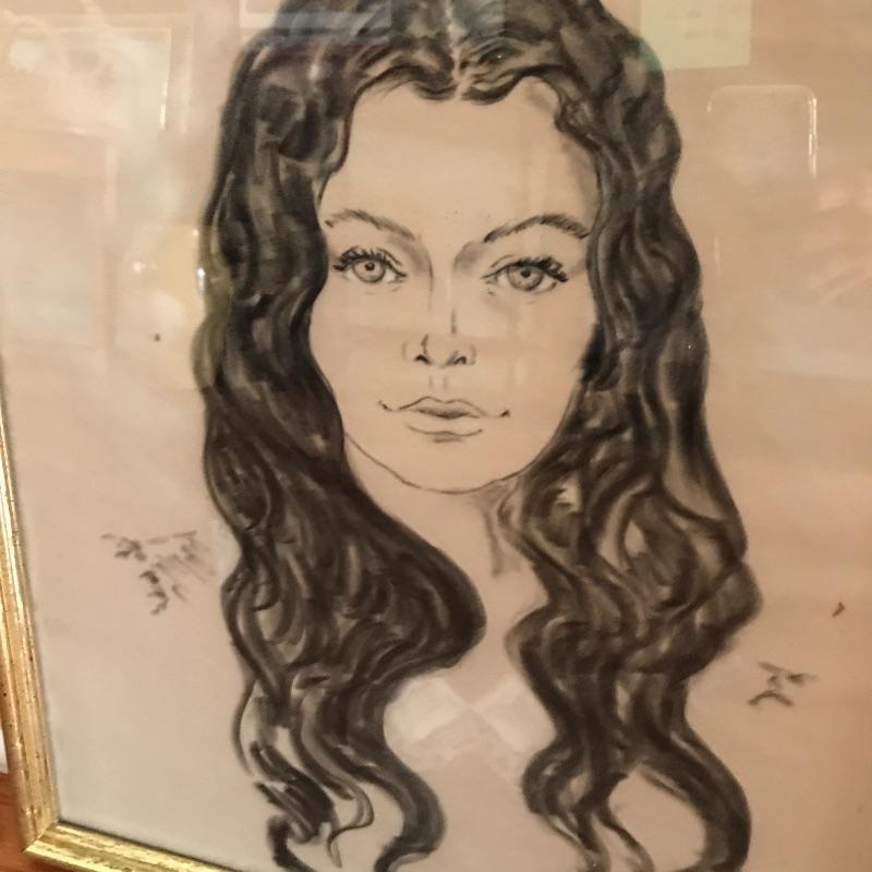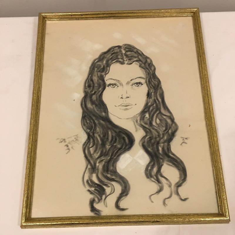 Gorgeous framed portrait of a young woman, looks like charcoal and comes with a nice gold frame. Frame measures 17” x 21”.