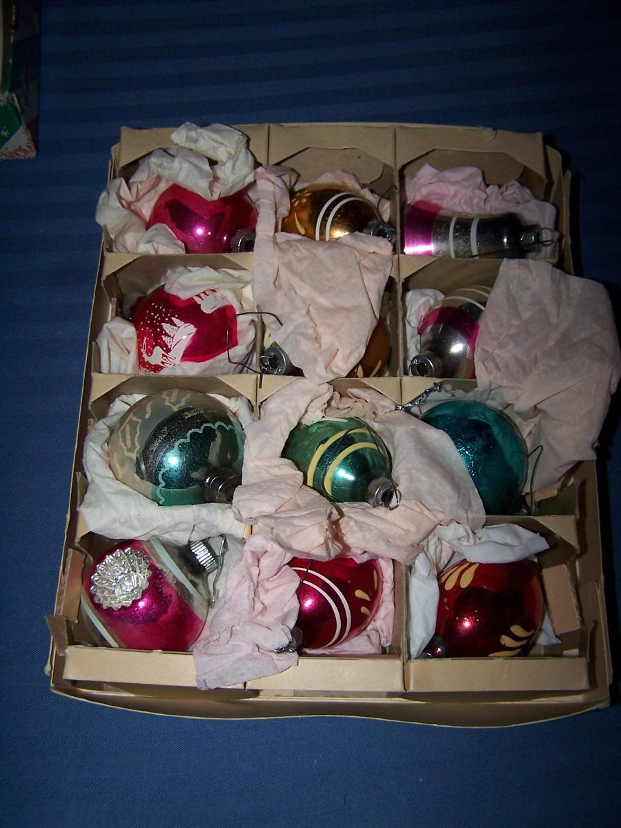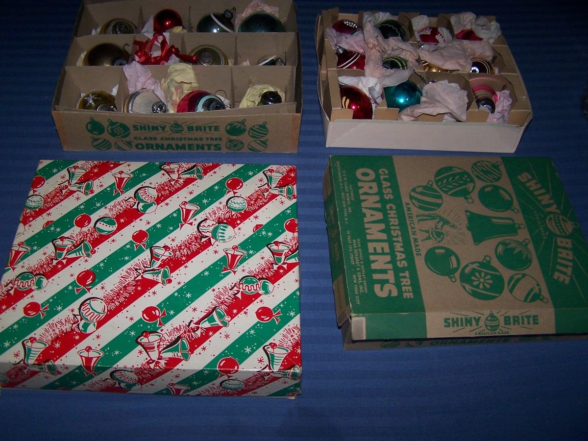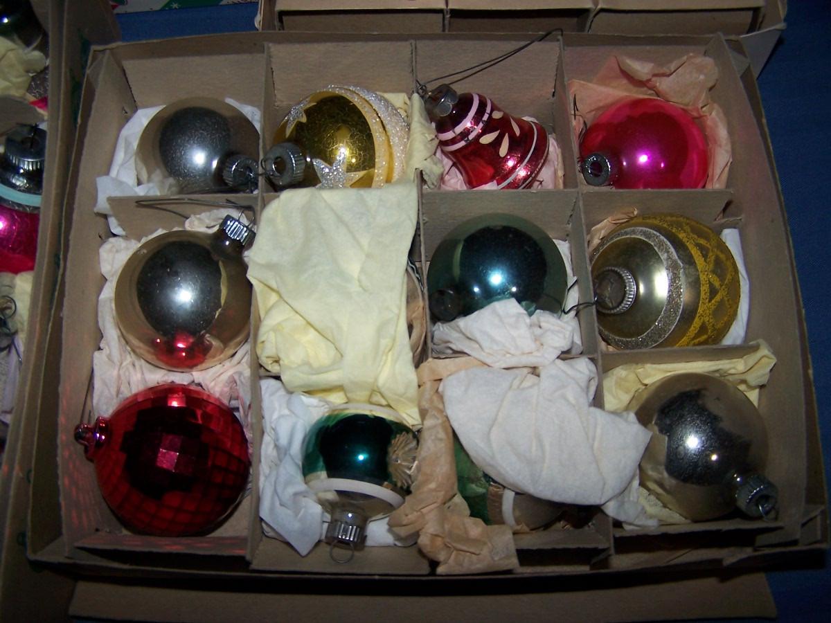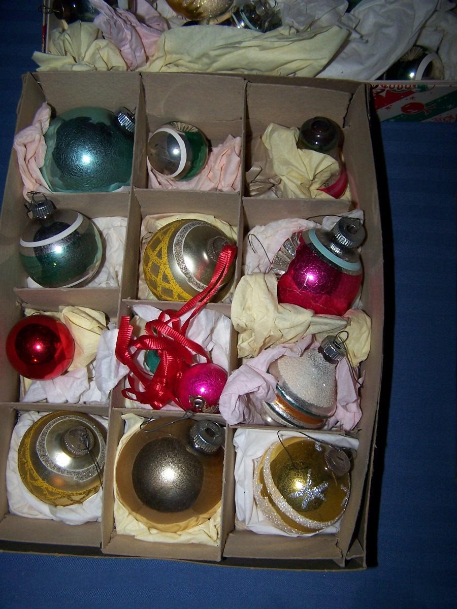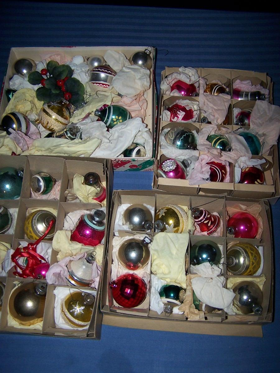 THESE ARE LOVELY VINTAGE GLASS CHRISTMAS ORNAMENTS-4 BOXES.... MISSING SEVERAL METAL TOPS, LIGHT WEAR....