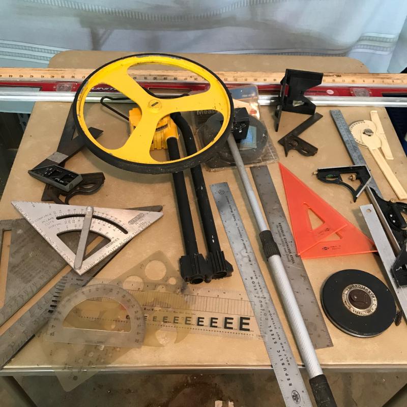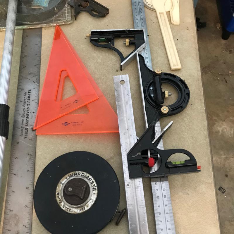 Lot includes several different types of rulers. Also includes two measuring wheels. One is by Stanley.See photos for details of whats in lot. No shipping. Local pick up only.