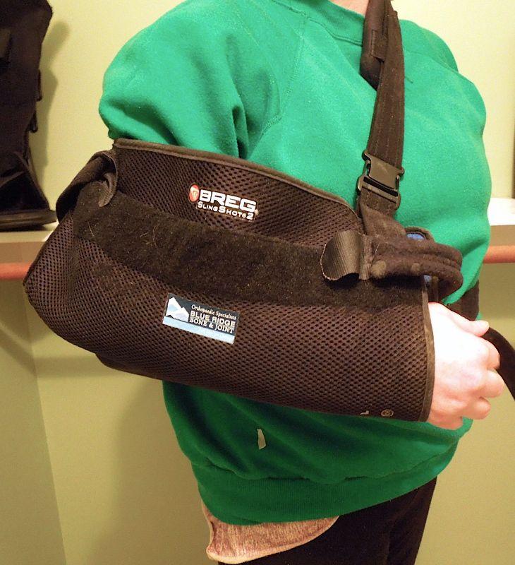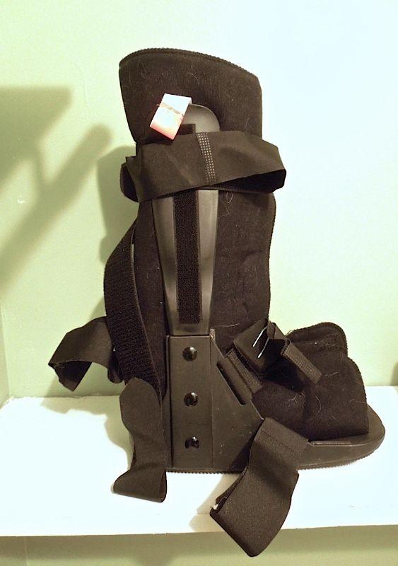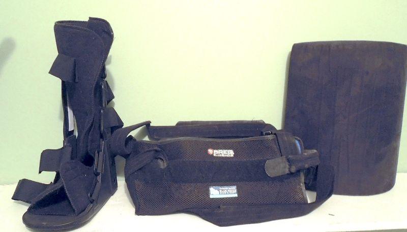 Medium sized support walking boot with velcro straps; Breg Slingshot 2 arm immobilizer; and a contour under knee pillow. all are used and need some cleaning.