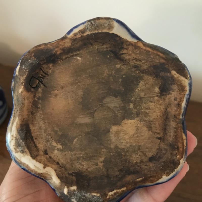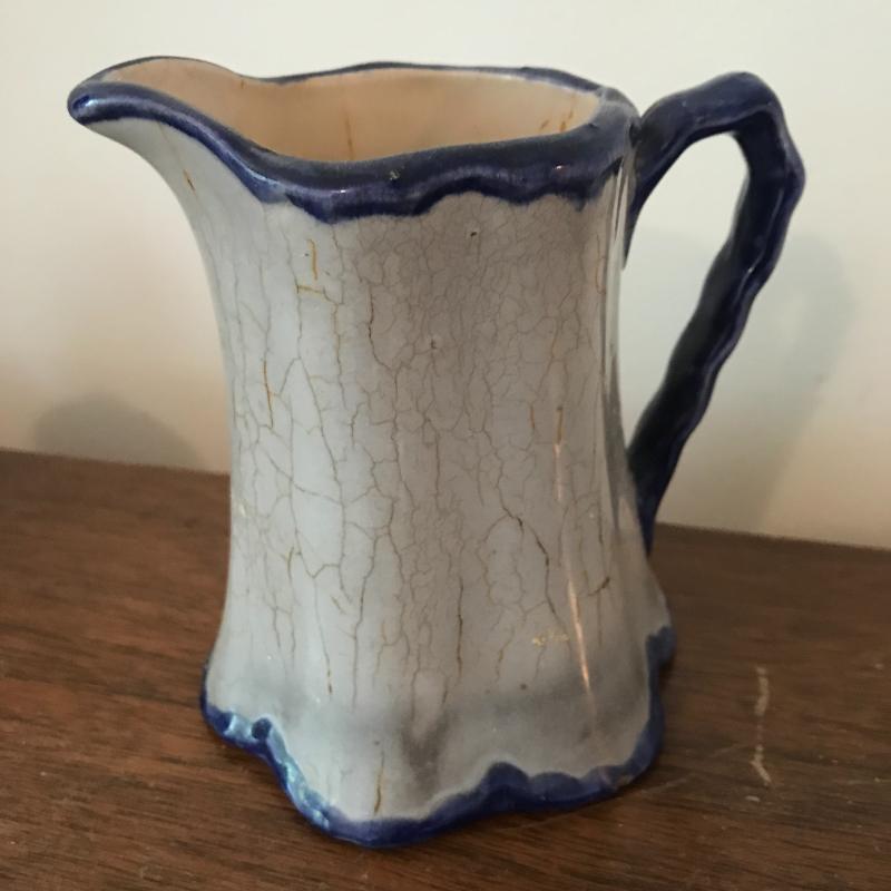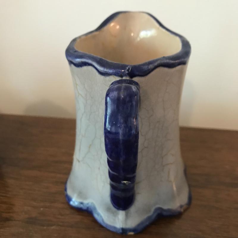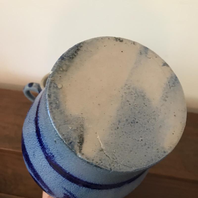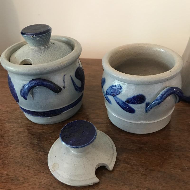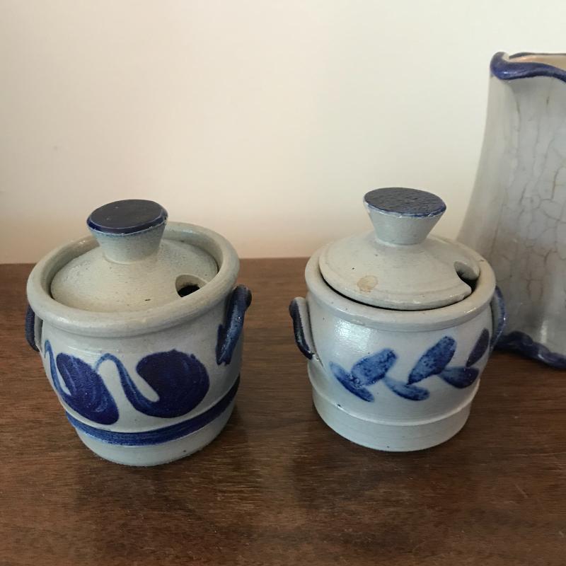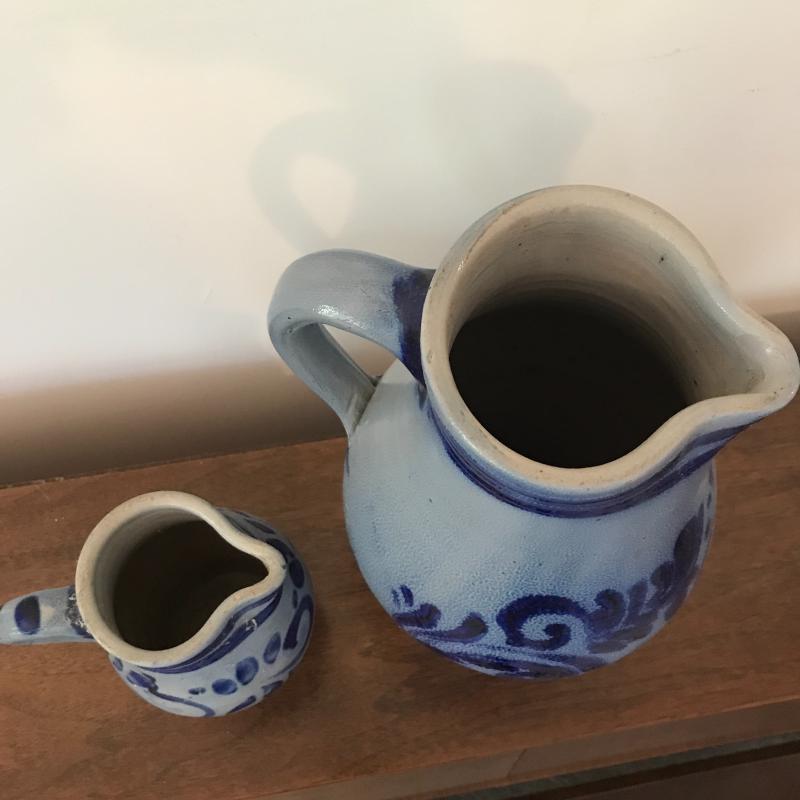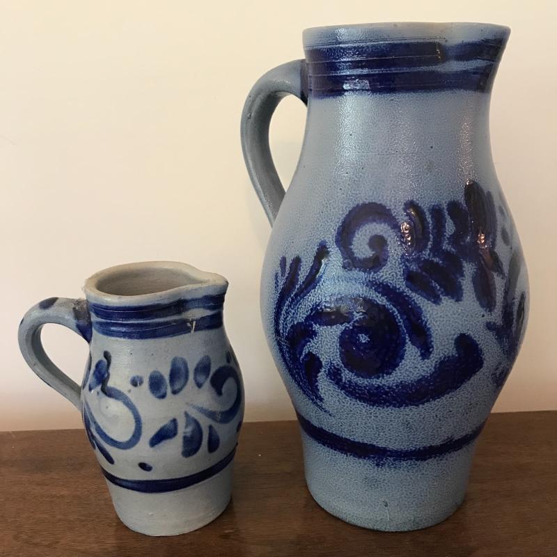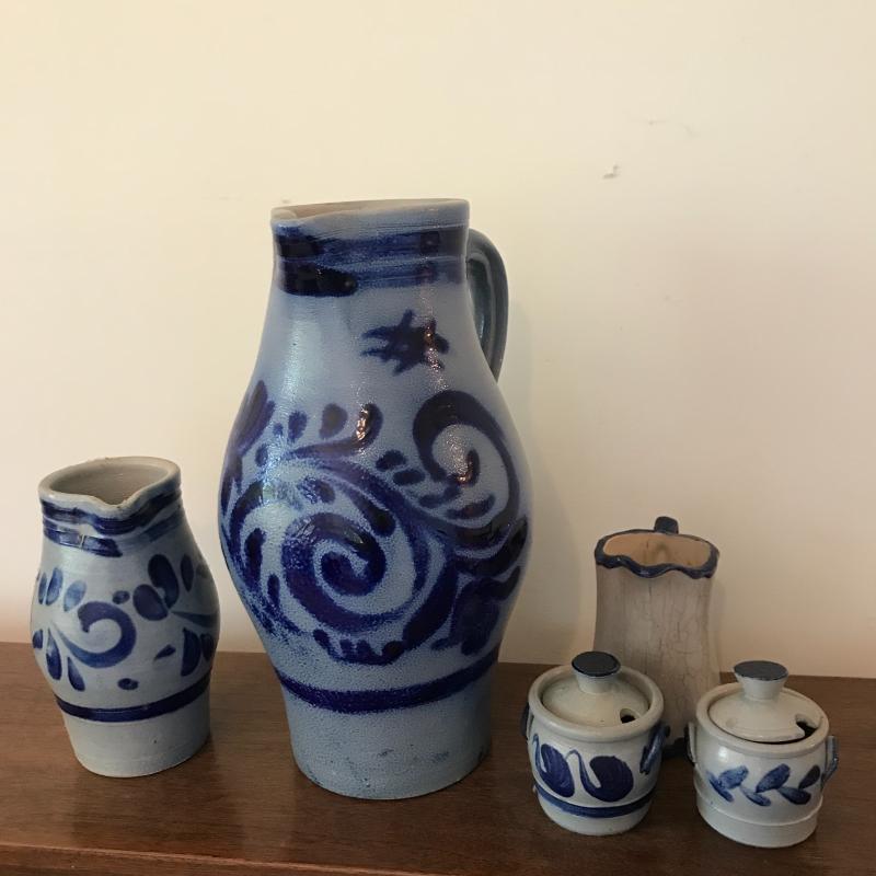 Two stoneware pitchers are Westerwald style salt glaze in grey and blue. Also includes two small stoneware lidded crocks and ceramic mug. Shipping available