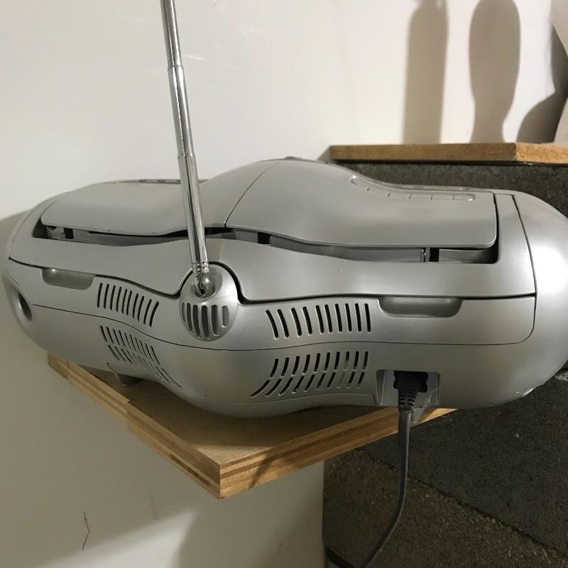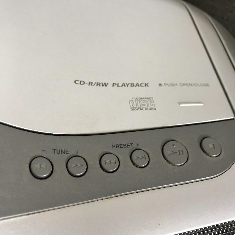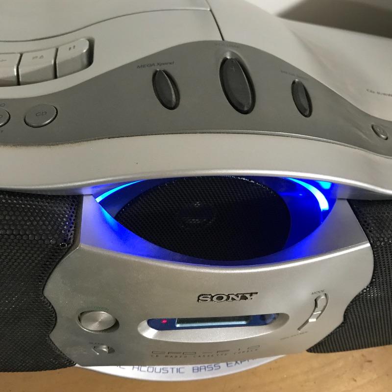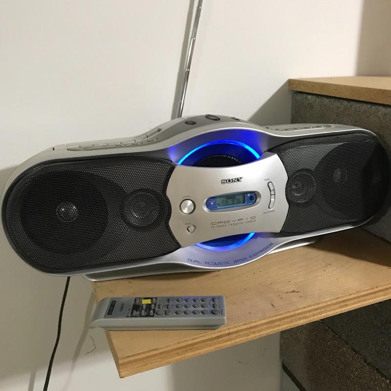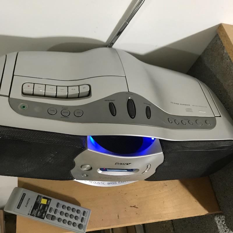 Sony boom box CFD-F10 CD/Radio/Cassette-Corder. Face boasts “Dual Acoustic Bass Expansion”. Radio works great with clear sound. Working Sony remote included. No shipping.