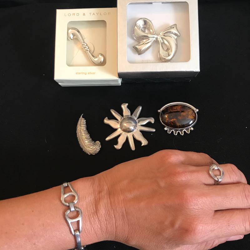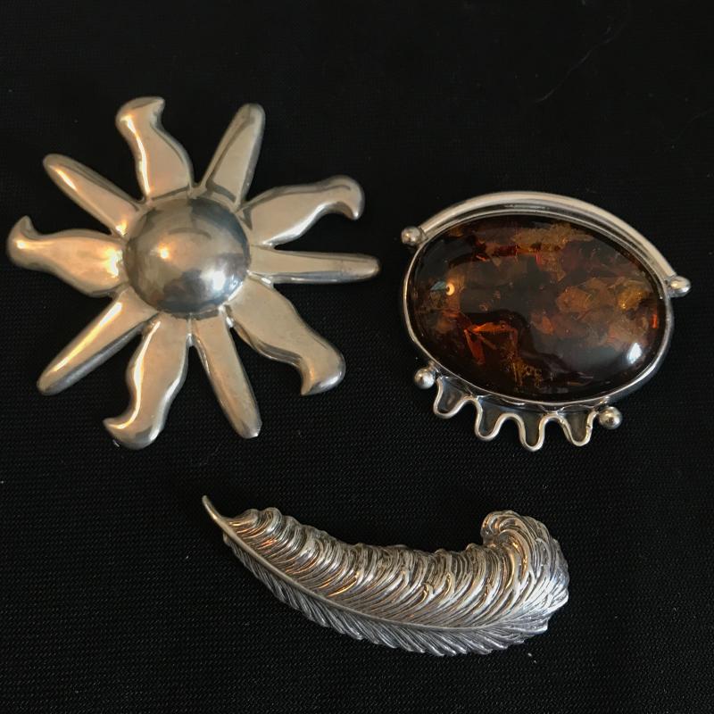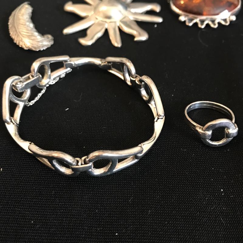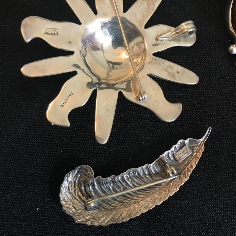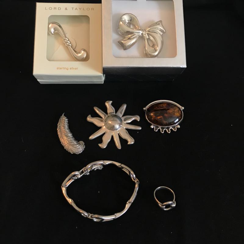 Nice sterling pieces that are either marked “sterling” or “925”. One pin seems to be silver and amber (not verified) and the sun pin can also be used as a pendant. Lot also includes a nice ring and bracelet set. Come to the preview to inspect! Shipping or local pick up available