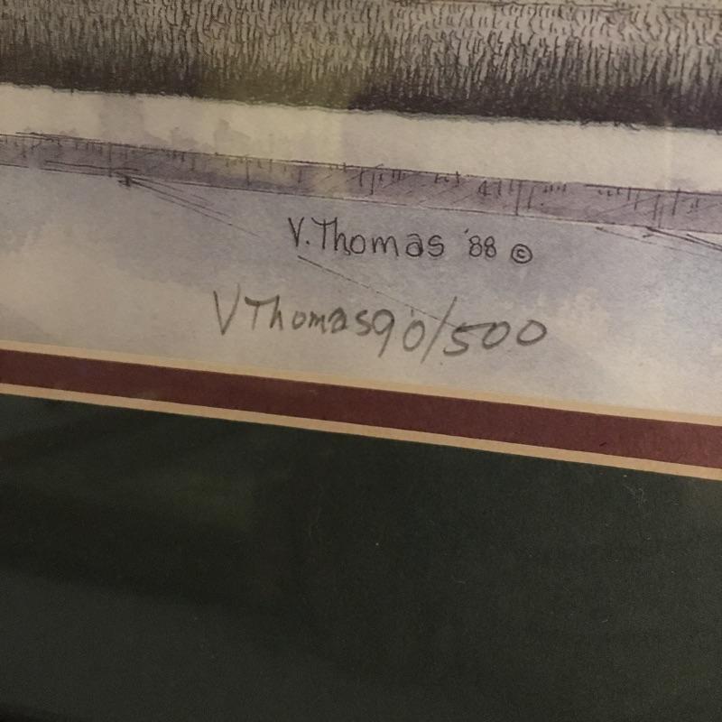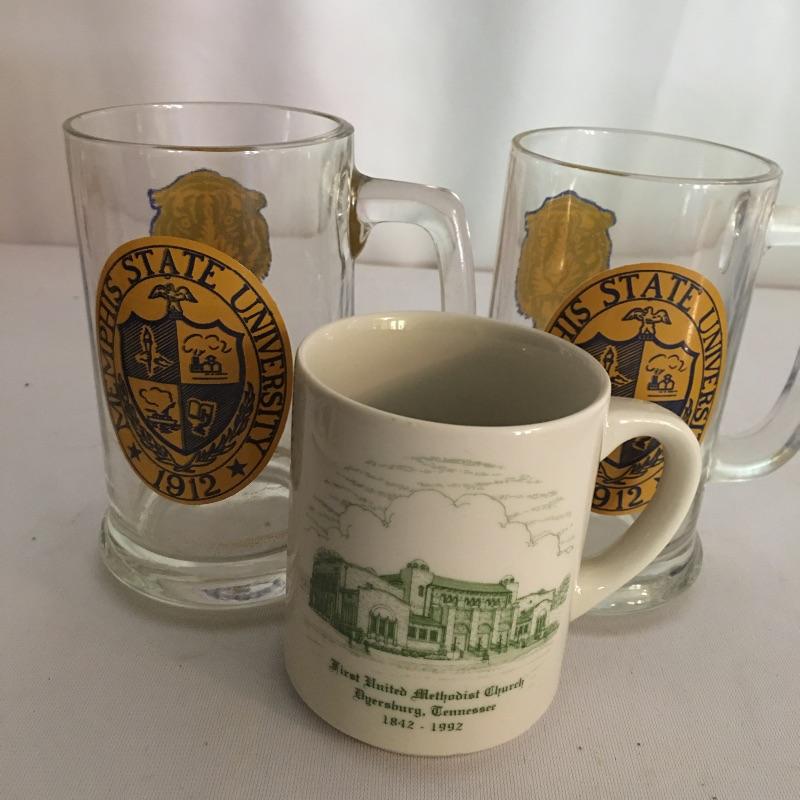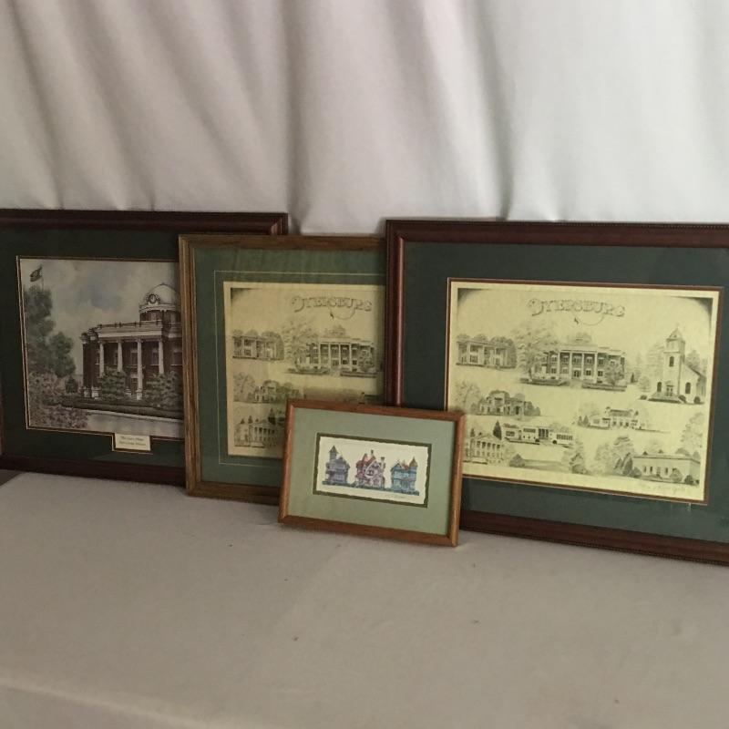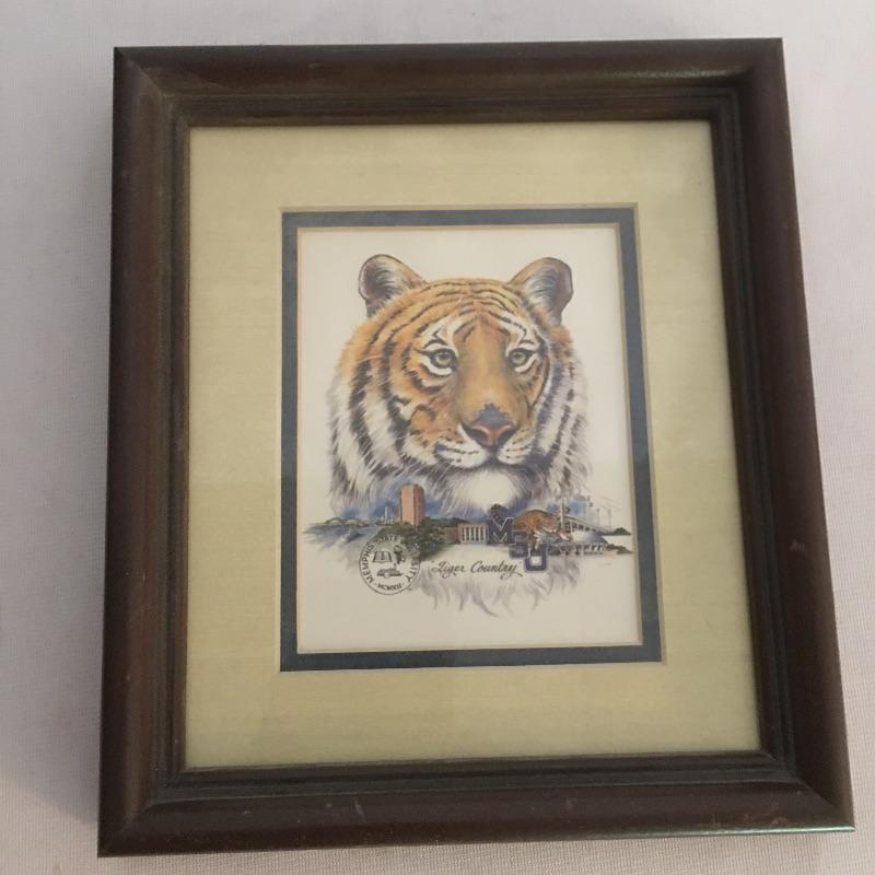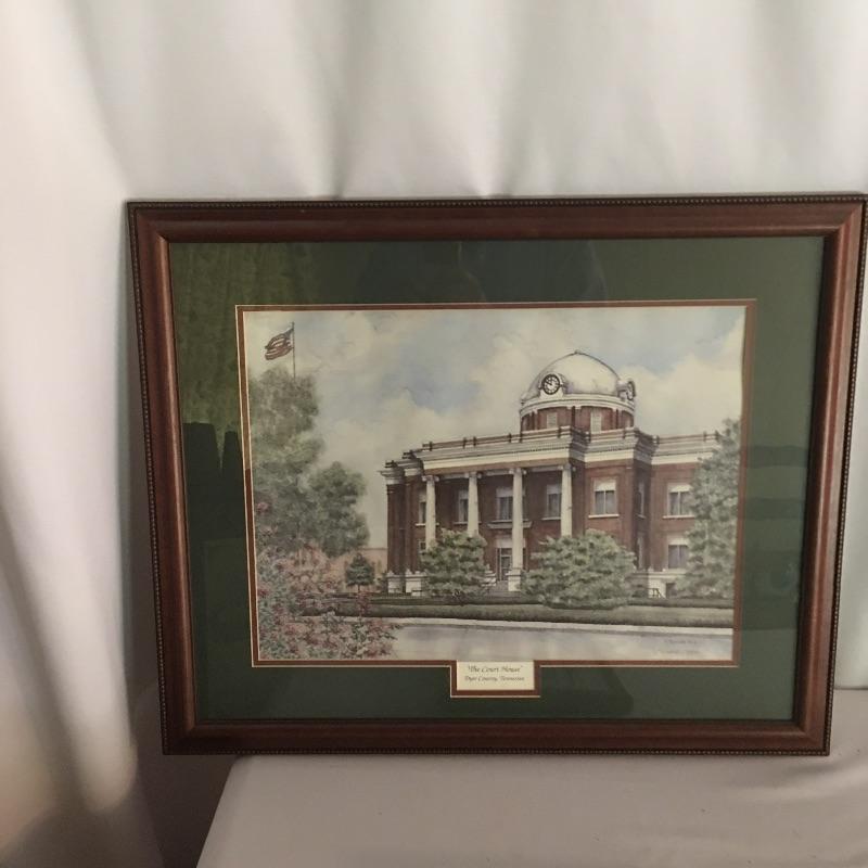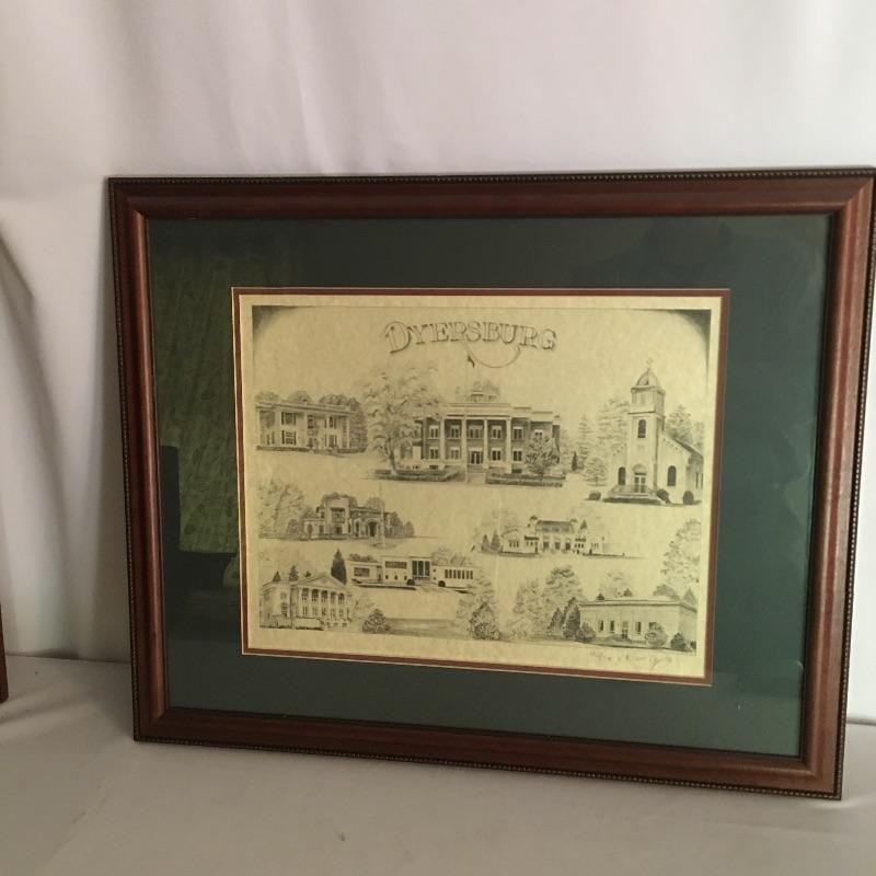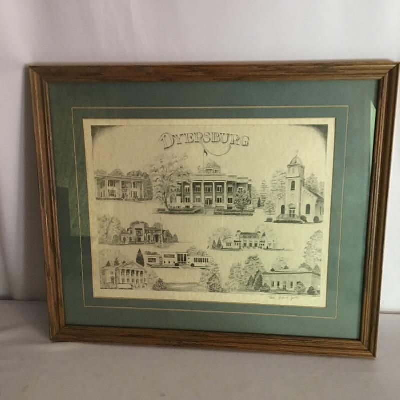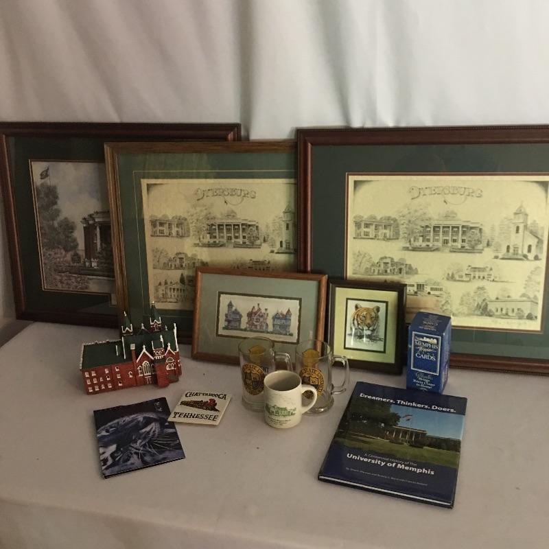 Tennessee array includes five pieces of art-three framed, signed and numbered prints, one framed and signed print and one framed print. Also Memphis State mugs, Pulaski 1st Methodist church replica, Memphis trivia cards and more. All you folks from the great state of Tennessee will love this nice collection. Largest frame measures 21” x26”.