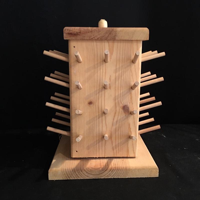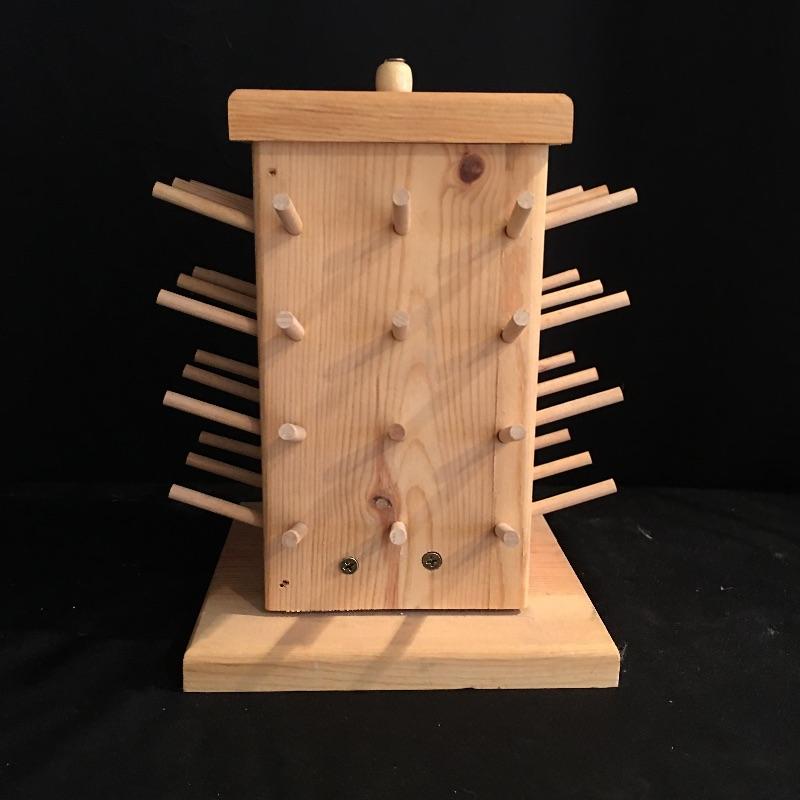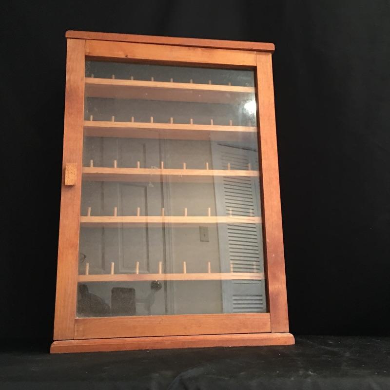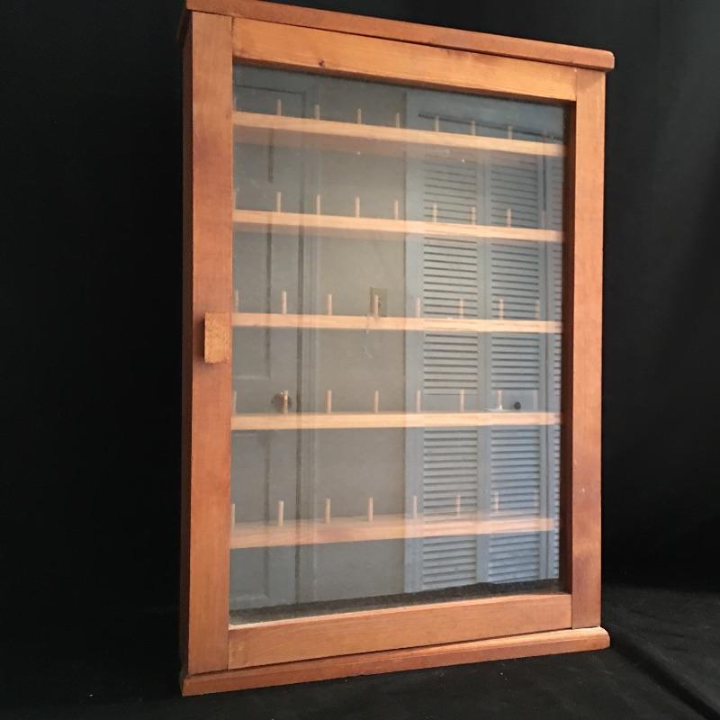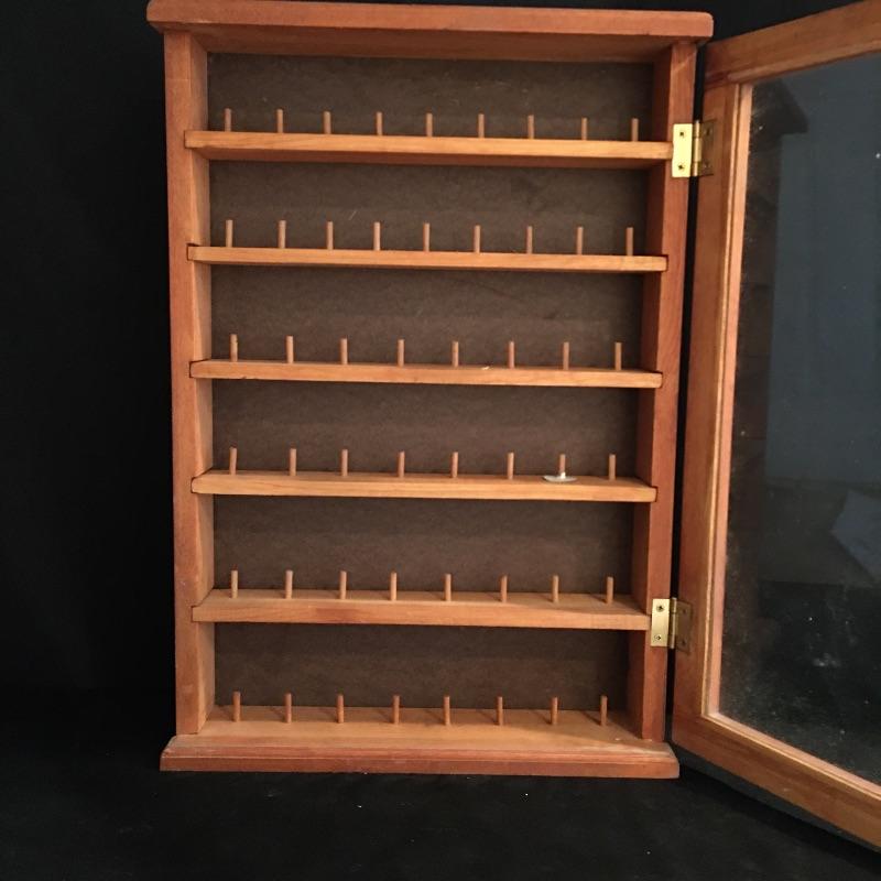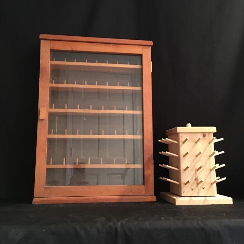 Wooden cabinet with glass door and a space for fifty four spools and the organizer has room for fourth eight spools. What a nice way to get organized! Shipping available.