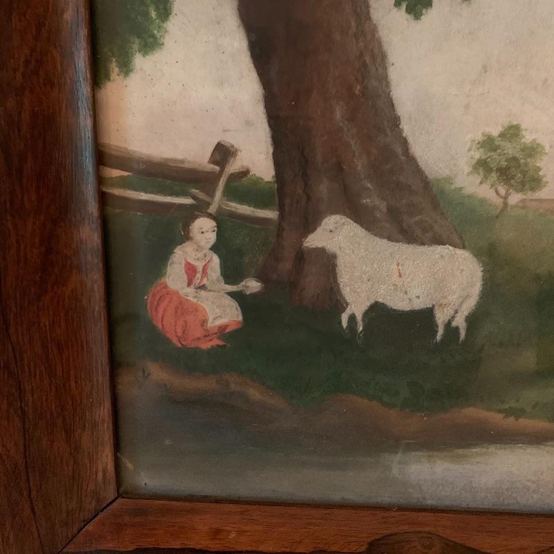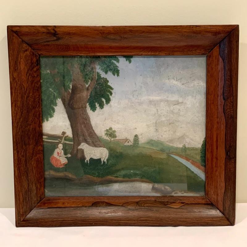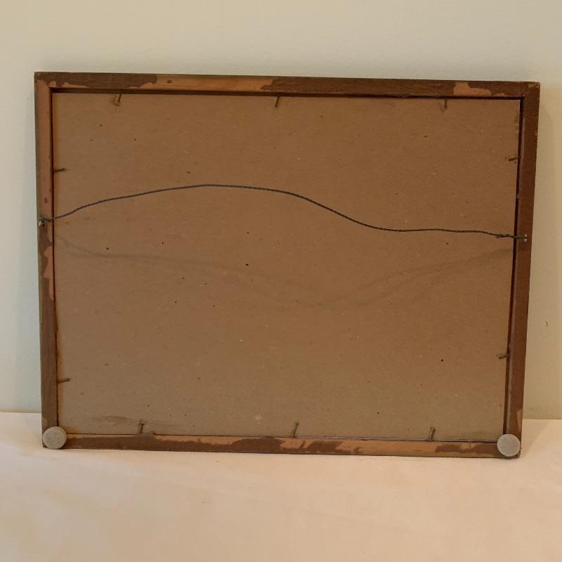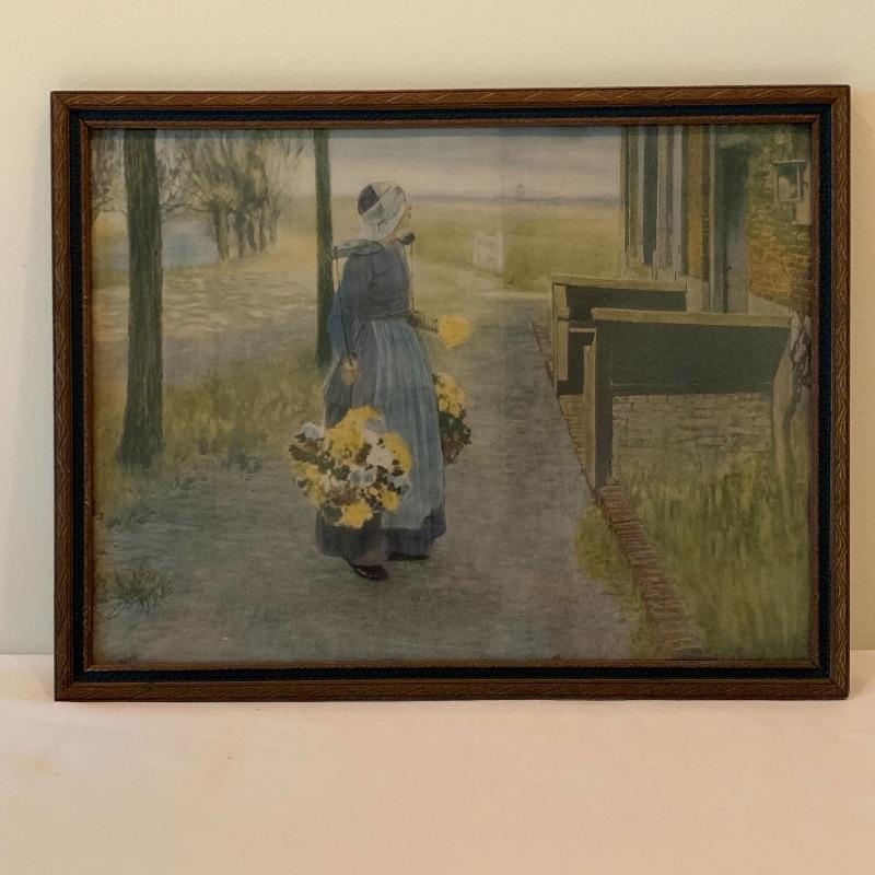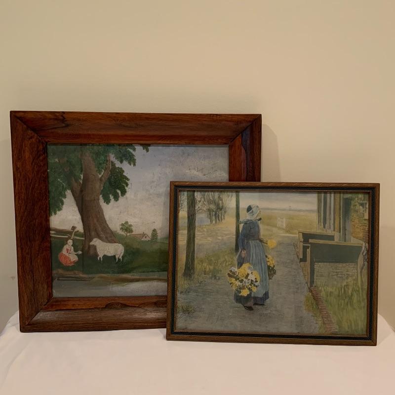 In this lot there are two framed pieces of artwork. One piece is a painting of a girl and a lamb under a tree in the countryside. A handwritten note was found in the house that describes this as a primitive oil painting that was purchased from a dealer in 1977. It comes in a beautiful wooden frame that measures 20.5” x 18.5”. There is a wire attached to the back to hang the frame and a piece of glass protects the artwork. The other piece is a print of a woman carrying flowers, looking up at a building she is walking by. It is in a wooden frame with lovely carved details around the border. The frame measures 13.5” x 17.5”. It has a wire attached to the back to hang the frame on the wall and the print is protected by a piece of glass. Shipping available.