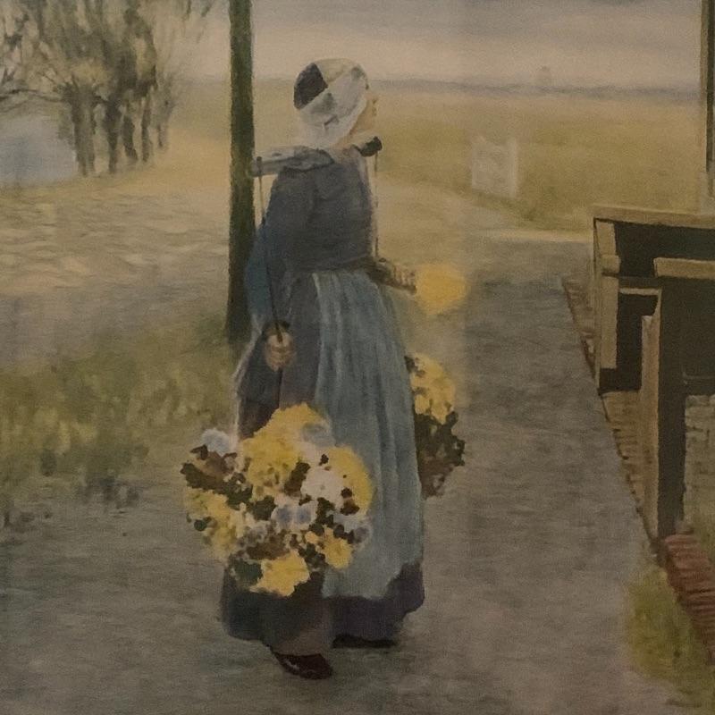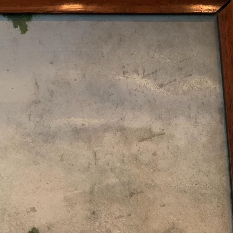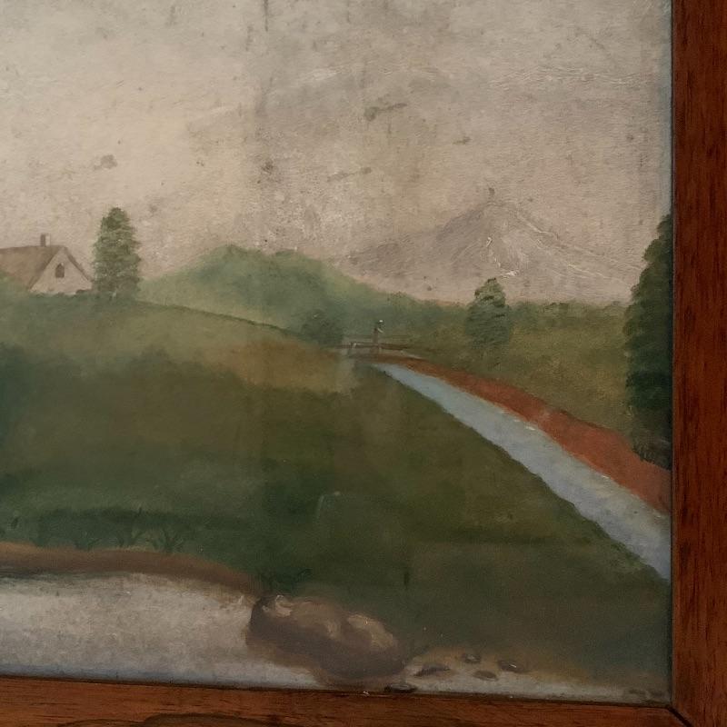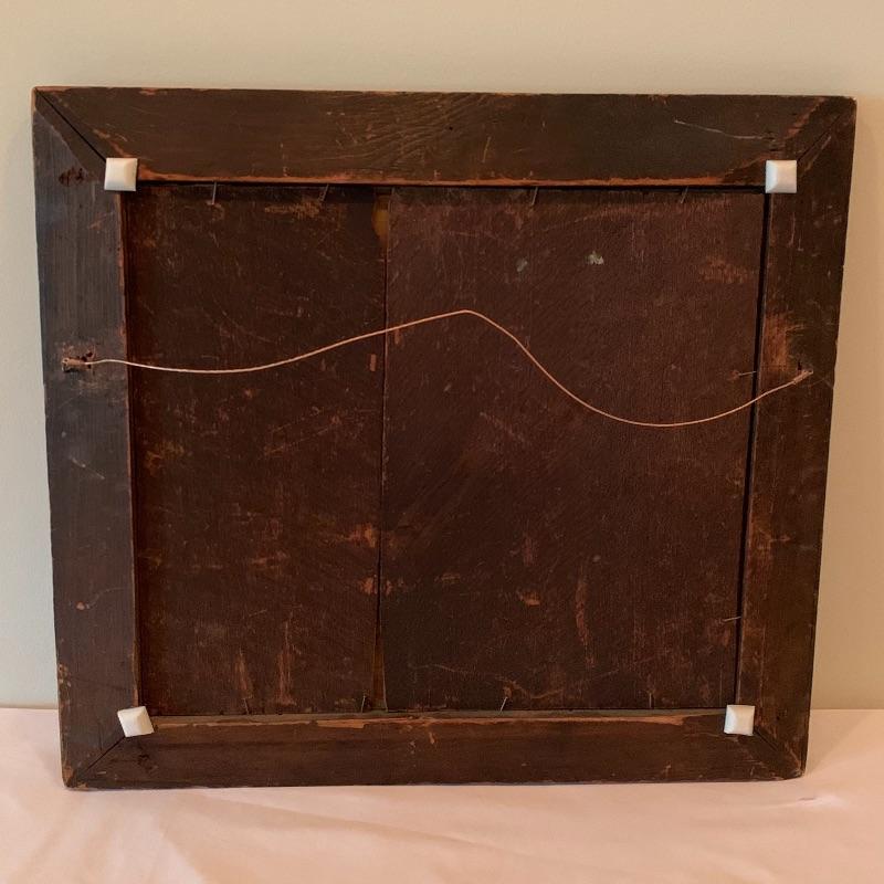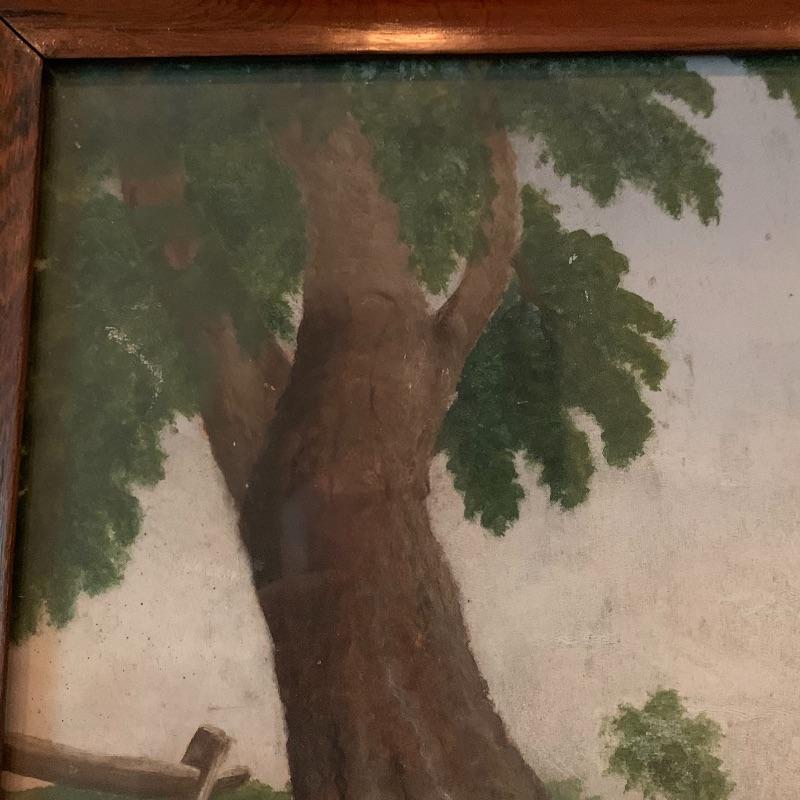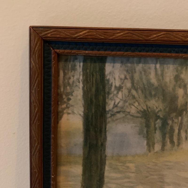 In this lot there are two framed pieces of artwork. One piece is a painting of a girl and a lamb under a tree in the countryside. A handwritten note was found in the house that describes this as a primitive oil painting that was purchased from a dealer in 1977. It comes in a beautiful wooden frame that measures 20.5” x 18.5”. There is a wire attached to the back to hang the frame and a piece of glass protects the artwork. The other piece is a print of a woman carrying flowers, looking up at a building she is walking by. It is in a wooden frame with lovely carved details around the border. The frame measures 13.5” x 17.5”. It has a wire attached to the back to hang the frame on the wall and the print is protected by a piece of glass. Shipping available.