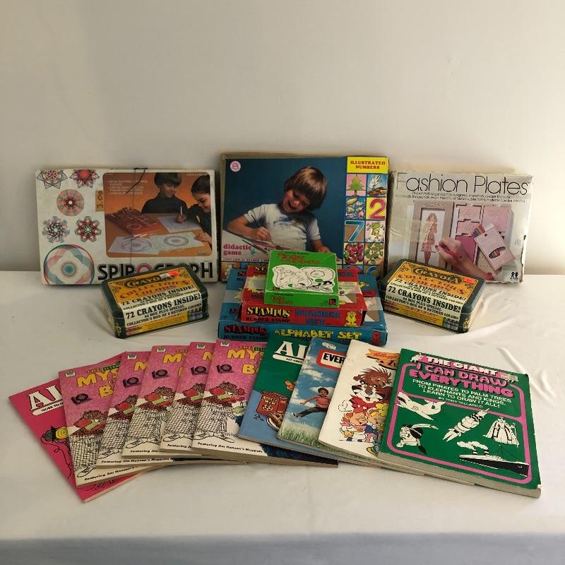 Bring your child’s creativity out with this array of artistic games. Lot includes Spirograph, Fashion Plates, two boxes of 72 crayons, alphabet and number stamps, finger puppets and more stamps.