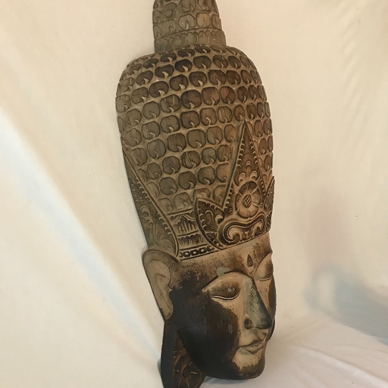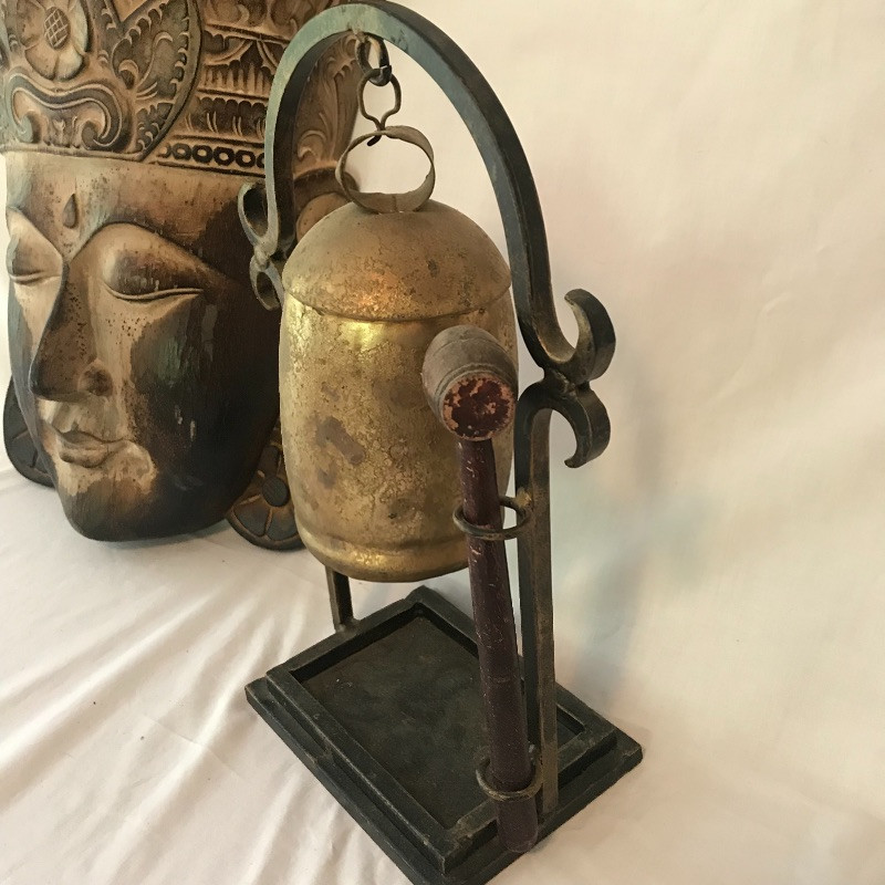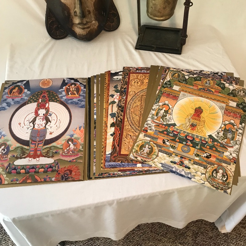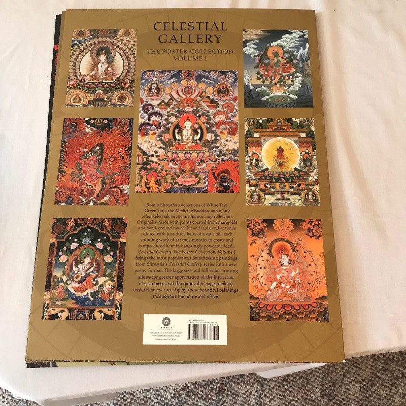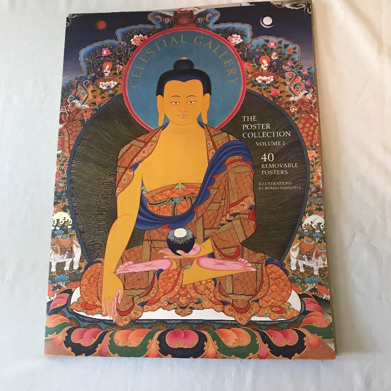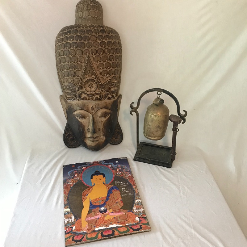 Large wooden face wall hanging that measures 27” x12” x3. bell on stand is metal and wood. The Celestial posters, Volume I are all there and very colorful. Actually 20 pieces with images on both sides by Romio Shrestha. A glossy thick paper that will withstand for years to come. Posters measure 12” x16”Local pick up only.