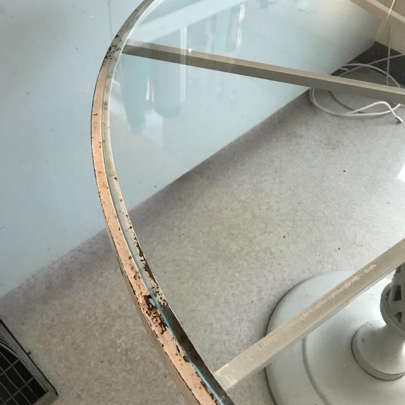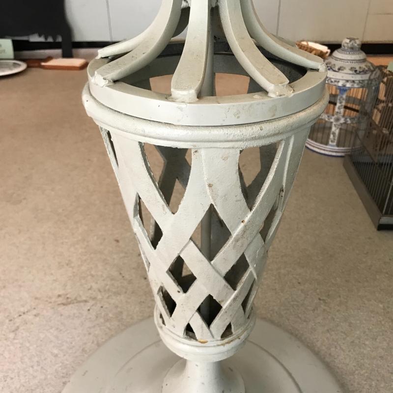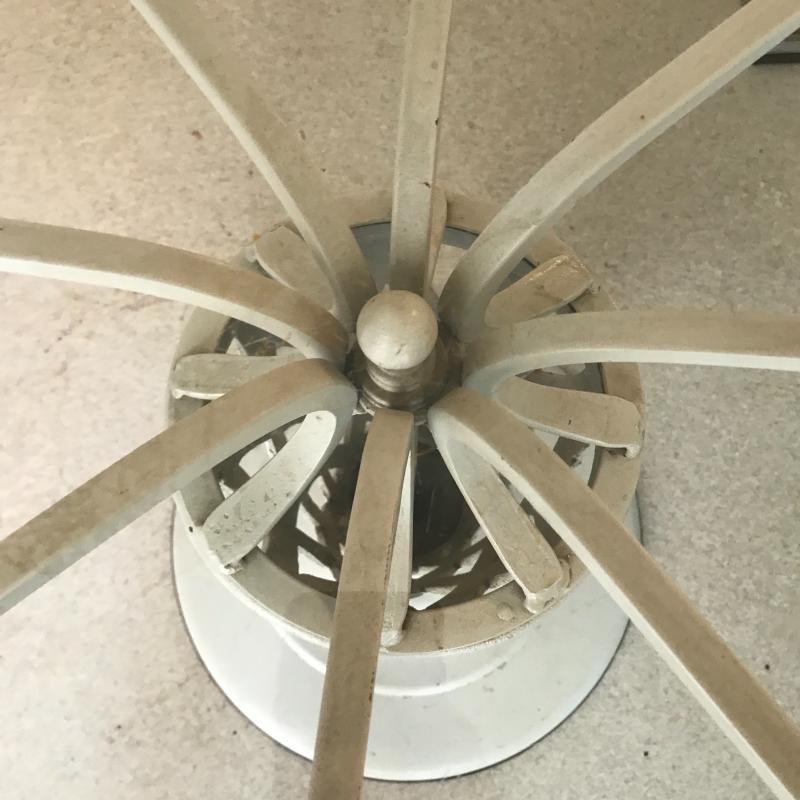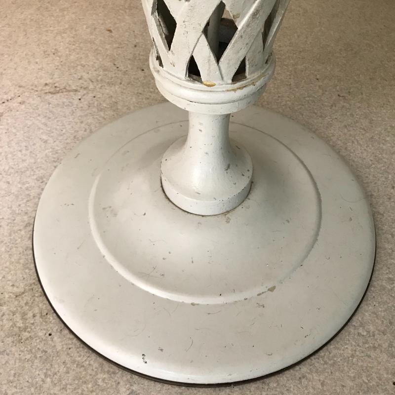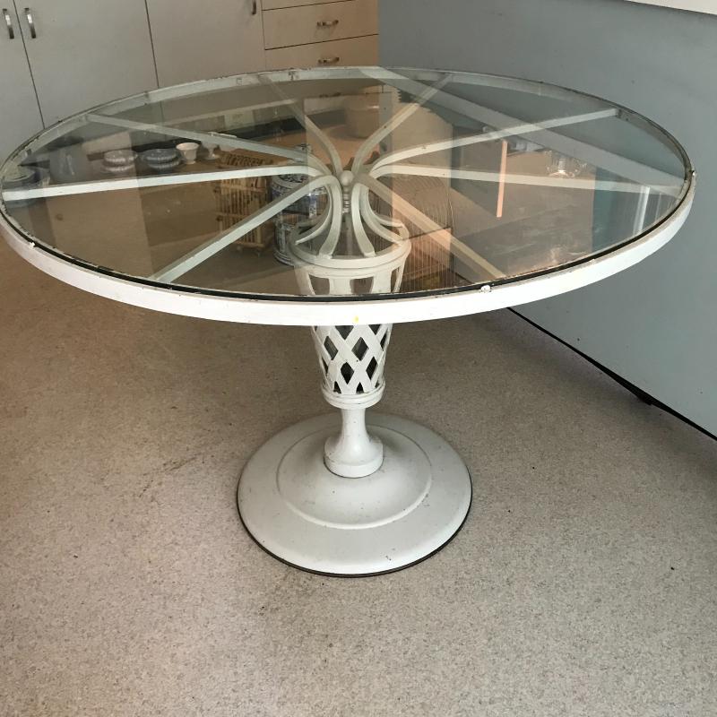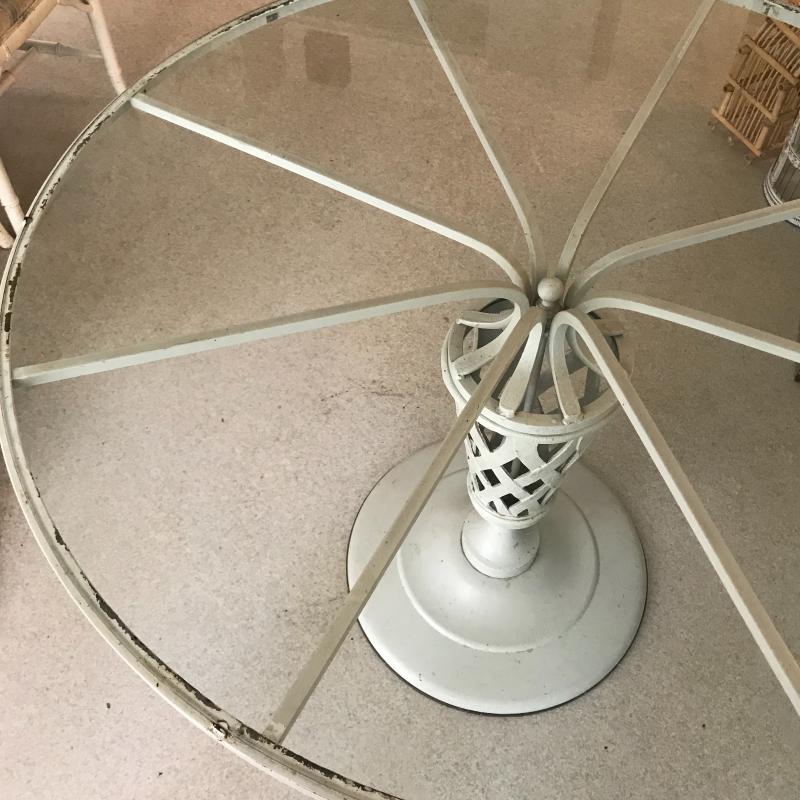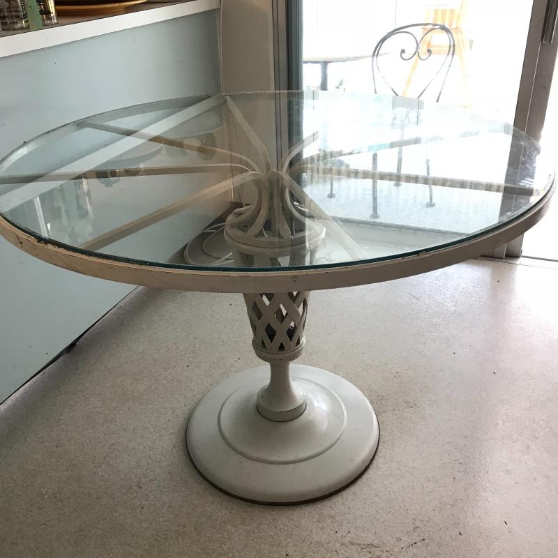This charming glass-top wrought iron table is painted white and has very little rust. Can be used outside or inside. Approx. 42.5” in diameter and 29” tall. No shipping available. Local pickup only in Asheville, NC.