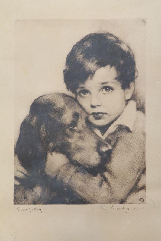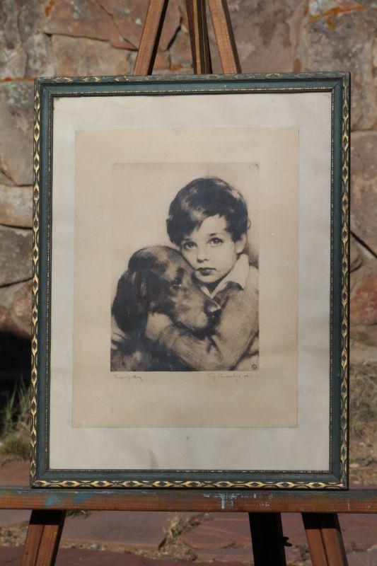Lot 2-181: Vintage "Sympathy" Boy w/ Best Friend Retriever Antique/Vintage Framed Print {17" x 13.5"}