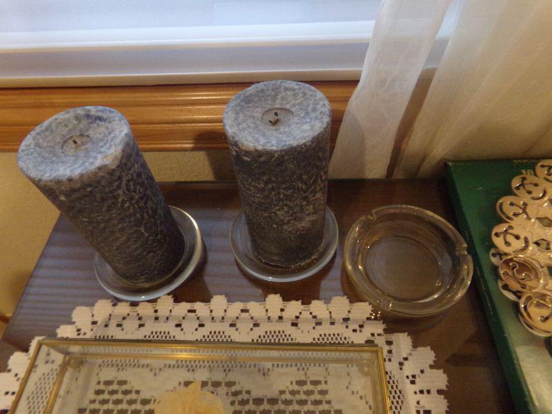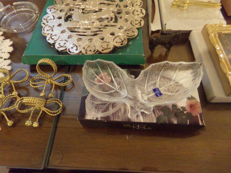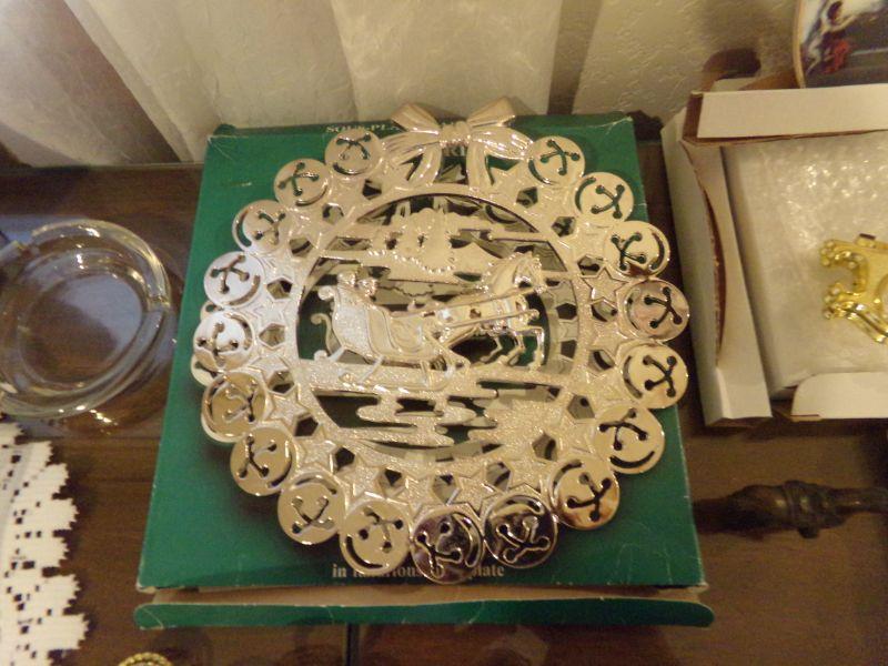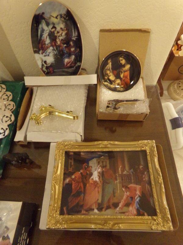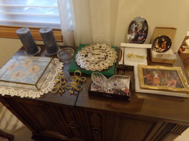 TWO CANDLES W/ HOLDERS, ASHTRAY, BEAUTIFUL WREATH, STUDIO LEAF CANDY DISH, HORSE RECEIPT PICK, FOUR BOW NAPKIN HOLDERS, 2 RELIGIOUS PLATES, GOLD TRIM PICTURE