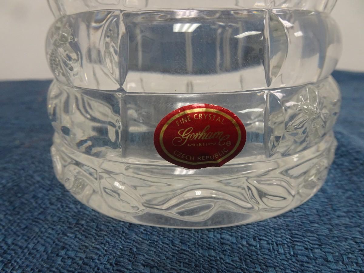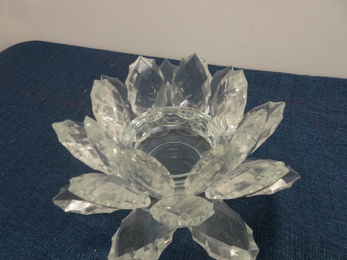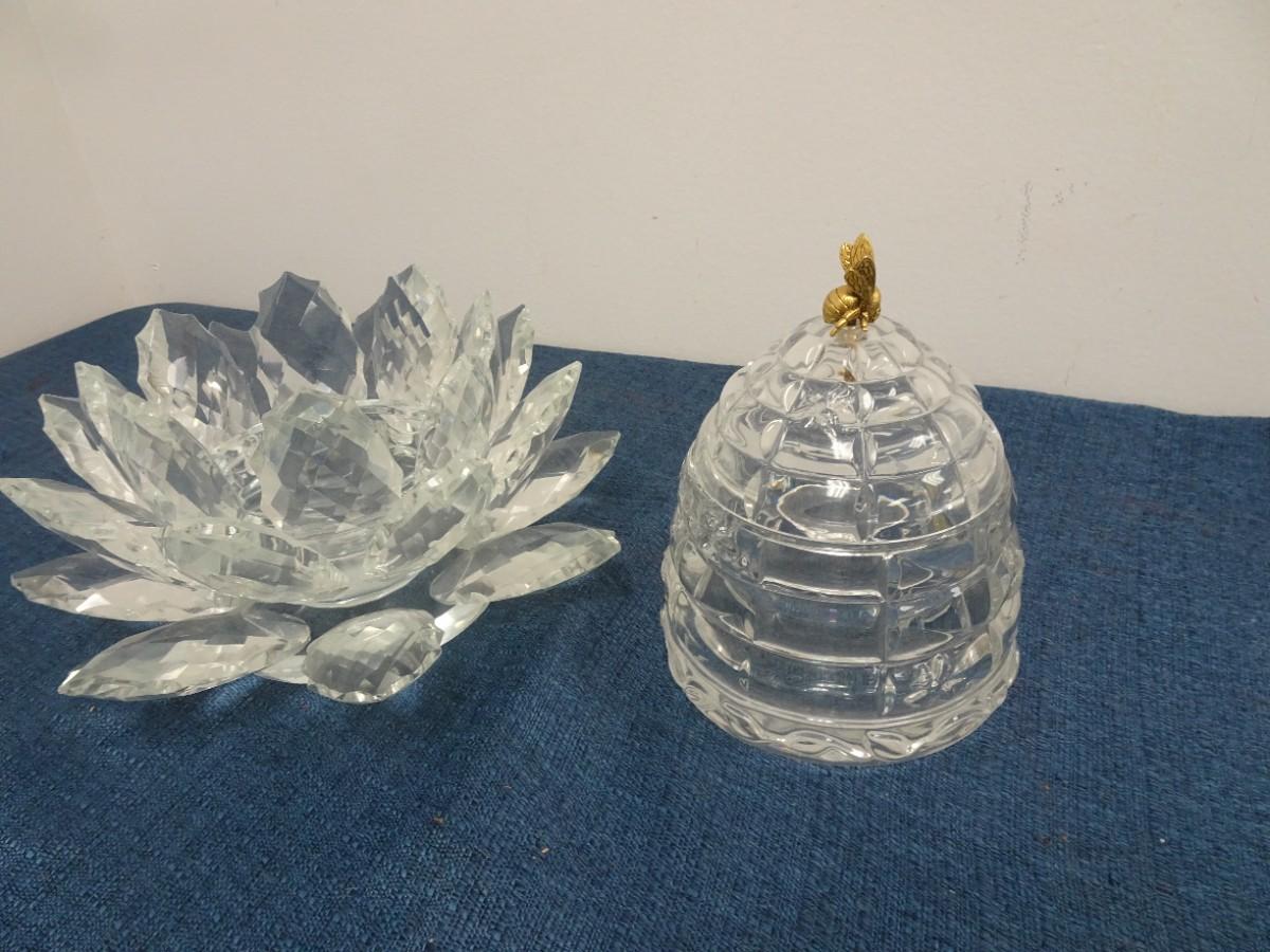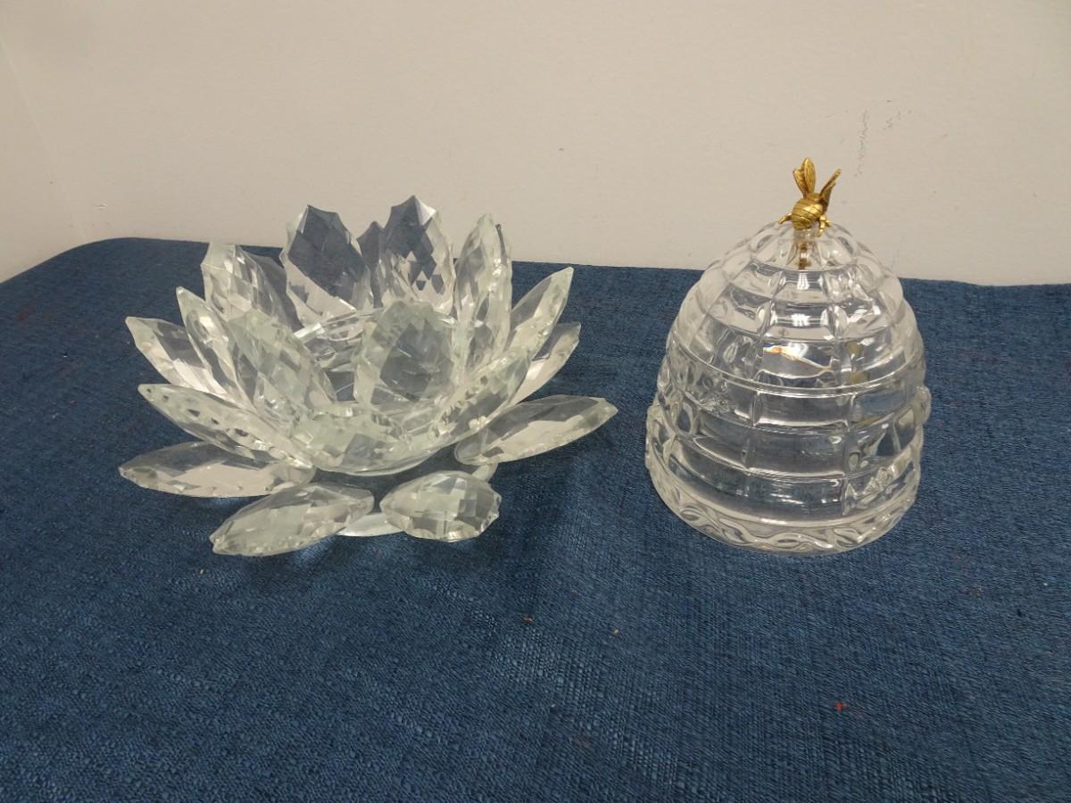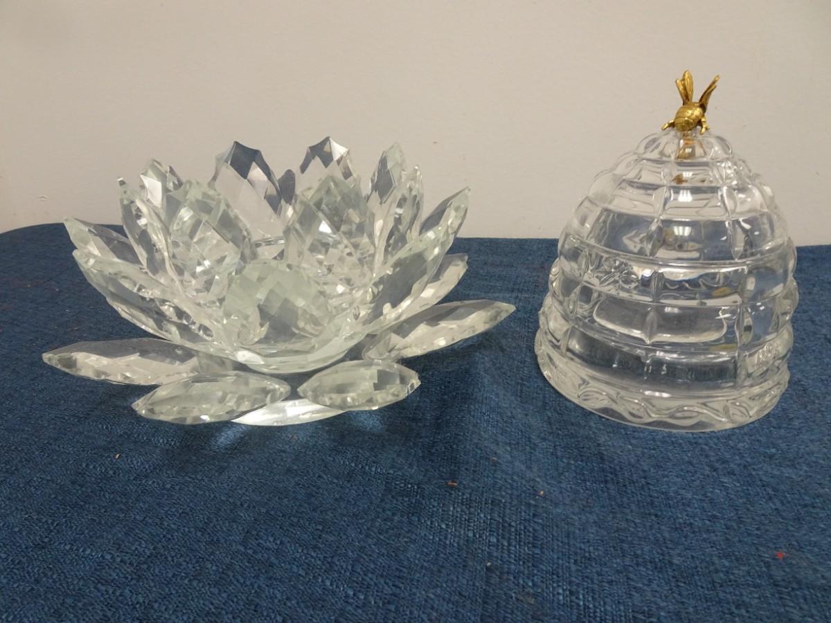 LOT 219. CRYSTAL GORHAM BEE HIVE DECOR AND WATER LILY CANDLE HOLDER