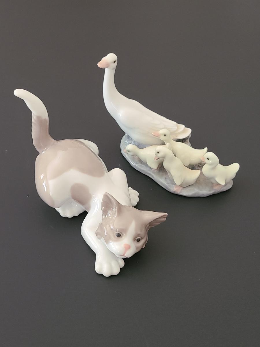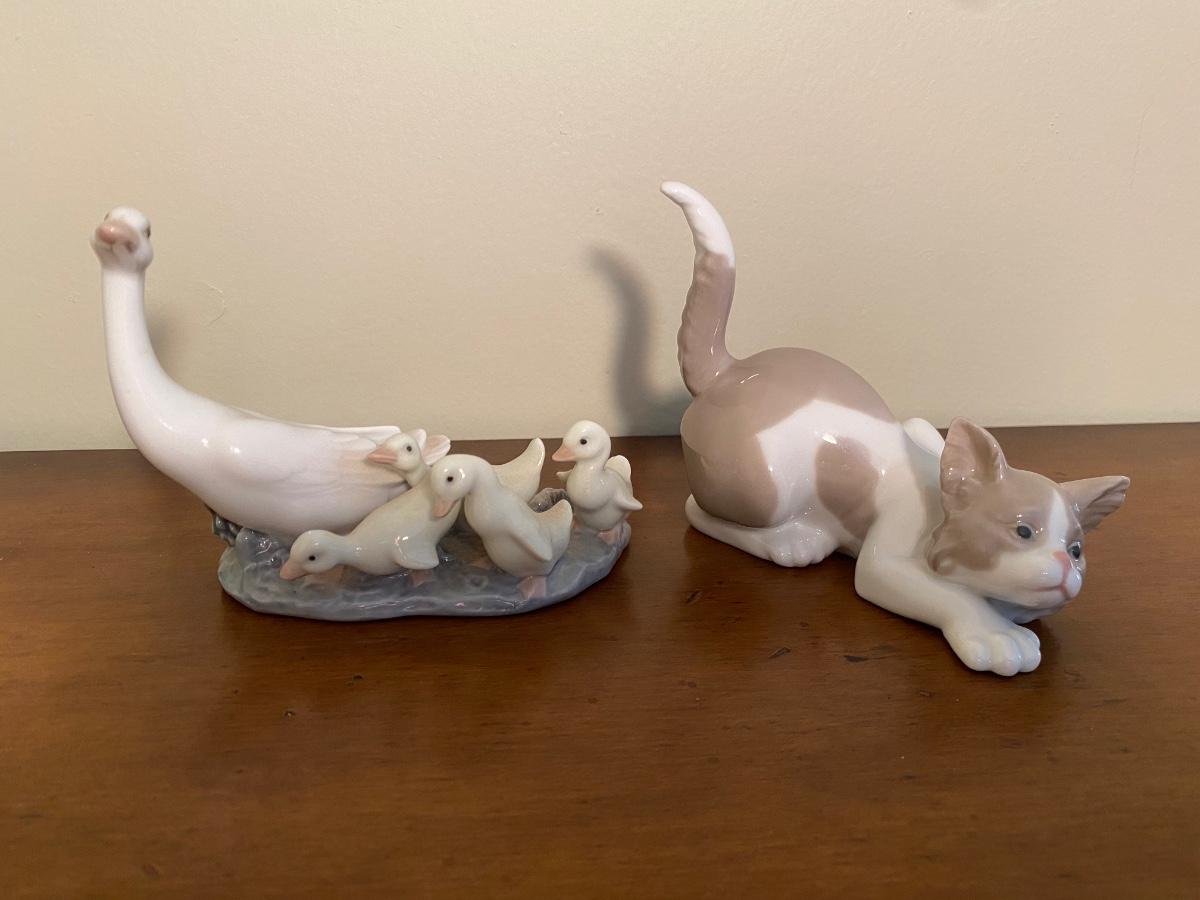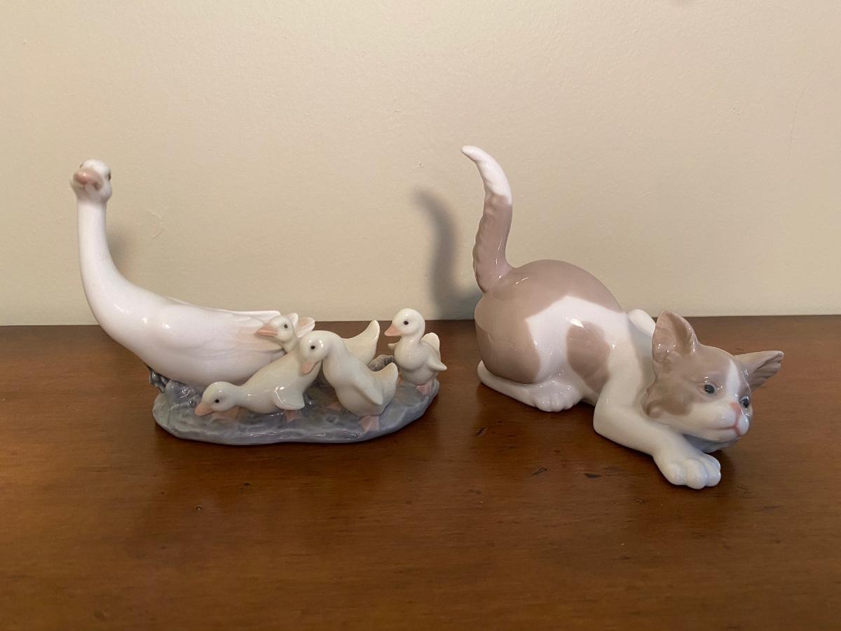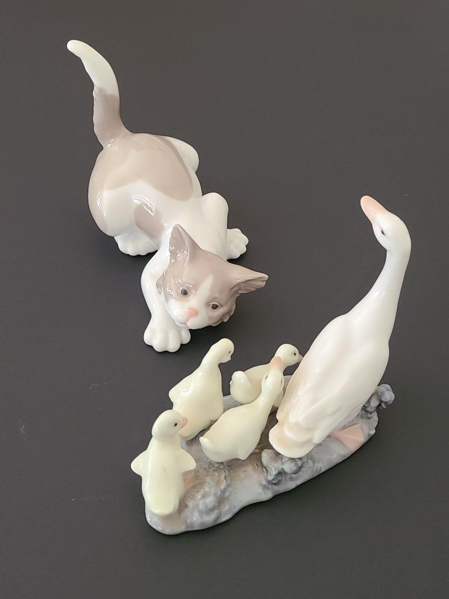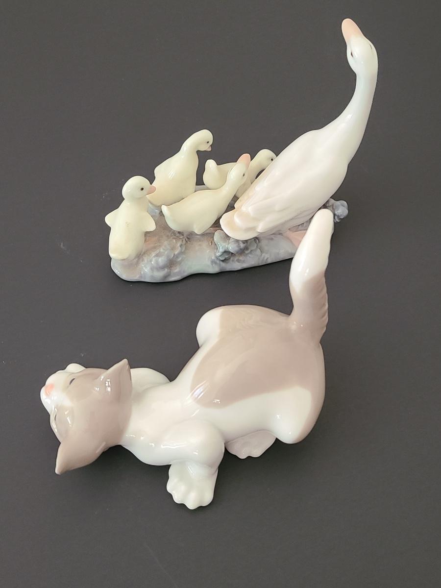 Lot 219: Lladro’s. Figures: Playful Cat and Mother Duck w/ Ducklings