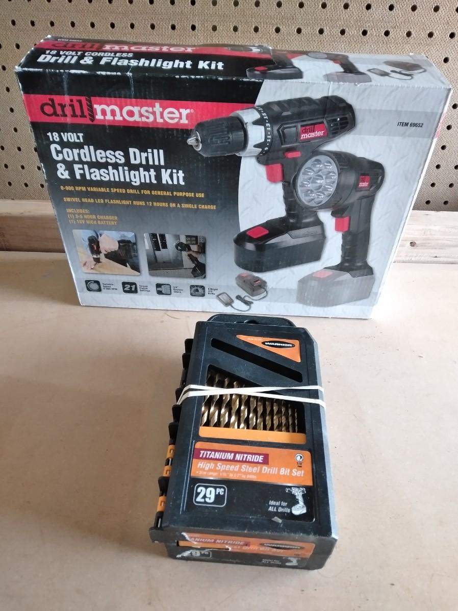 LOT 219 NEW DRILL MASTER CORDLESS DRILL & FLASHLIGHT, DRILL BITS