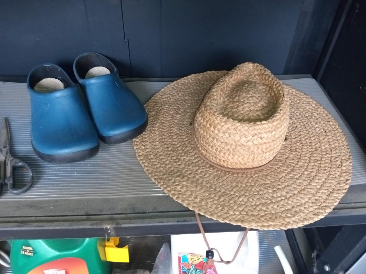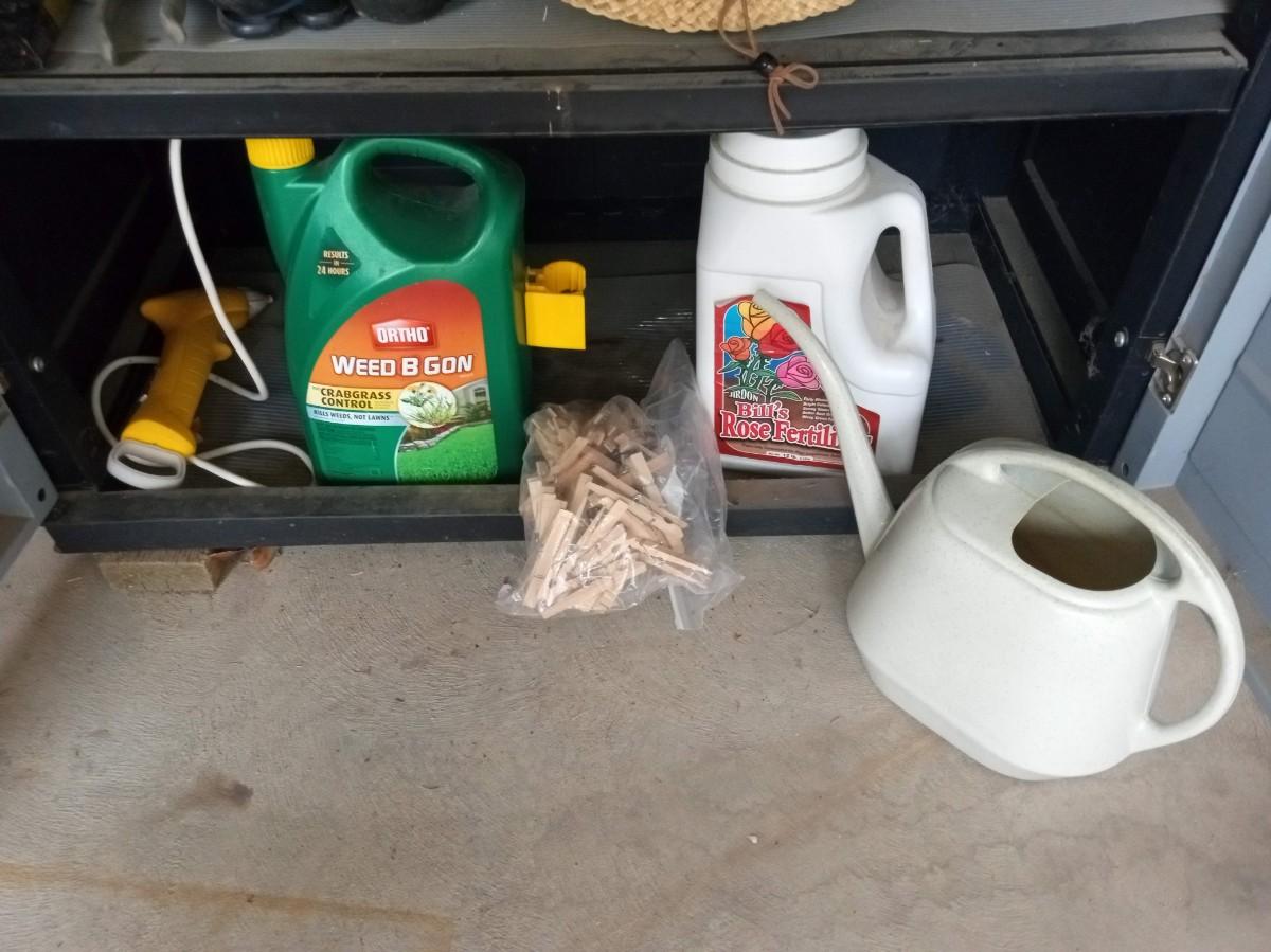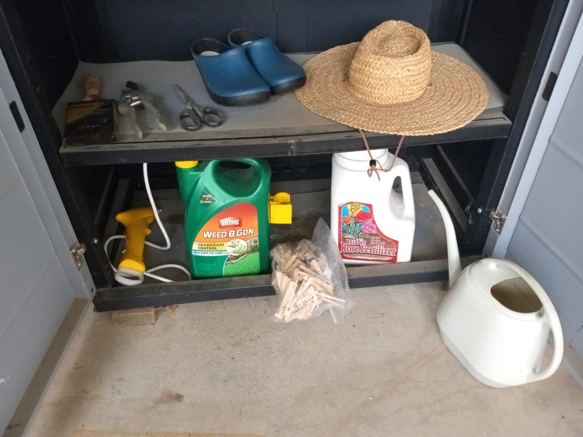 HAND TOOLS, SUN HAT, SLIP ON DR SCHOLLS SHOES SIZE LADIES 8, WEED B GON, WATERING BUCKET, ROSE FERTILIZER AND CLOTHES PINS