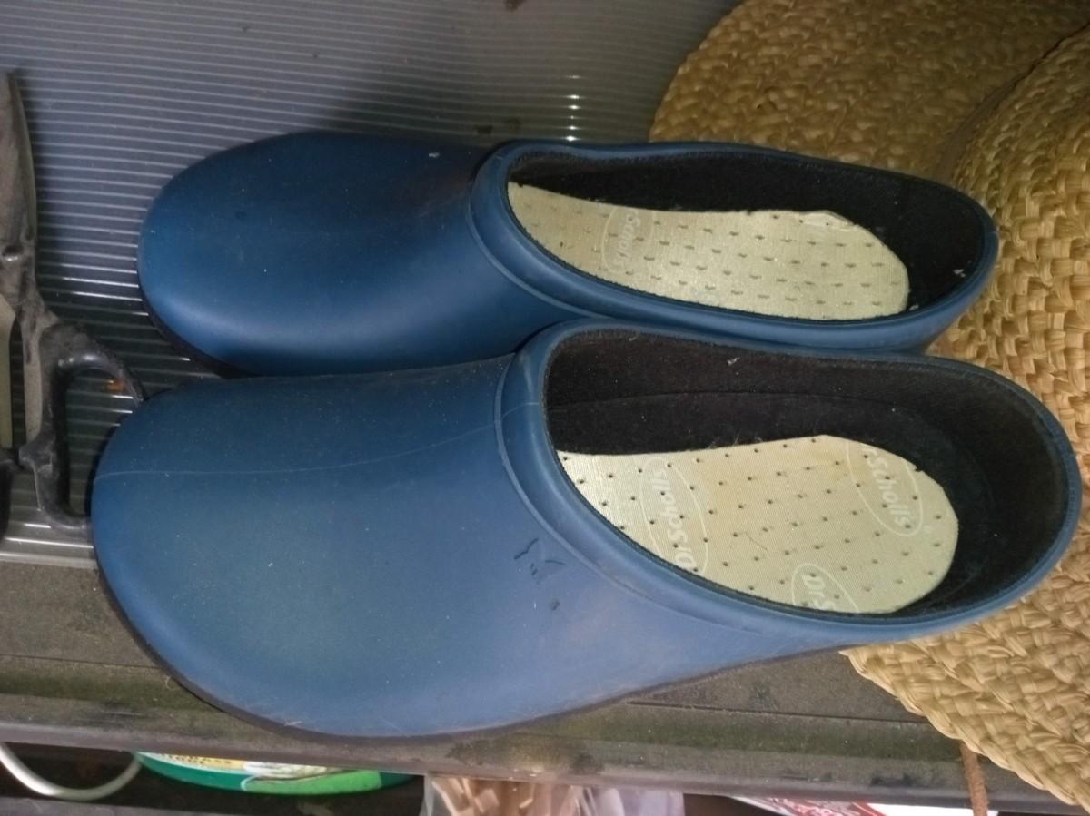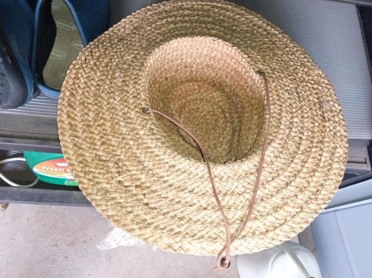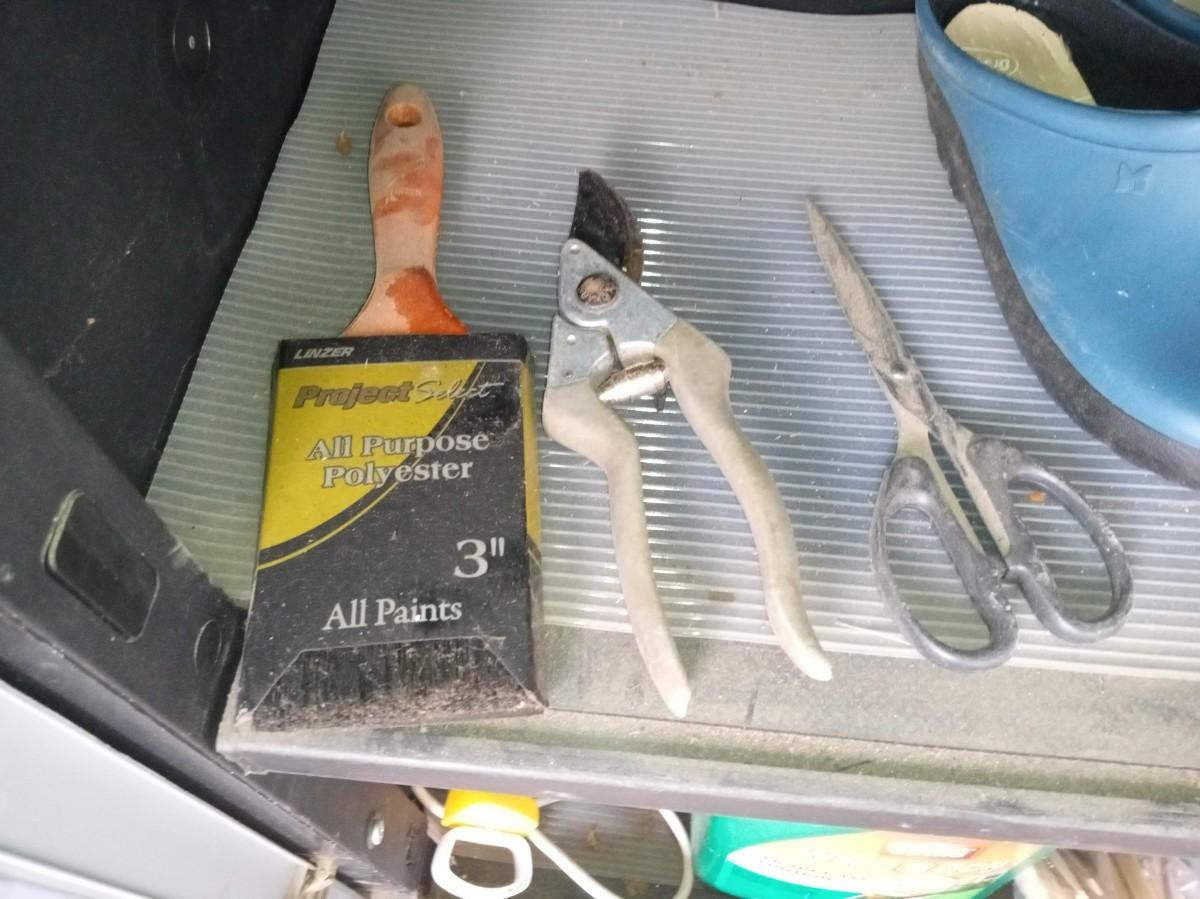 HAND TOOLS, SUN HAT, SLIP ON DR SCHOLLS SHOES SIZE LADIES 8, WEED B GON, WATERING BUCKET, ROSE FERTILIZER AND CLOTHES PINS