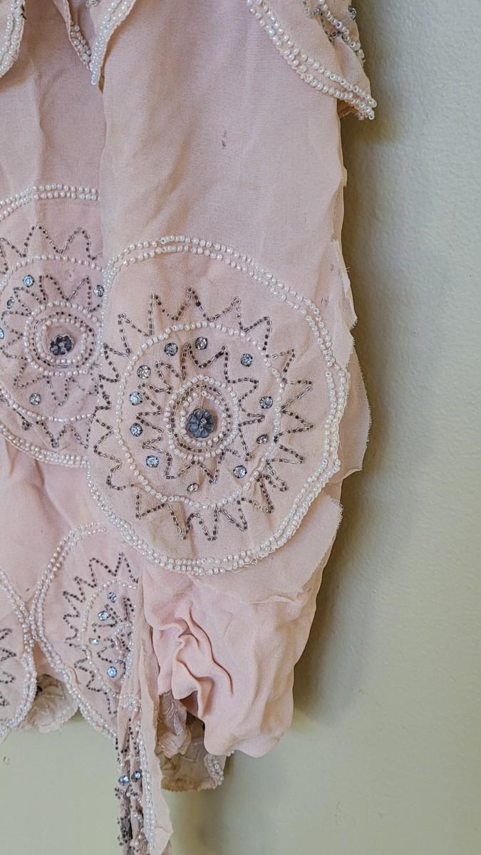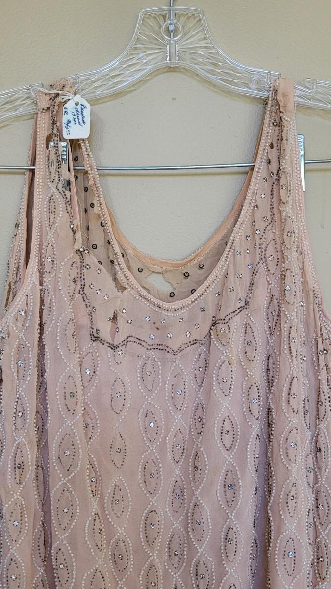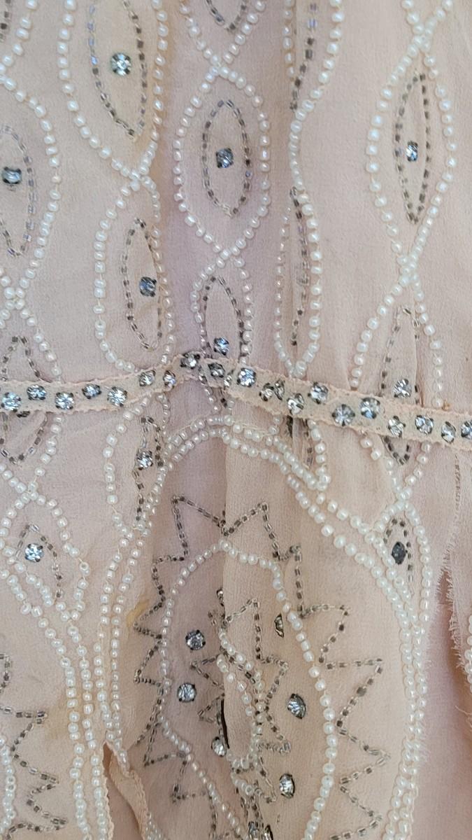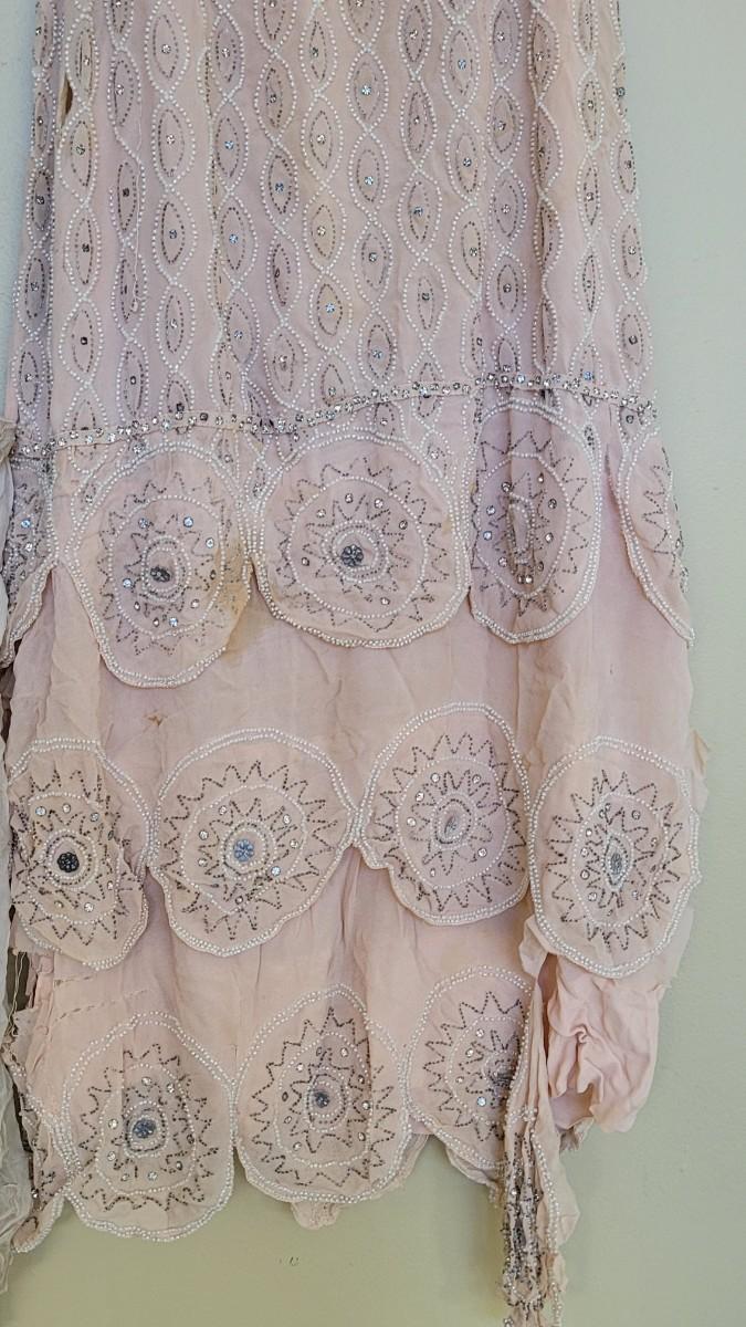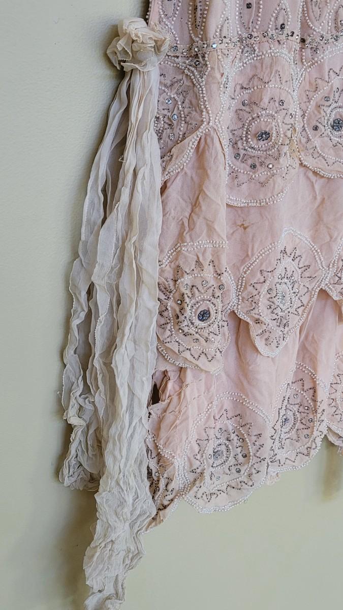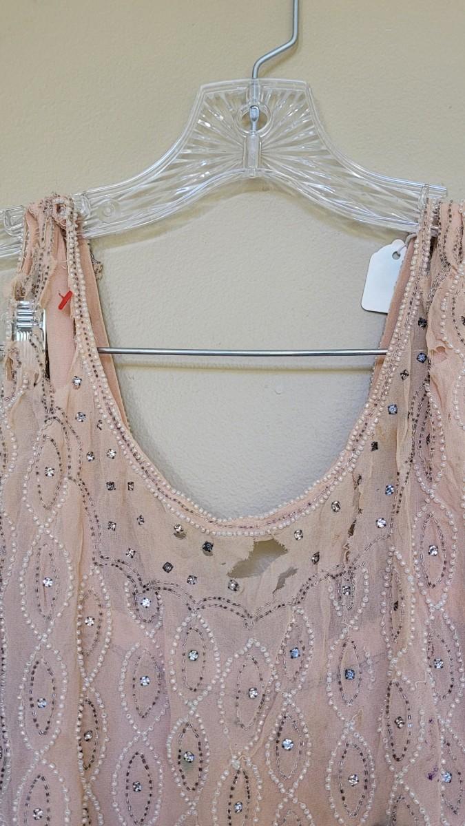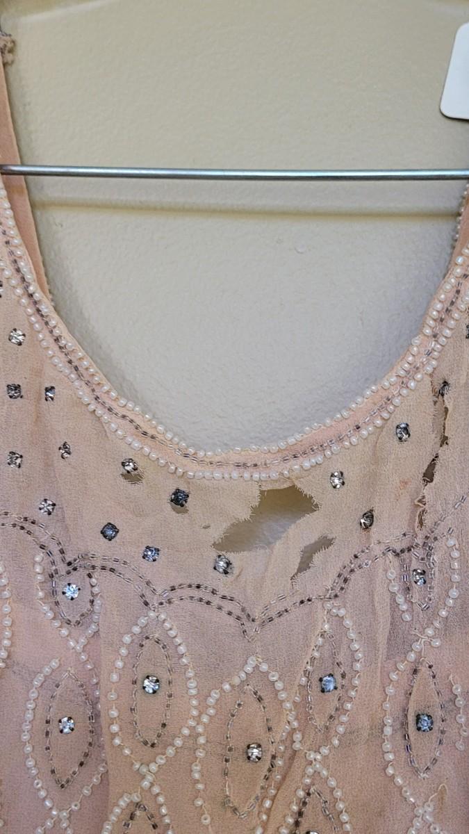 Has some holes and tears. ☆☆☆100 year old hand beaded chiffon flapper dress, a beautiful piece of history. Small/medium in size is best guess.