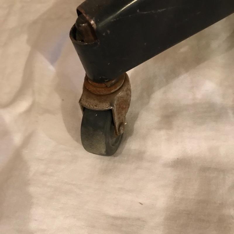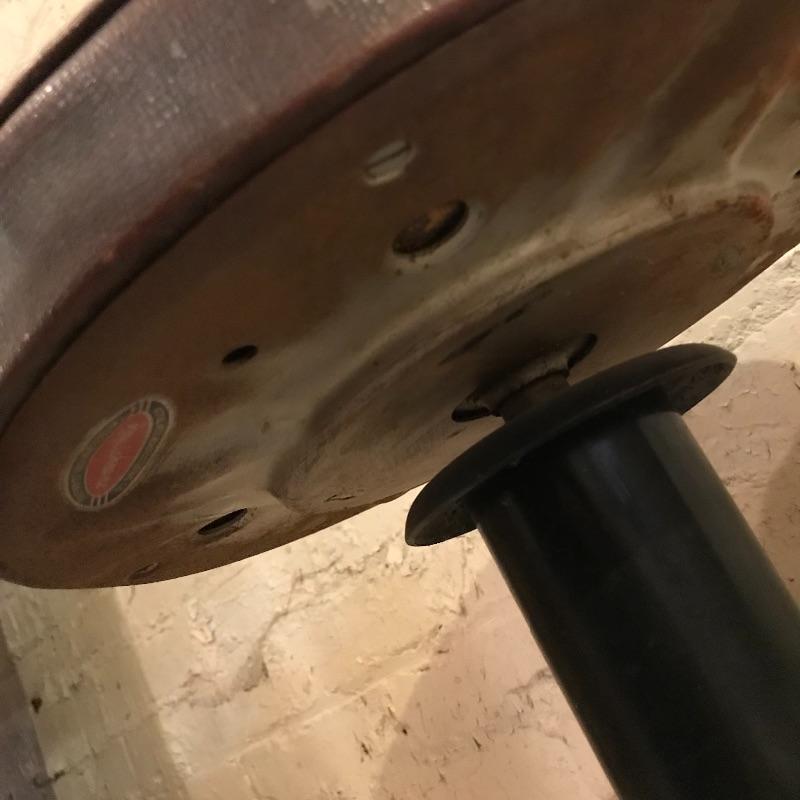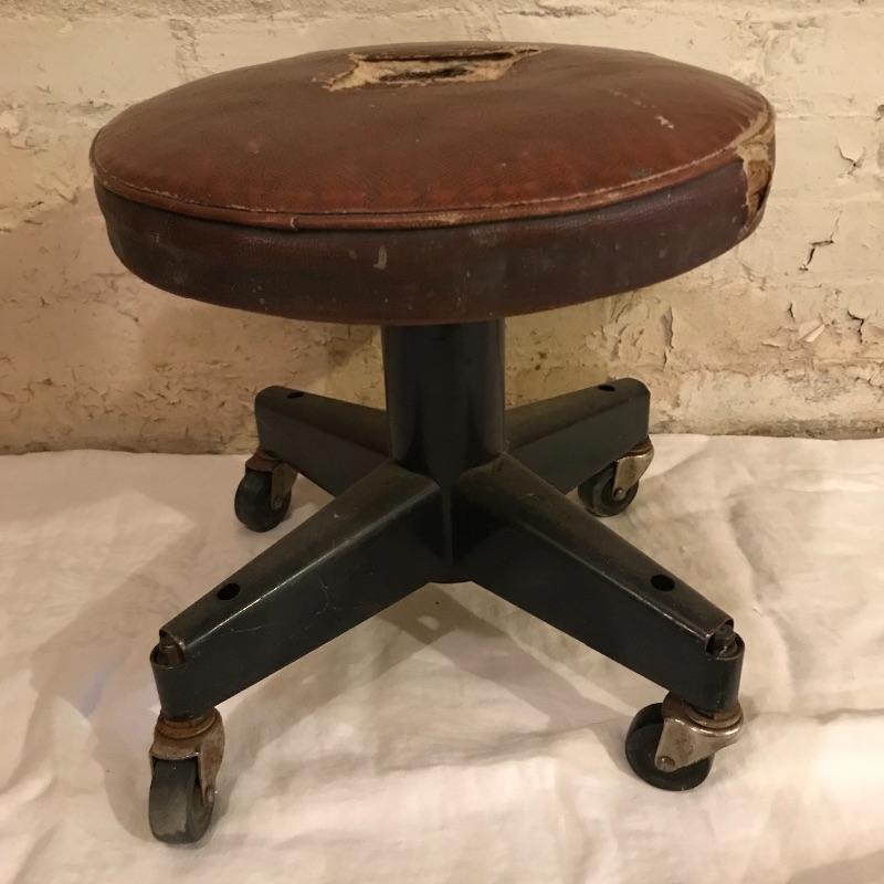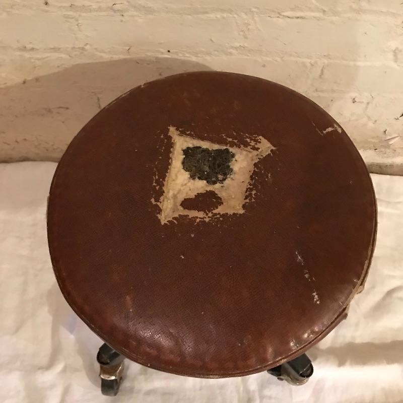 This unique antique piece has a leather seat that appears to be stuffed with cotton and horsehair. Rolls well on its casters. Height adjustable by spinning. Seat is approx. 14” in diameter and in photos, stool stand approx. 14” tall. See pics. Local pickup only.