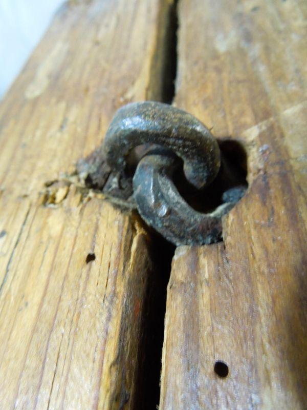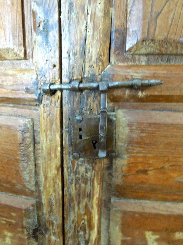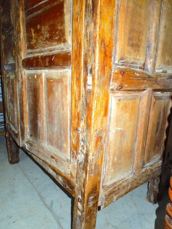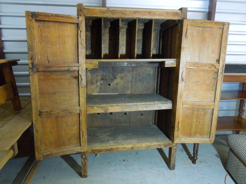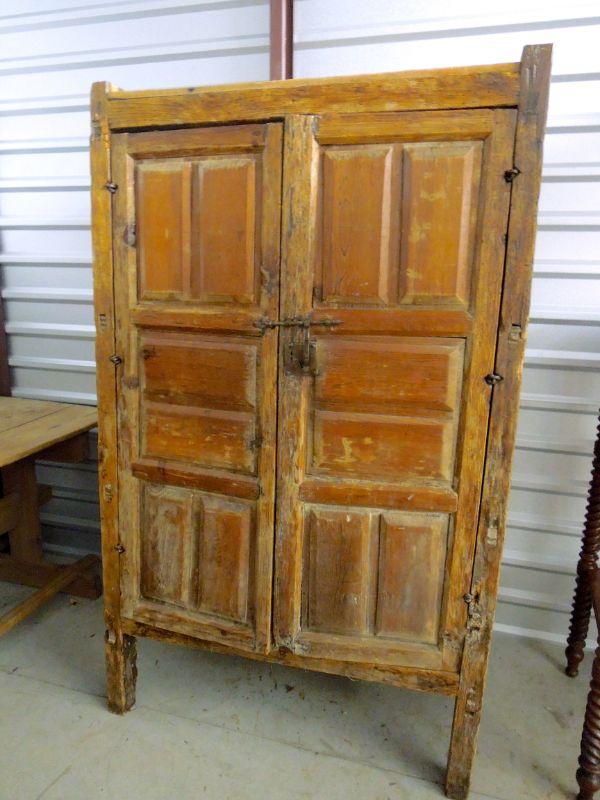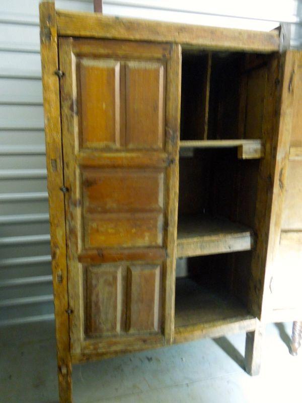 The forged iron hardware on this piece screams of Mexico or Central America. Iron rivet eyelets hold the doors on hinges. Doors are wobbly. Heavy piece with internal sorting bins and shelves. Wood is heavily distressed. 44" W x 25" D x 72" H.