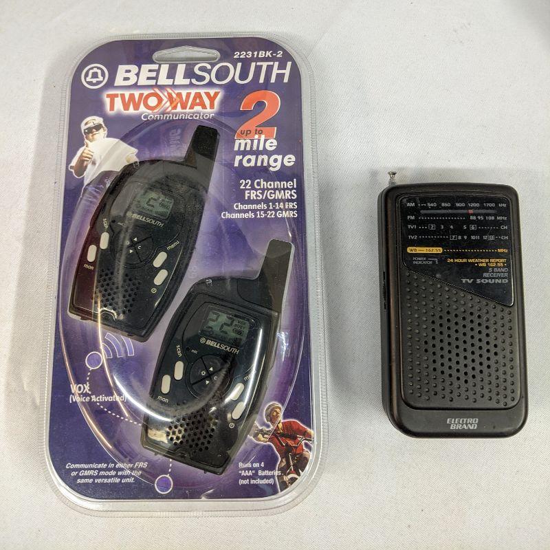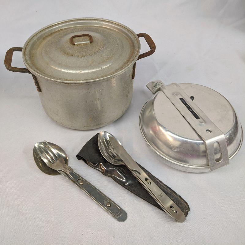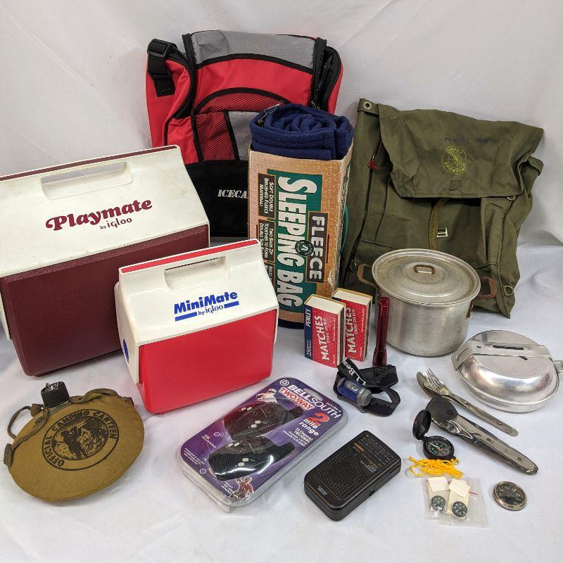 Lot includes a wide variety of items for camping and enjoying the outdoors. Two hard-body coolers, small and large, and a soft, expandable cooler with wheels and an extendable handle. Lot also features a fleece sleeping bag and a green canvas soft backpack with adjustable straps. There's a backpacking cook set as well as one large pot with lid, two sets of backpacking utensils (fork, spoon, knife). We’ve thrown in a metal canteen in a canvas carrying case with a strap. L.L. Bean headlamp that works but needs new batteries, a small red Maglite that also needs new batteries. As if this wasn’t enough, you’ll find an unopened package two-way radios for communication up to 2 miles away and a 5 band receiver for both radio and TV sounds that also works. There are several compasses and two boxes of wooden matches. All in all, this is a great group of items for the outdoor enthusiast!