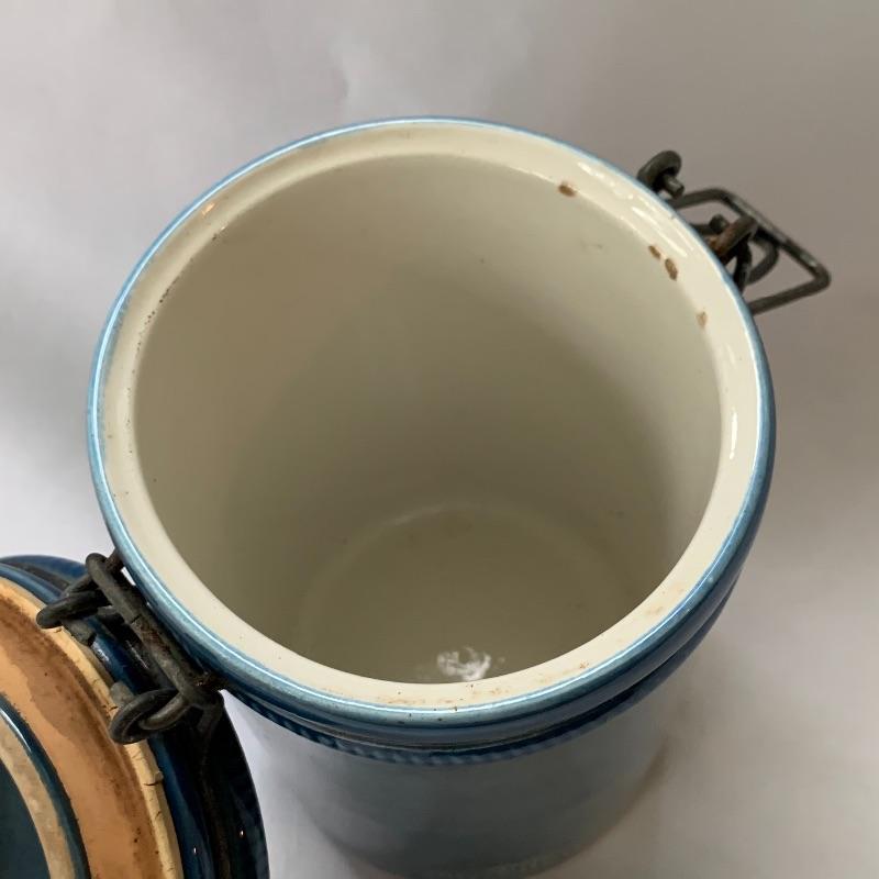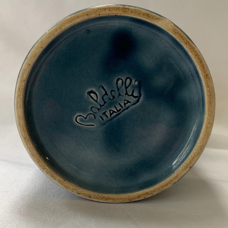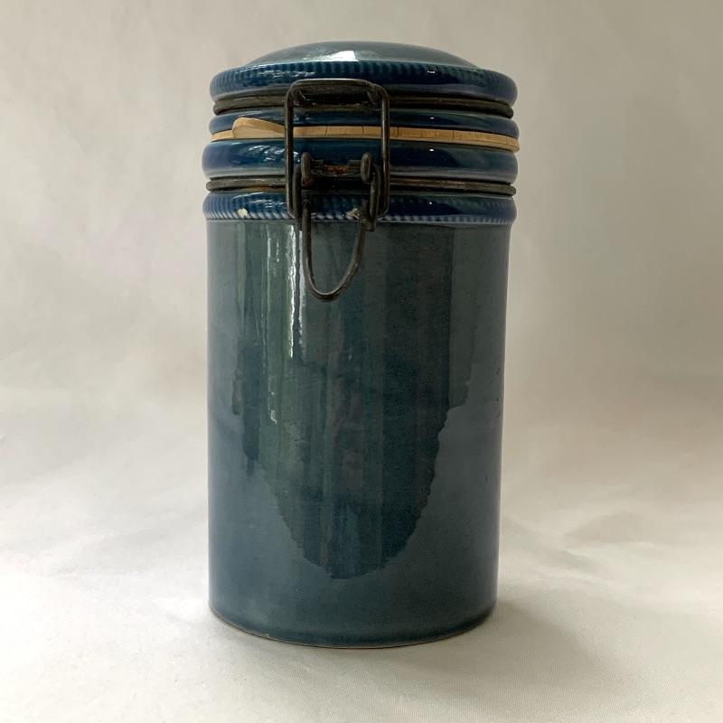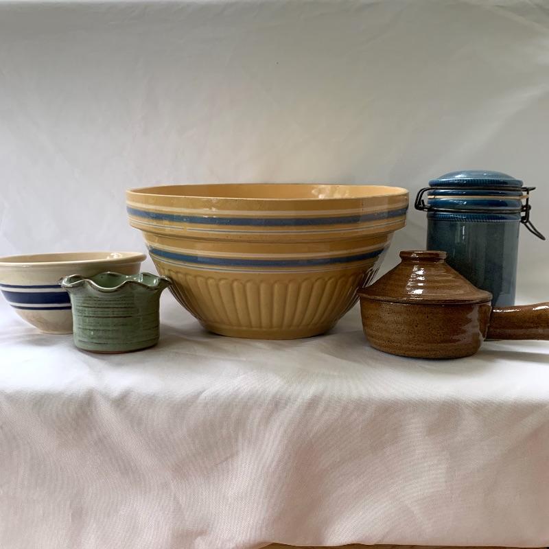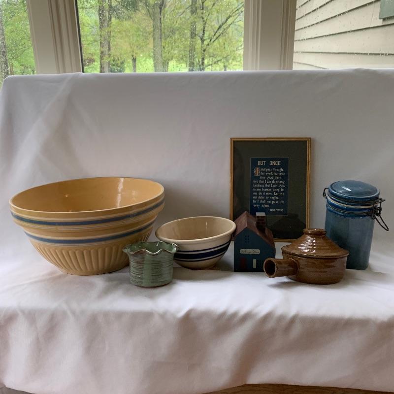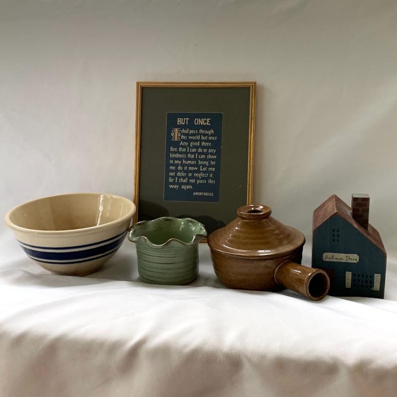 Get both functional and decorative art in this lot. There are three nice ceramic bowls. One is a large (12.5” in diameter) tan colored bowl with blue stripes decorating the outside. Another is a smaller cream colored bowl, also with blue stripes decorating the outside. The third is a small cylindrical seafoam green colored ceramic dish with a ruffled top edge. Also included is a blue cylindrical ceramic jar with a latch, by Baldelli in Italy, and a Short Wave ceramic microwave cooker with a domed chimney lid. There is also a framed poem titled “But Once” that measures 7.5” x 10” and a small wooden hand painted “Antique Store” model. Shipping available.