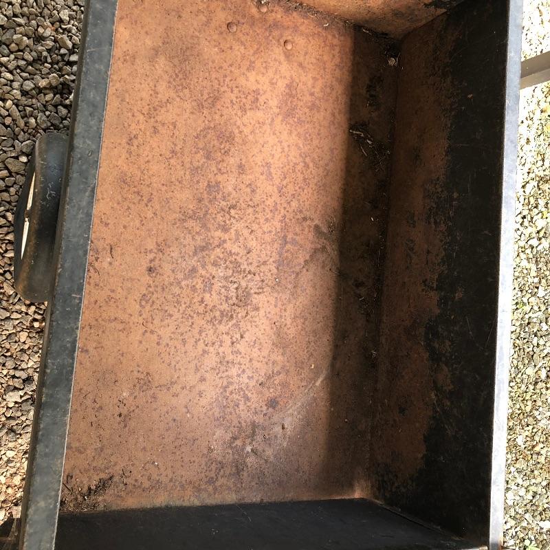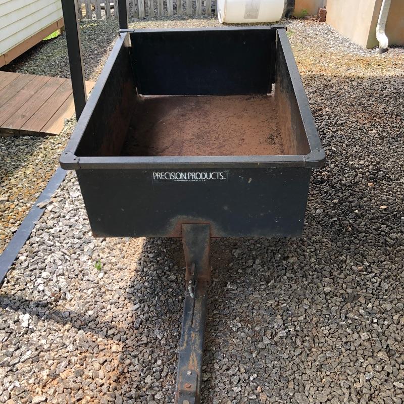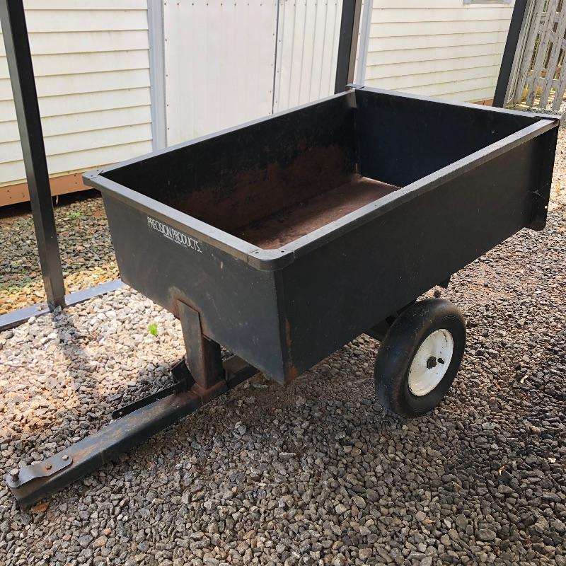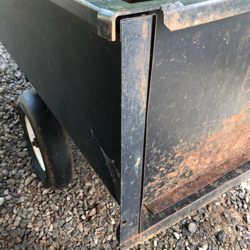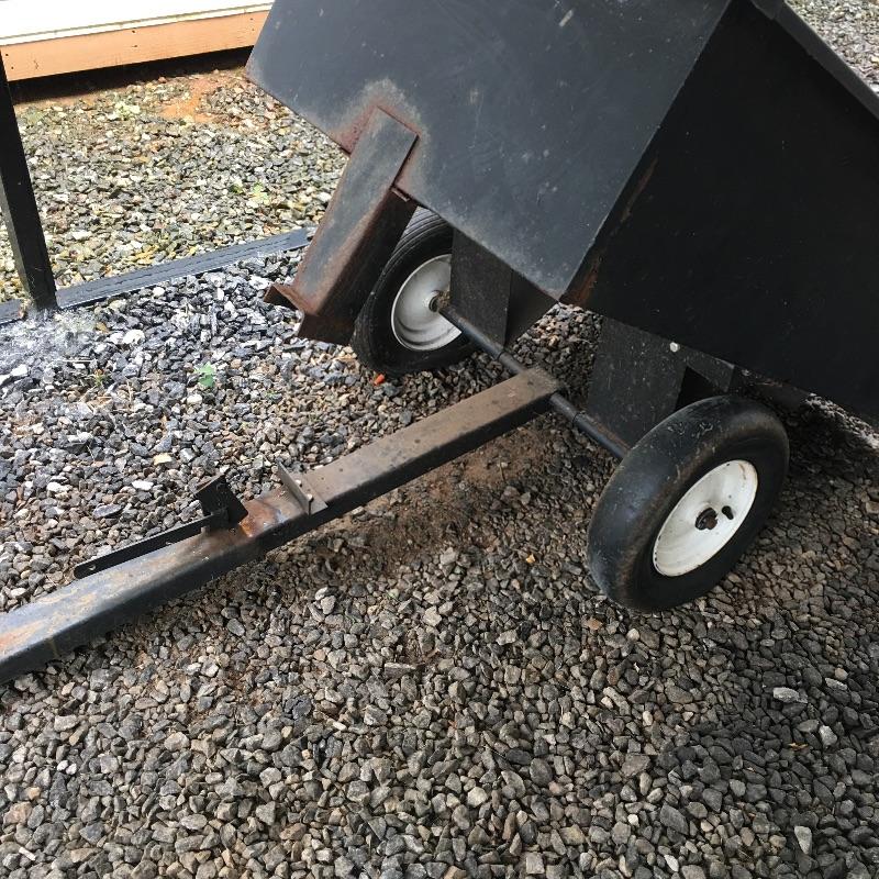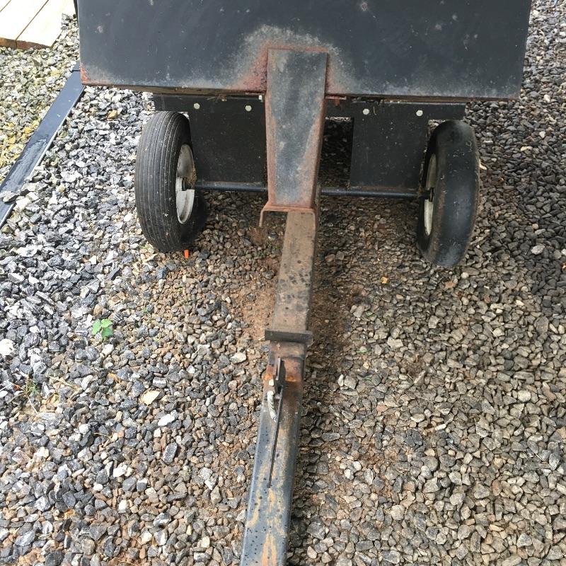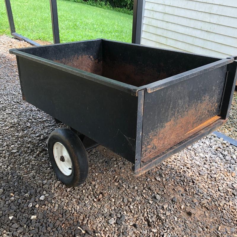 This trailer (36” x 49” x 28”) is perfect for someone who has to tug around a lot of tools or materials in there backyard. It attaches to a mower and can carry several large, heavy tools. Haul your gear easier with this trailer that has dump bed. Trailer is solid but has some rust and tires do not have air.