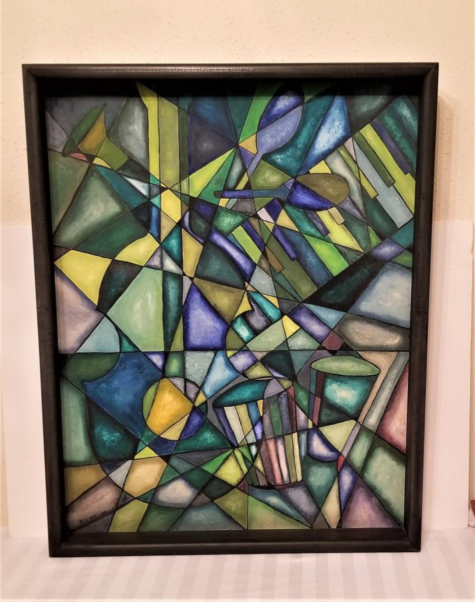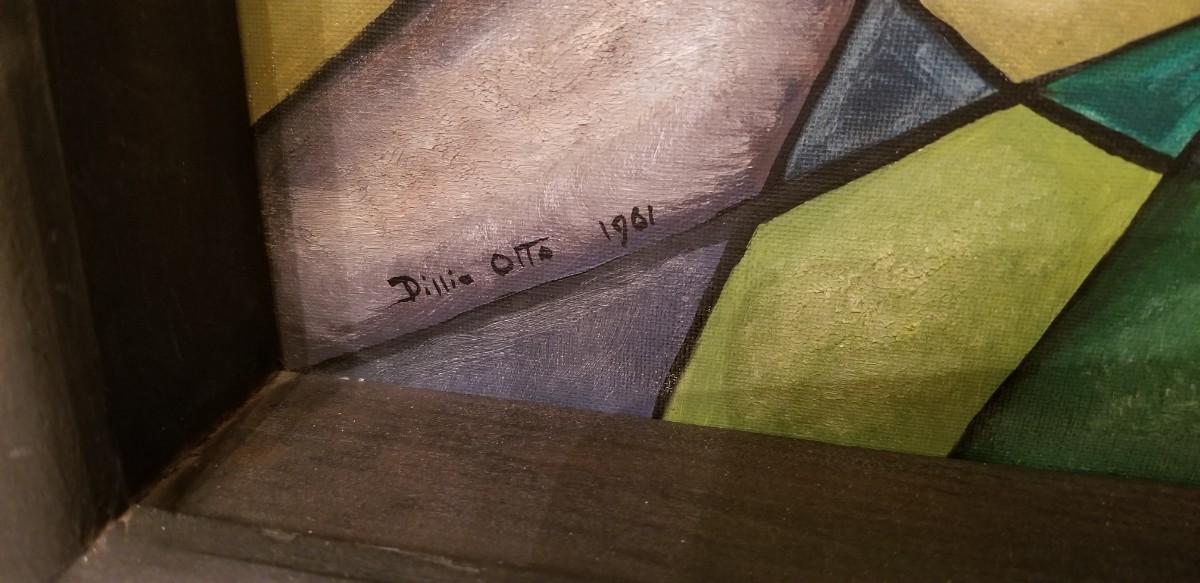 Classic Midcentury modern abstract, placed in a wooden shadowbox style frame - signed Dillie Otto 1961. 22.5" x 28.5". Good condition.