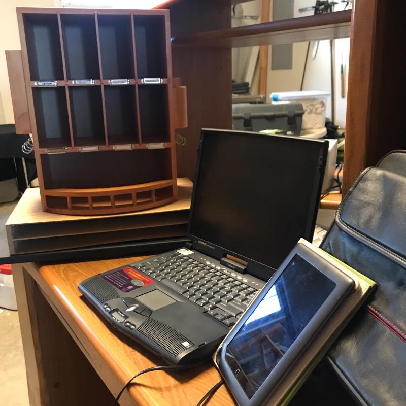 Compaq Presario laptop computer with mouse. Includes leather laptop bag. Nook from Barnes and Noble. Includes carrying case. (Cannot verify working condition for the electronics.) One Apple and one IBM keyboard. A desktop organizer (16”l x 10”w x 17.5”h). A two-shelf stand for under computer and a black swivel stand for under computer or TV. Desk in photos not included. No shipping. Local pick up in Asheville, NC only.