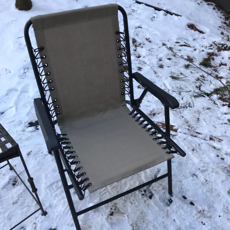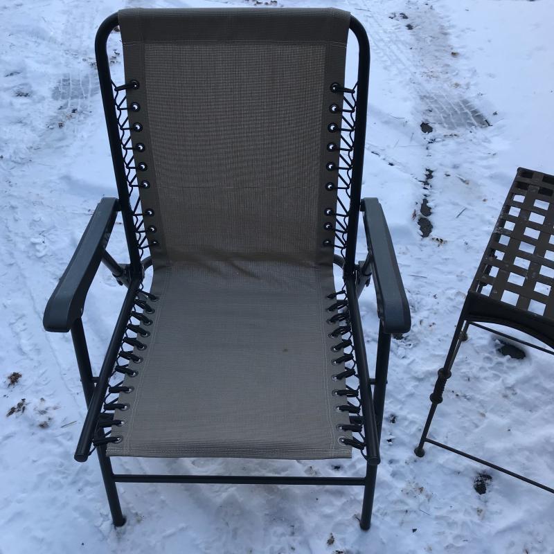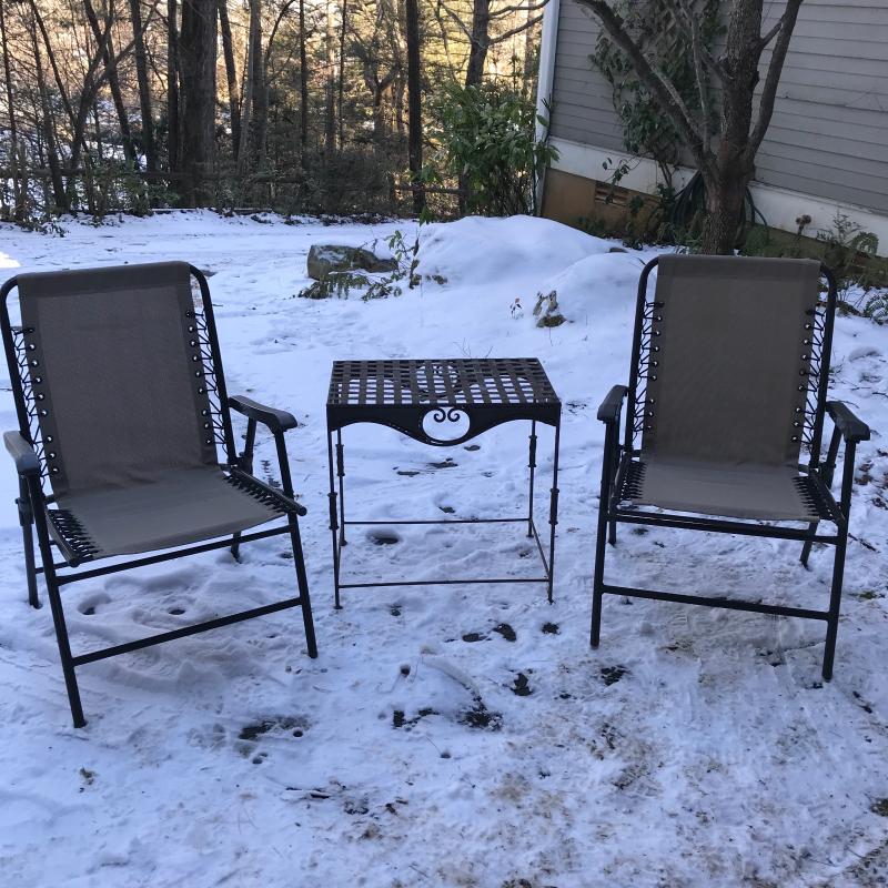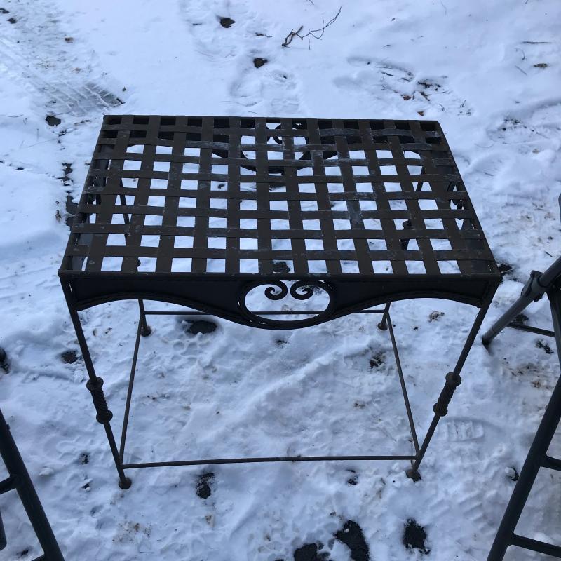 Two woven folding chairs, and weave design metal table that measures 23.5” x 16” x 23”. Lot available for local pick up in Flat Rock, NC only.