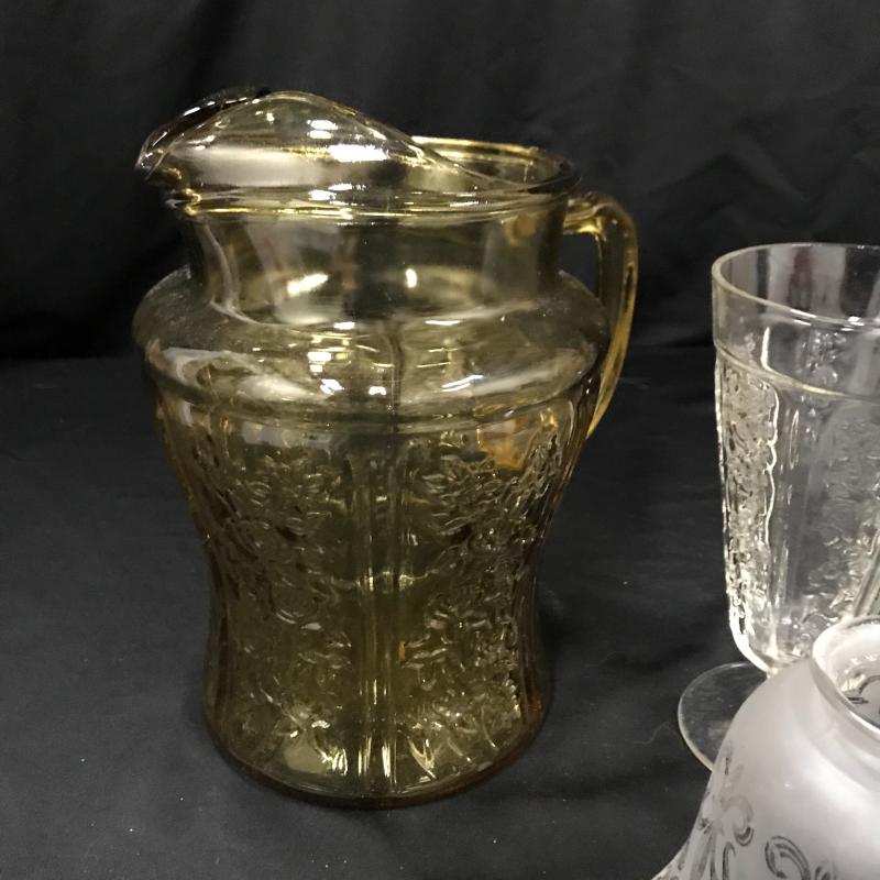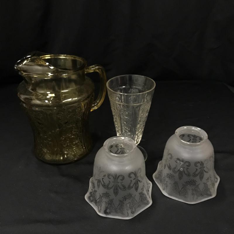 Depression glass pieces and glass lamp globes. See photos for details. Shipping or local pick up in Asheville