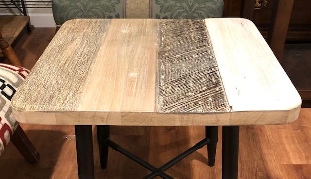 Table has faux finish top and metal base. Measures apprx 19.5" square x 18" tall.