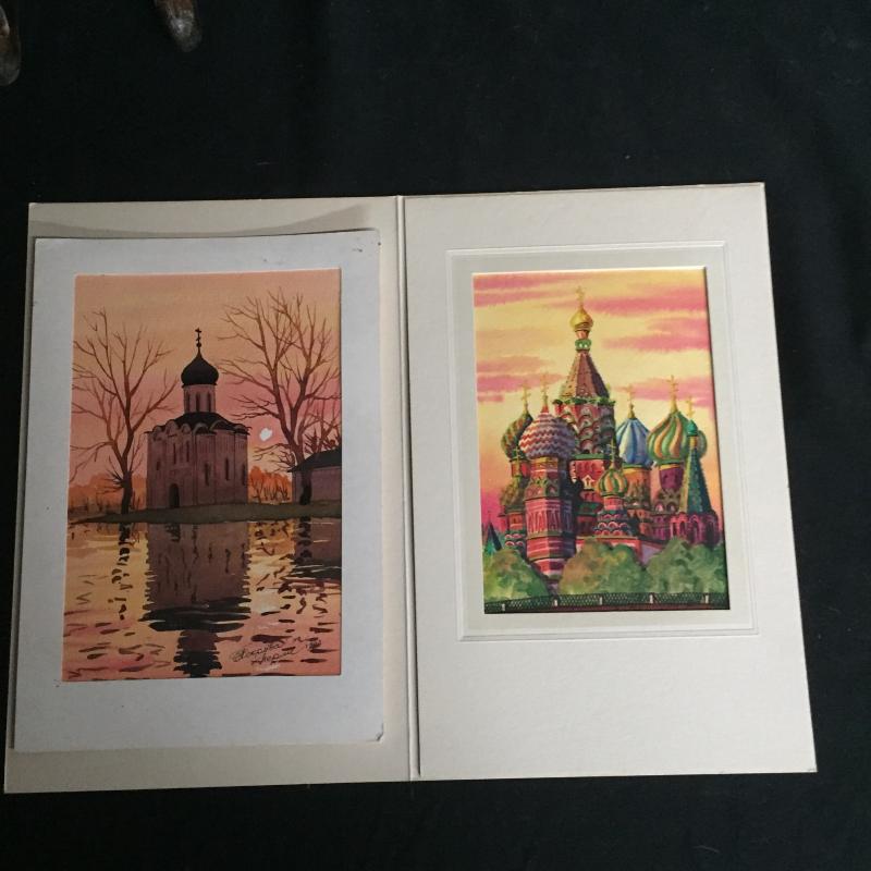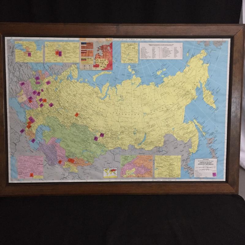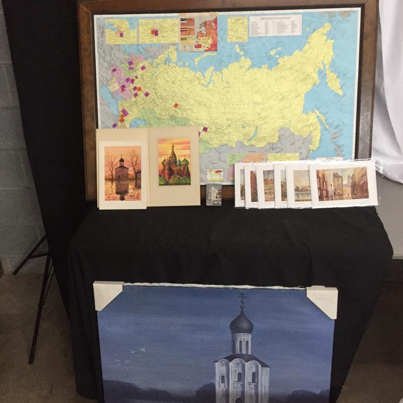 Russian inspired art along with a map of the USSR. Map is accompanied by a painted canvas depiction of a Russian Cathedral painting and more. Map measures 27.5” x 40”. No shipping.