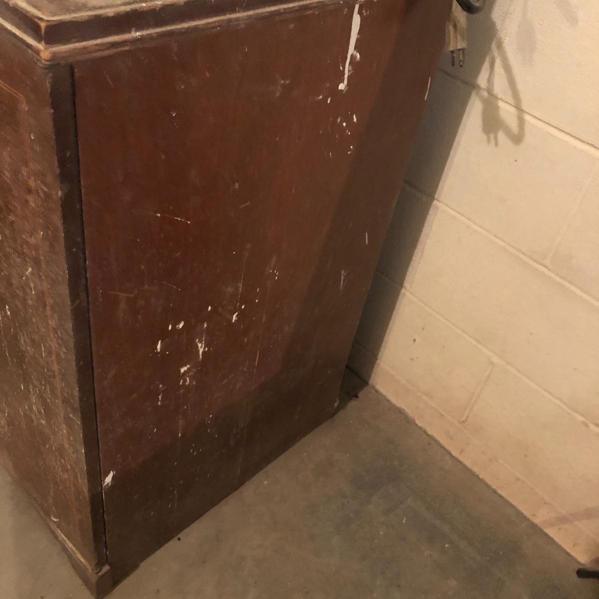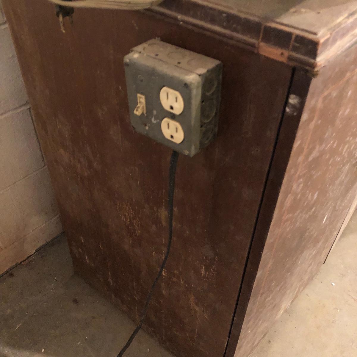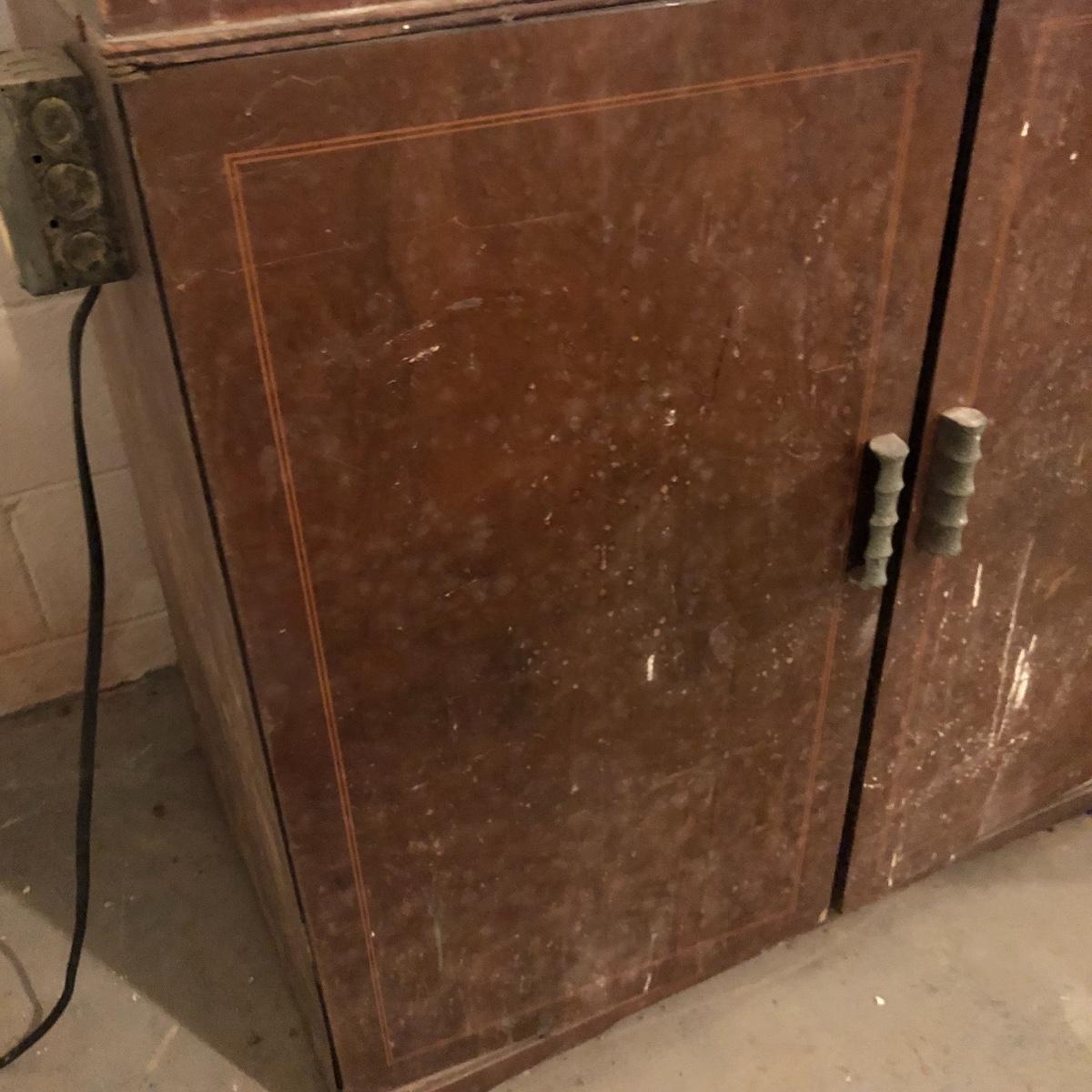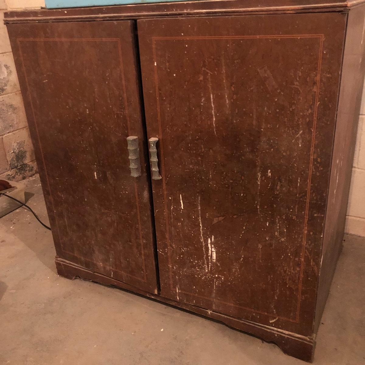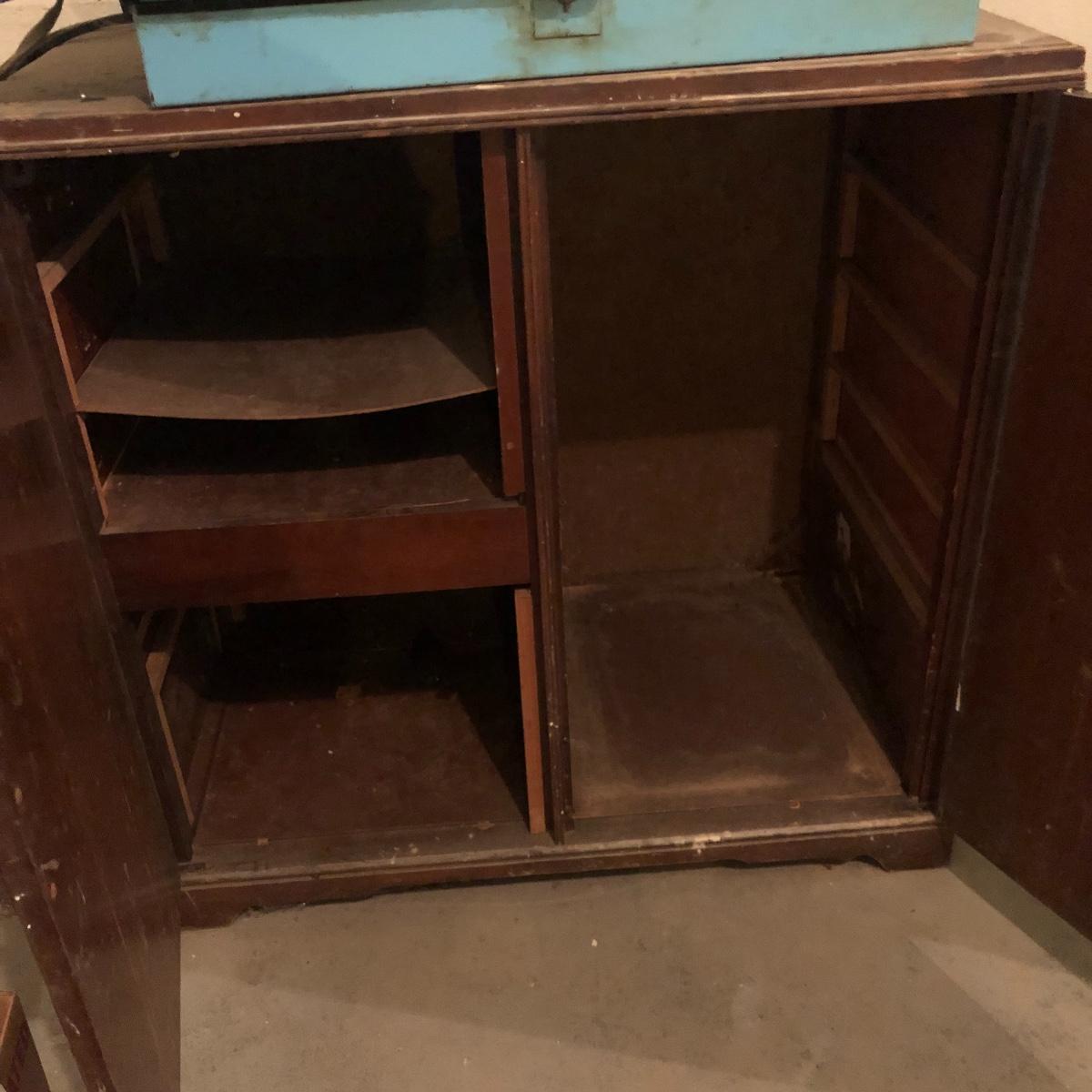 Get organized in the garage or your shop with this cabinet. It has metal handles and a shelf on the left side with shelf supports on the right for you to add the shelves you need. It is an older cabinet and therefore looks to be solid wood. Unit has box that has switch for a plug. It does have some paint and wear on it yet at one time, was a handsome piece of furniture. It measures approximately 35.5” x 21.5” x 35”. The lapidary saw is not included with this lot. (If interested, the saw is in lot 85.)