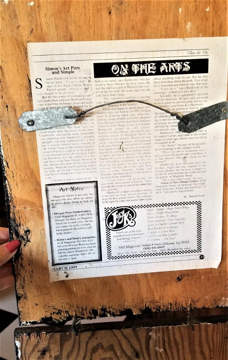 Mixed media piece done is the year 2000 by Simon of New Orleans - info on reverse. 36" tall, 21.5" across. Good condition.
