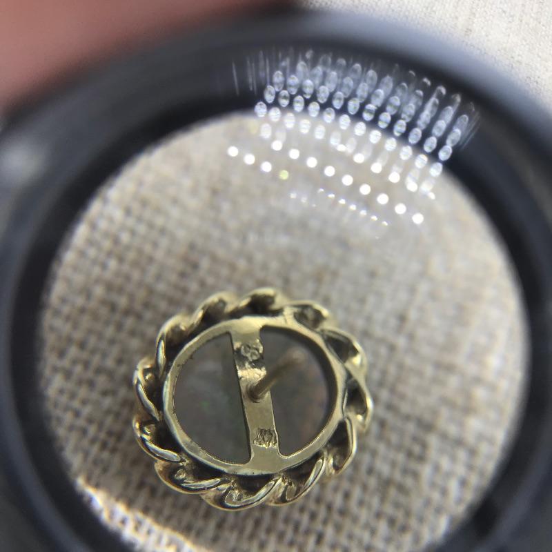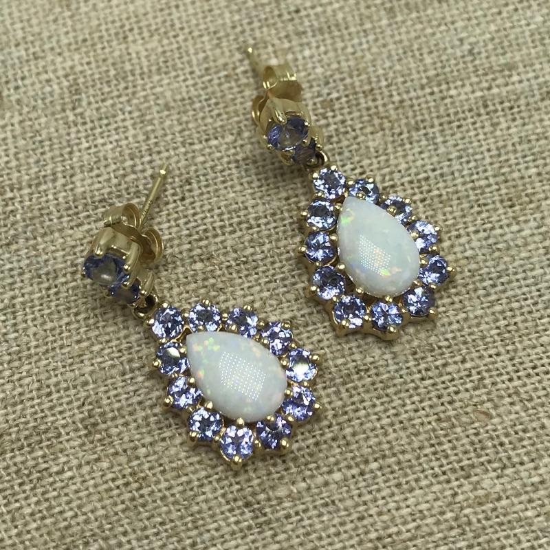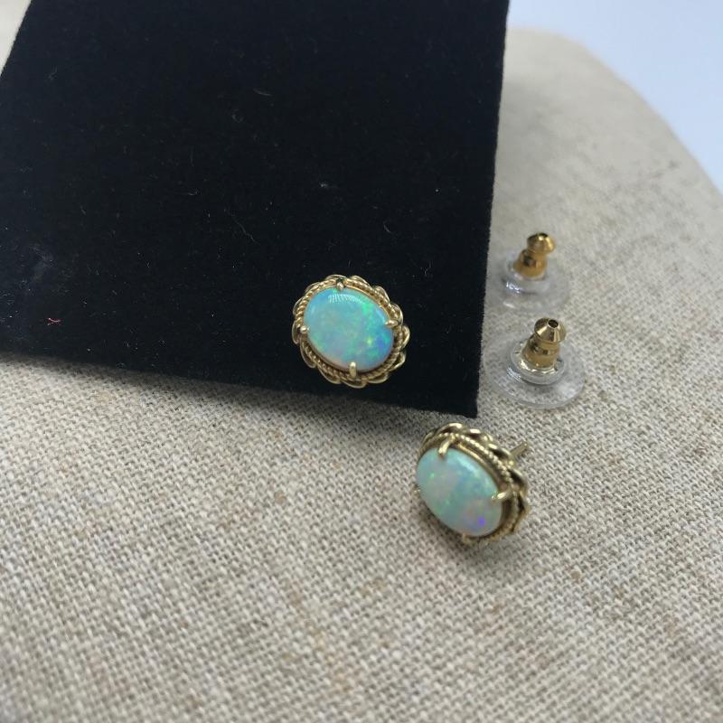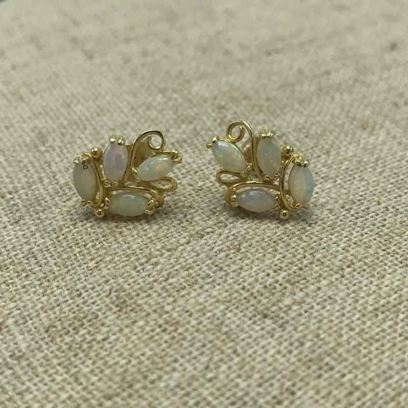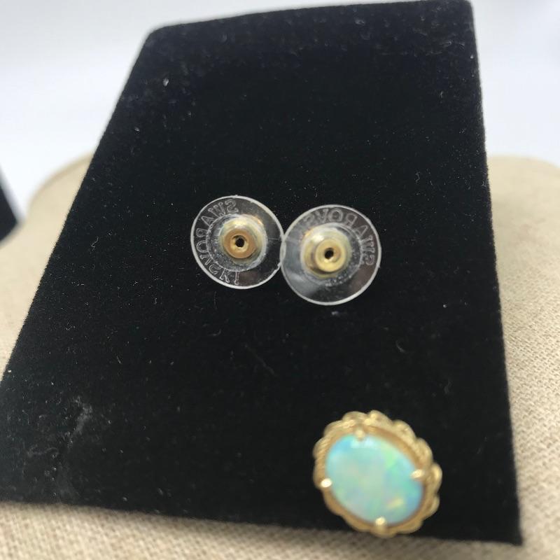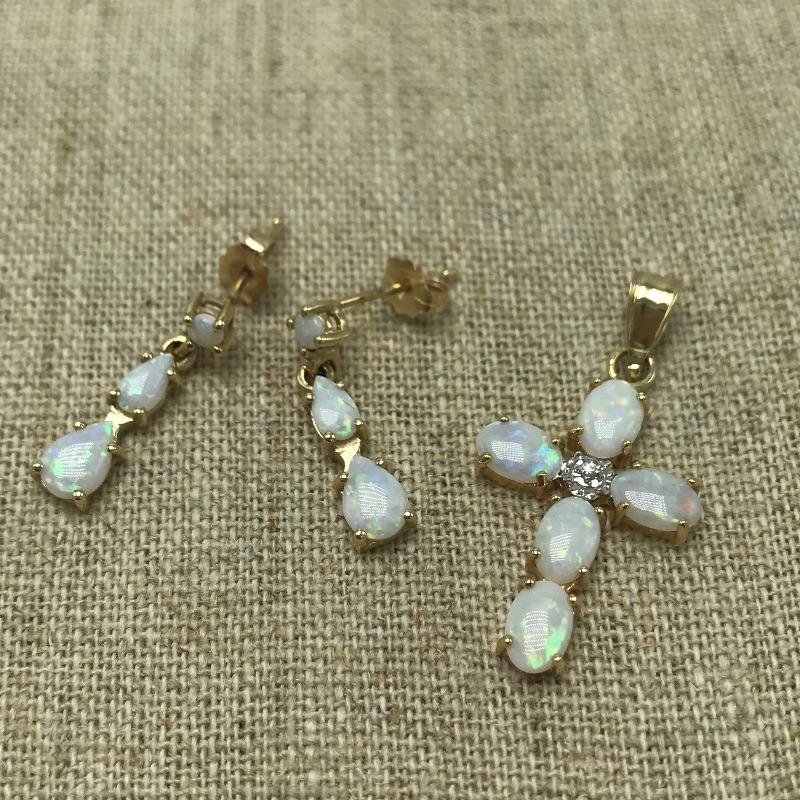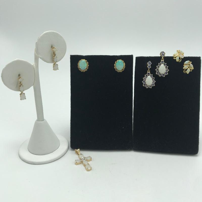Stunning iridescent sparkles throughout the lot. All appear like opals. One pair of earrings with s sea green hue have Swarovski backs and what appears to be 14K and the Swarovski swan on the back. The cross pendant also looks to have 14K on it. See photos.