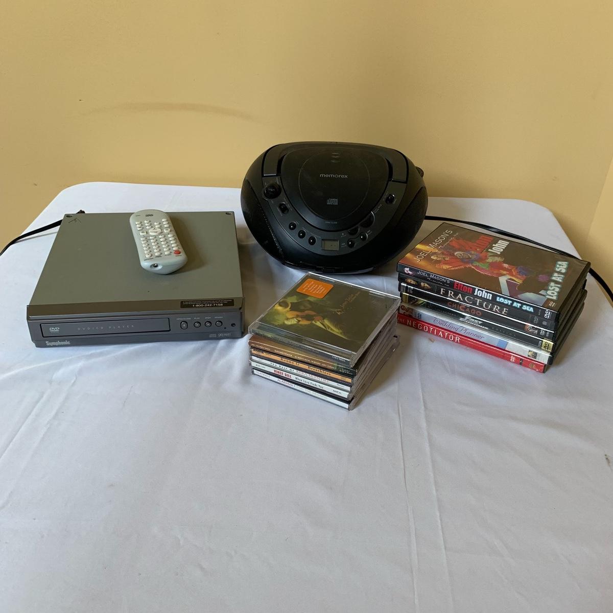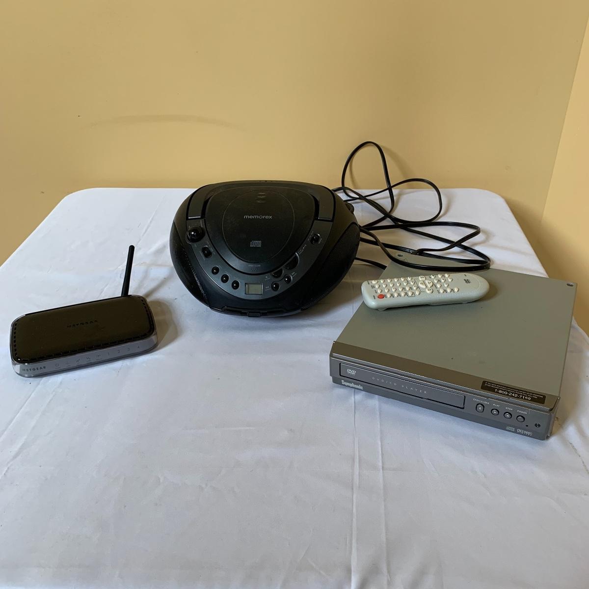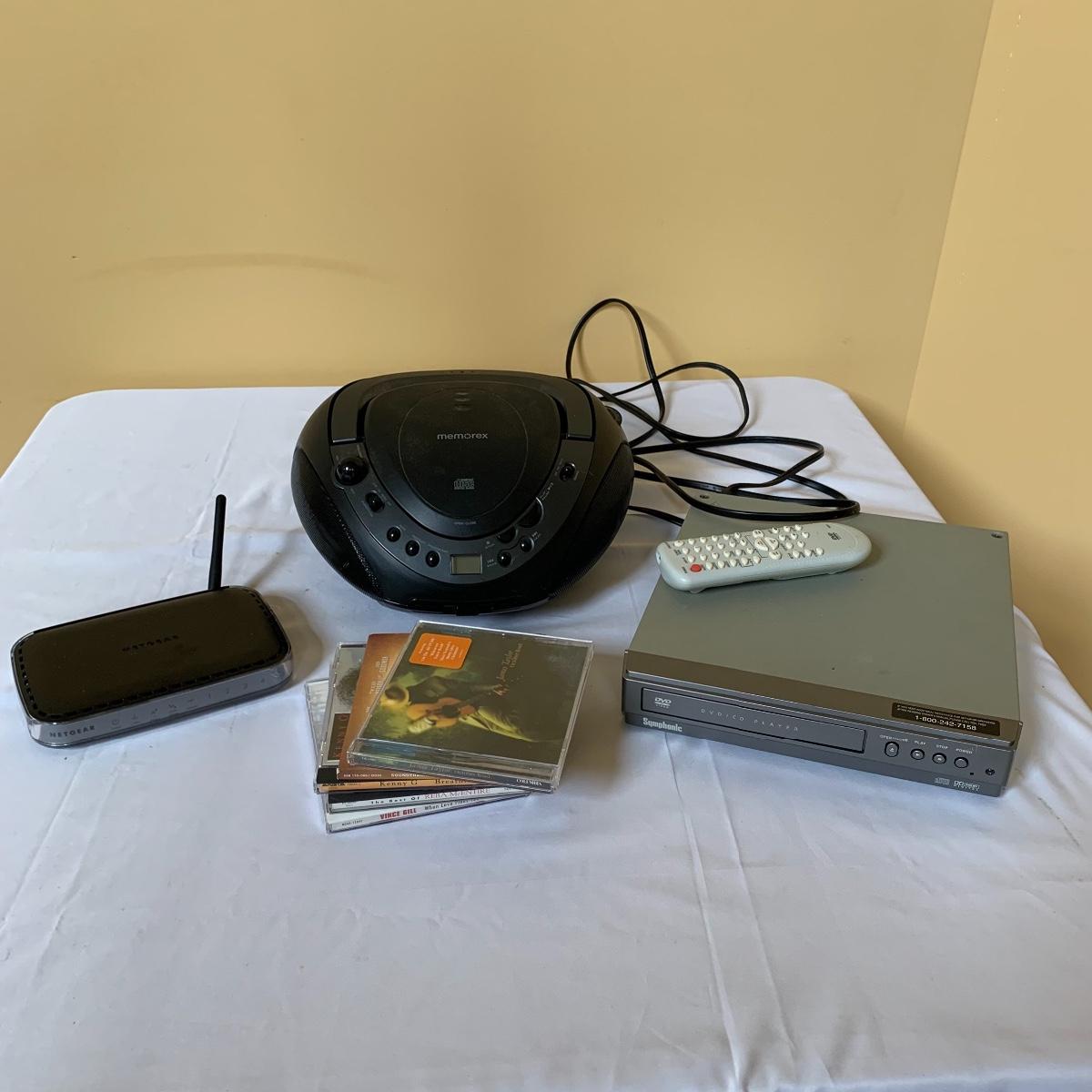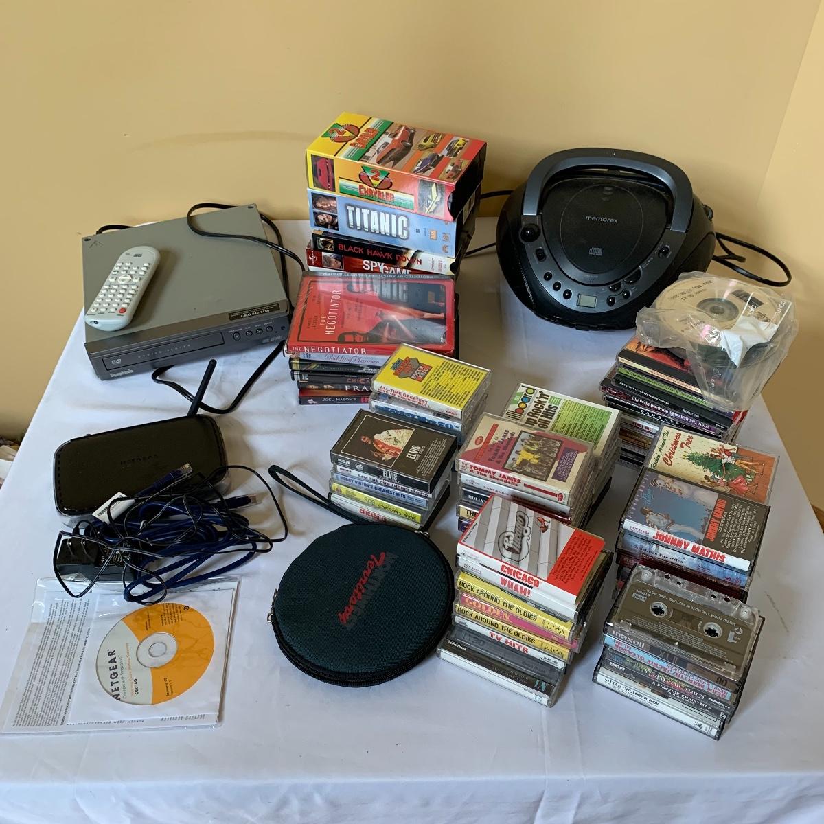Lot 219 - Symphonic DVD Player, Memorex Portable CD Boombox, Netgear Wireless Cable Modem Gateway, CDs, DVDs, VHS, & Cassettes