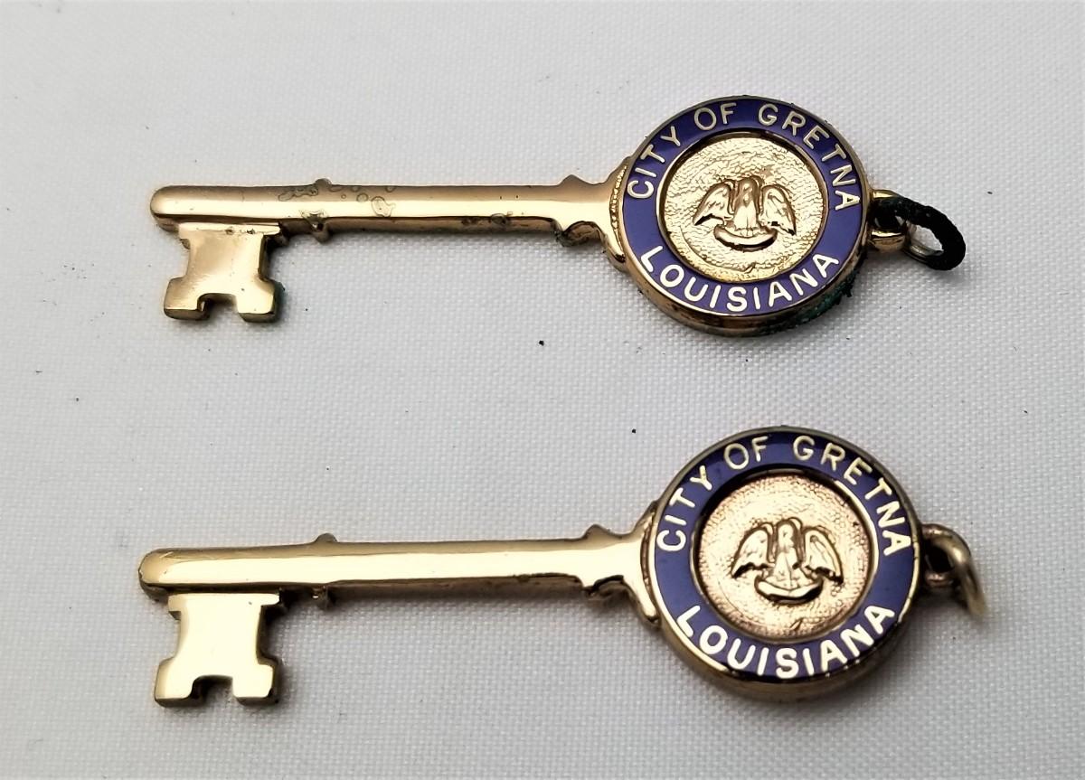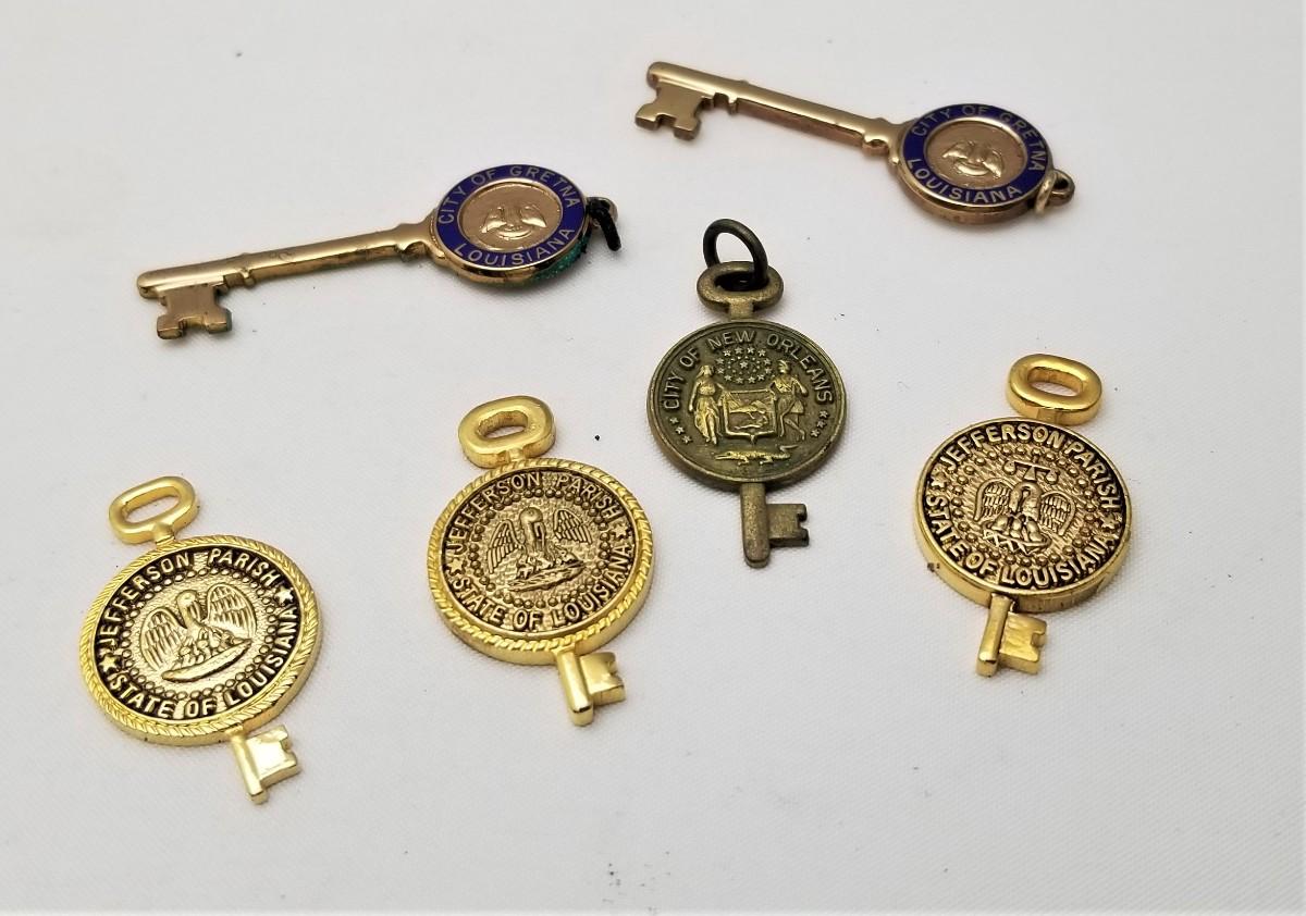 You get all you see here: 1 New Orleans Key to the City, 3 Jefferson Parish Key to the Parish, and 2 Gretna Key to the City. All come As Shown. For scale, Gretna keys are 1.5" long. All in vintage condition.