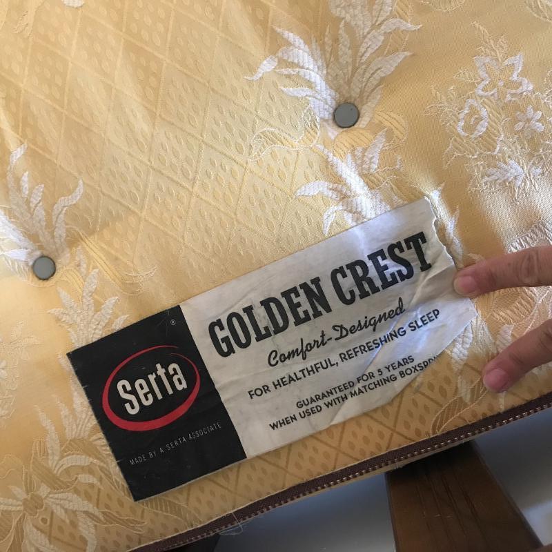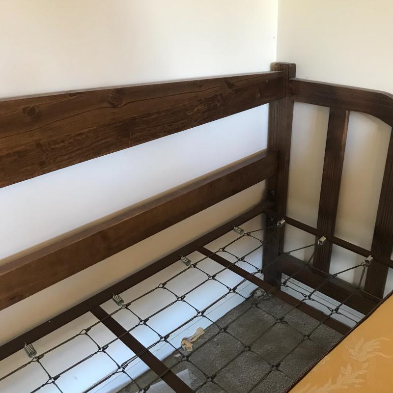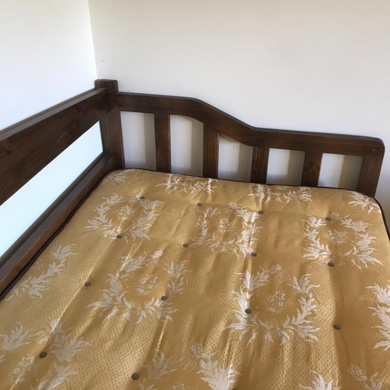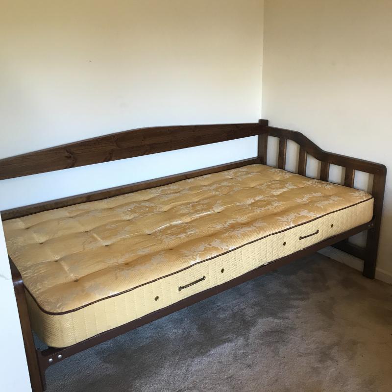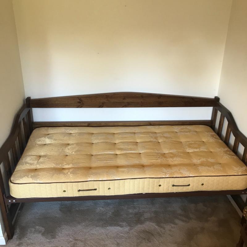 Dark wood stained day bed is perfect as a sofa with lots of pillows then as an extra bed when needed. Comes with Golden Crest Serta twin mattress for free to buyer. Spring bottom. Measures 79” x 40” x 36”h. No shipping.