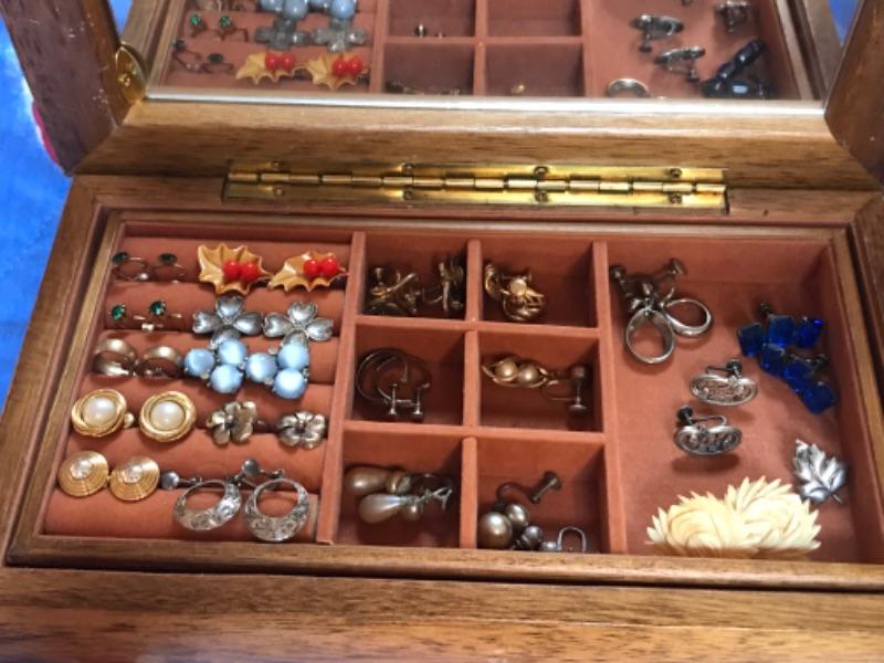 Jewelry box measures 11” long 6-1/2” wide and 3” deep and includes earrings pictured , some of these earrings are sterling silver