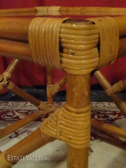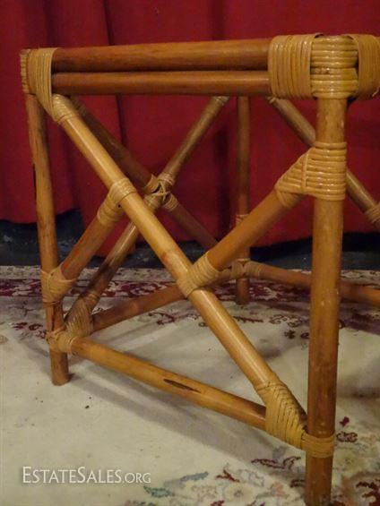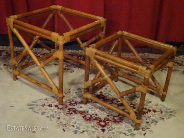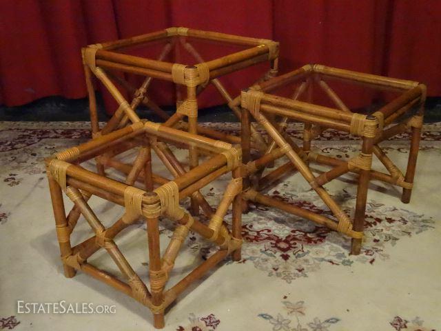 LOT 21A: 3 PC MID CENTURY STACKING TABLES, WOOD AND RATTAN WITH GLASS INSET TOPS, VERY GOOD CONDITION, LARGEST APPROX 18" X 18". SKU6147.01 H225
