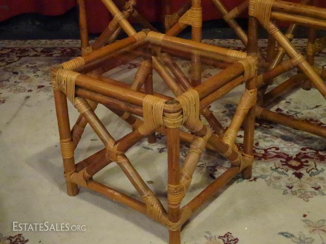 LOT 21A: 3 PC MID CENTURY STACKING TABLES, WOOD AND RATTAN
