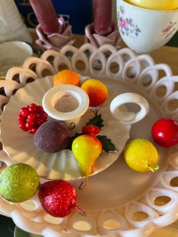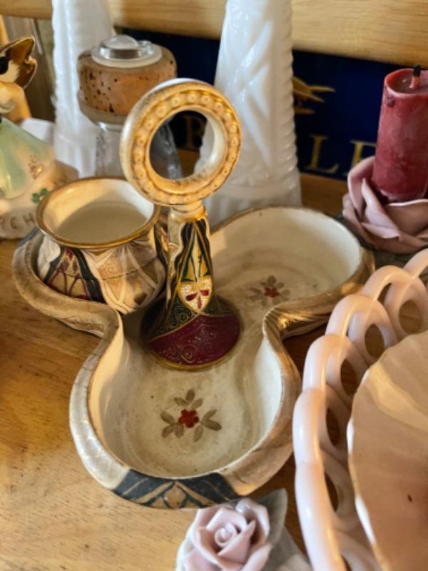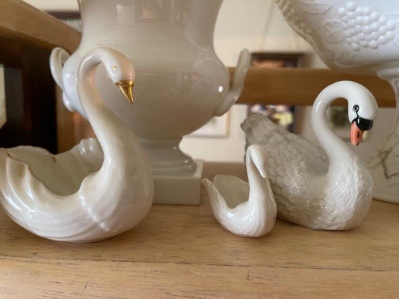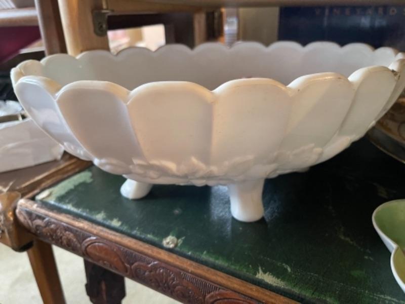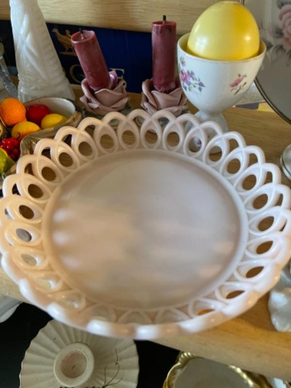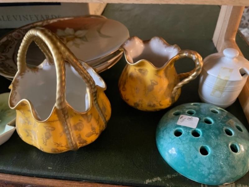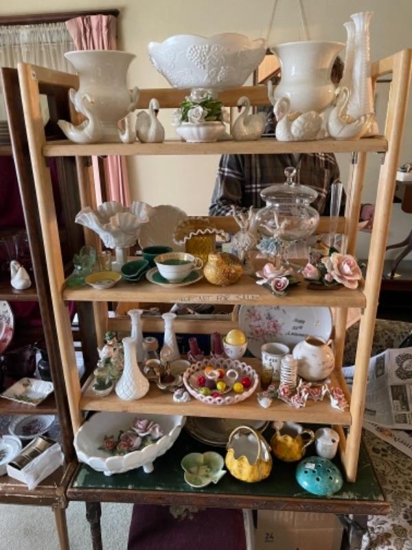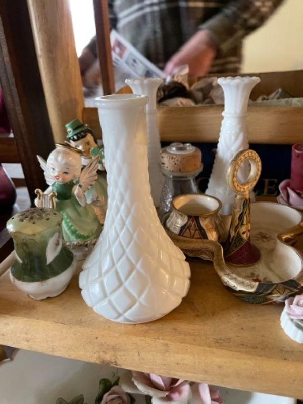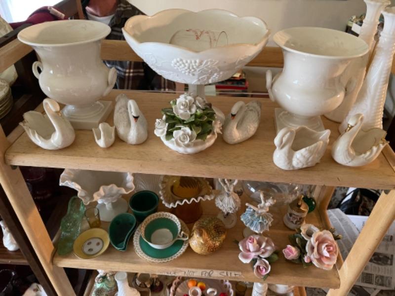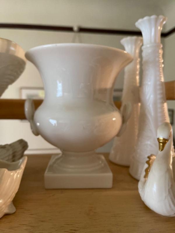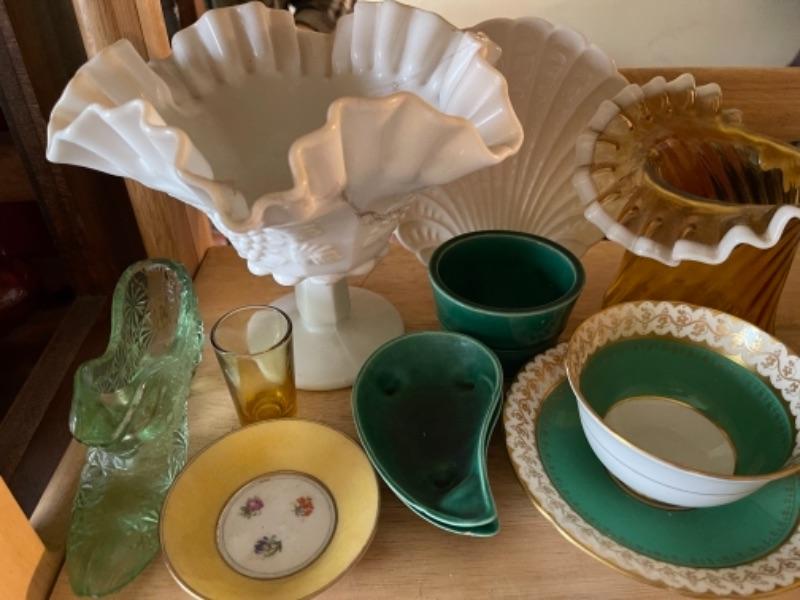 Lot 21L. Milk glass, paid of Lenox urns, ceramics, cups and saucers, yellow glass and bud vase--$95