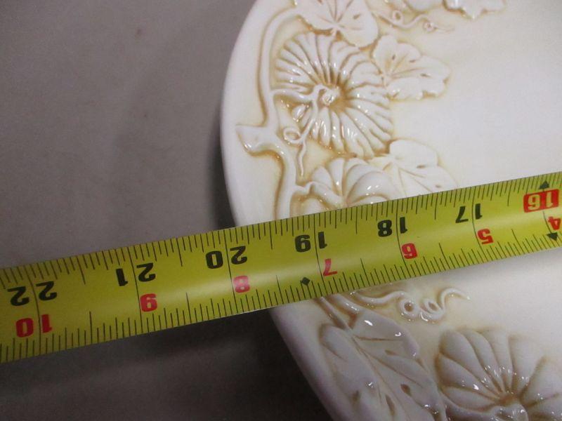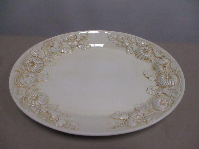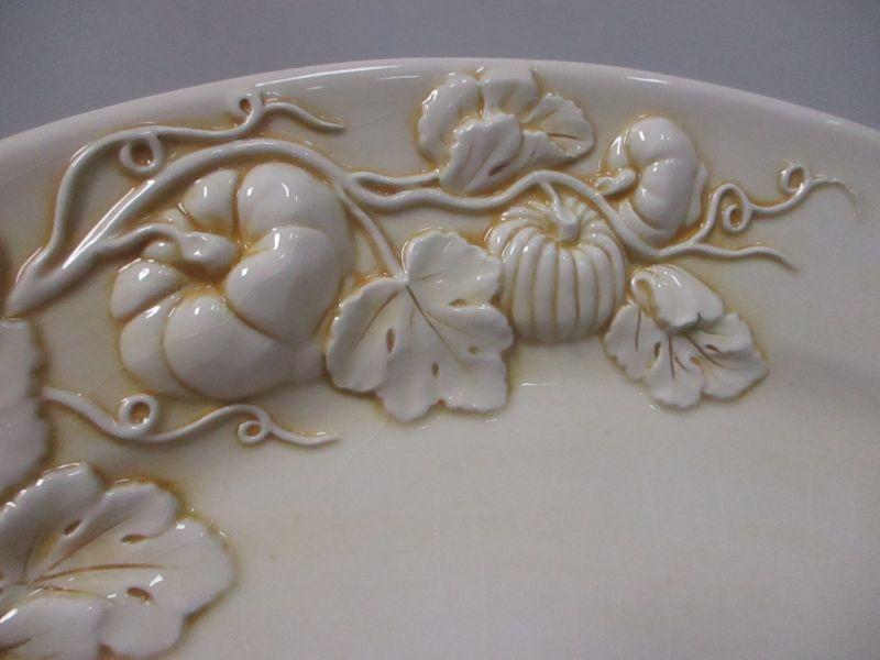 White to off-white ceramic platter with a pumpkins and vines raised pattern on the exterior.